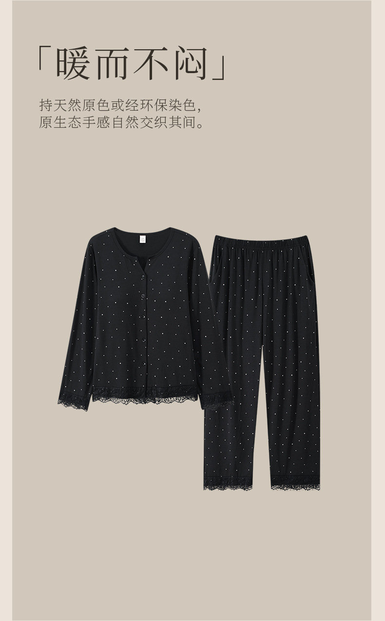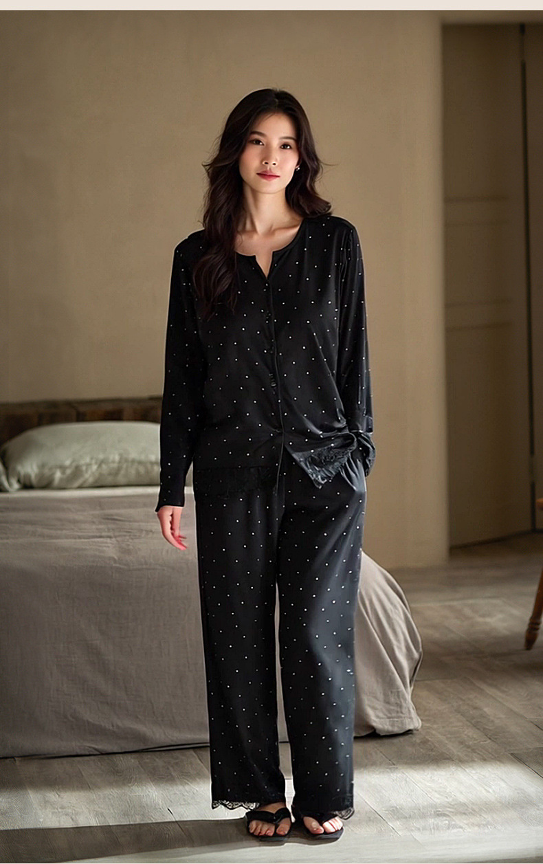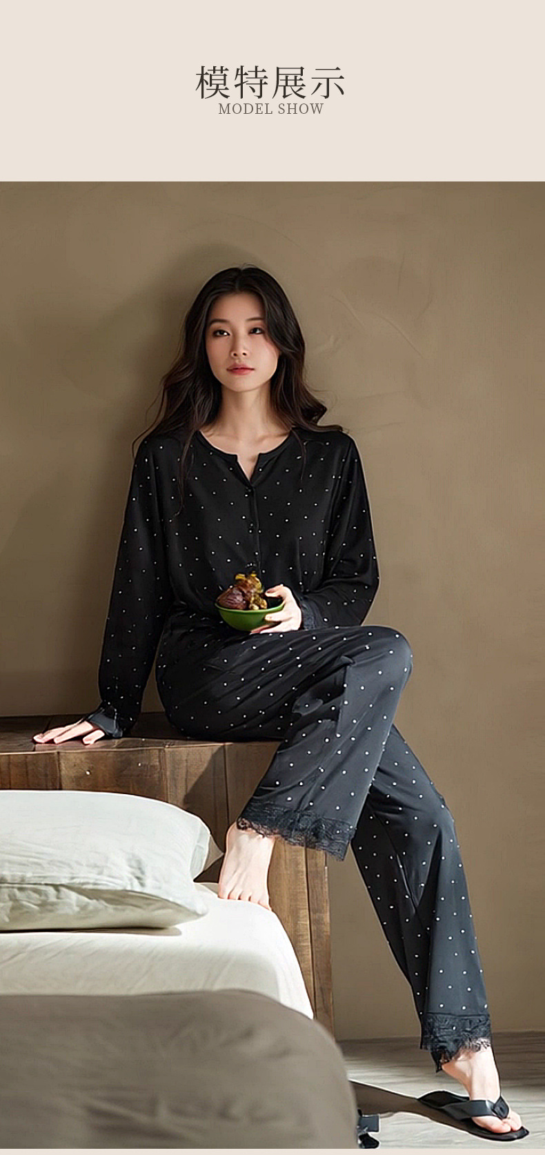 秋冬季女士睡衣波点蕾丝可外穿带胸垫长袖长裤甜美可爱家居服套装 商品图1