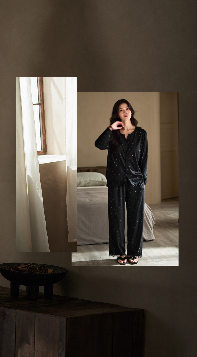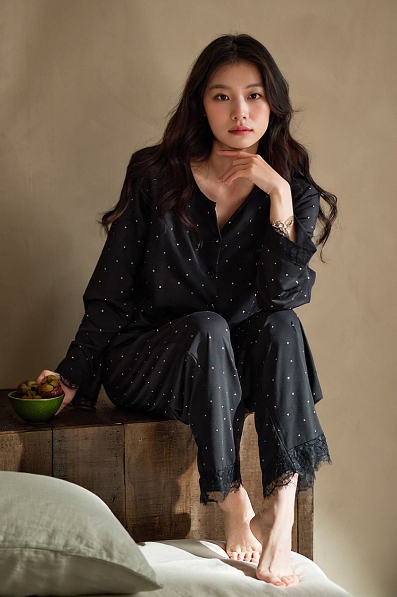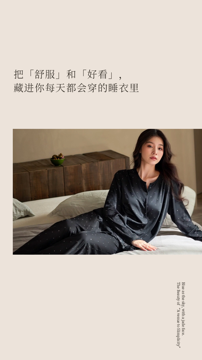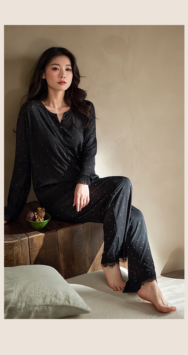 秋冬季女士睡衣波点蕾丝可外穿带胸垫长袖长裤甜美可爱家居服套装 商品图1