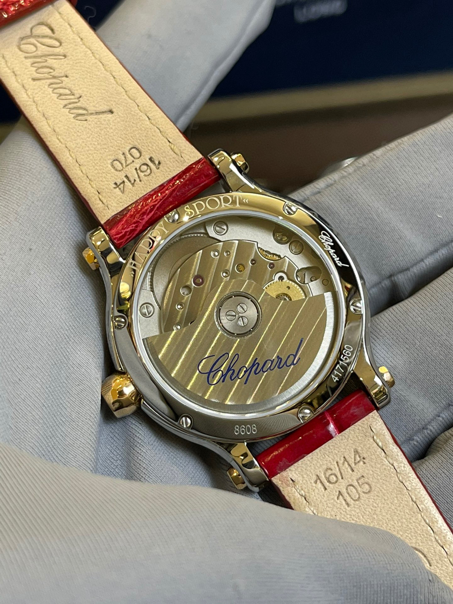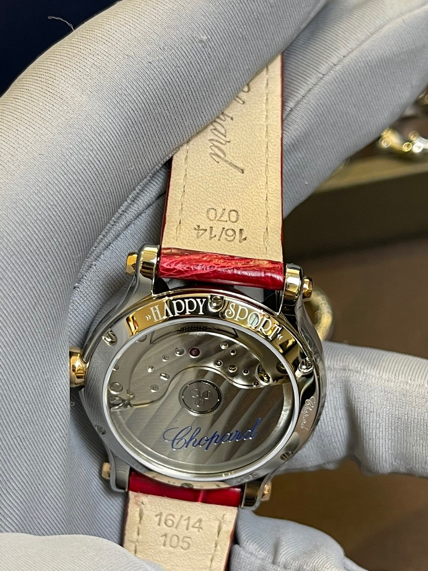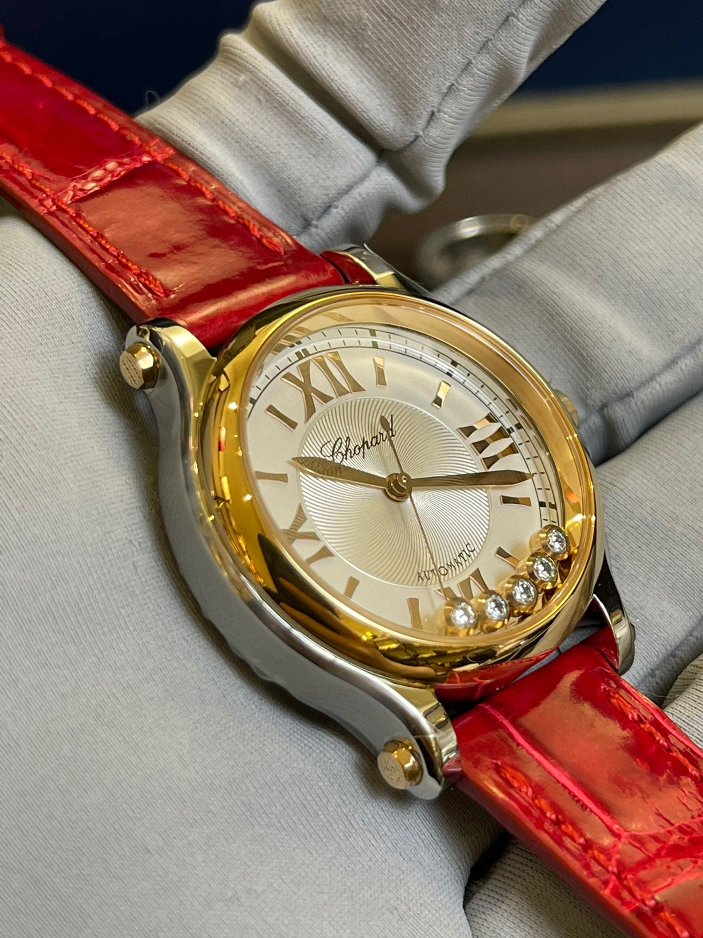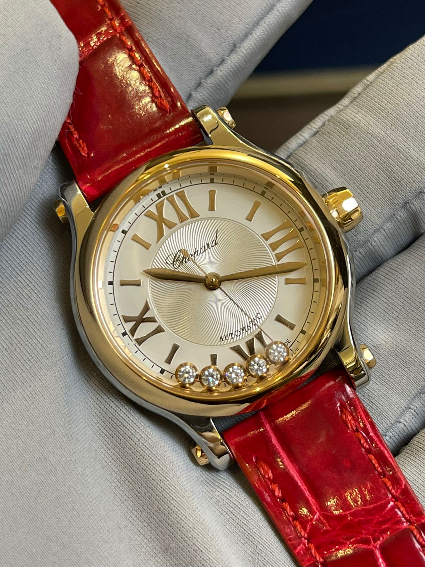 完美体现萧邦对休闲风格的诠释!其标志性的活动钻石欢快舞动、流光溢彩。搭配顶级鳄鱼皮表带!