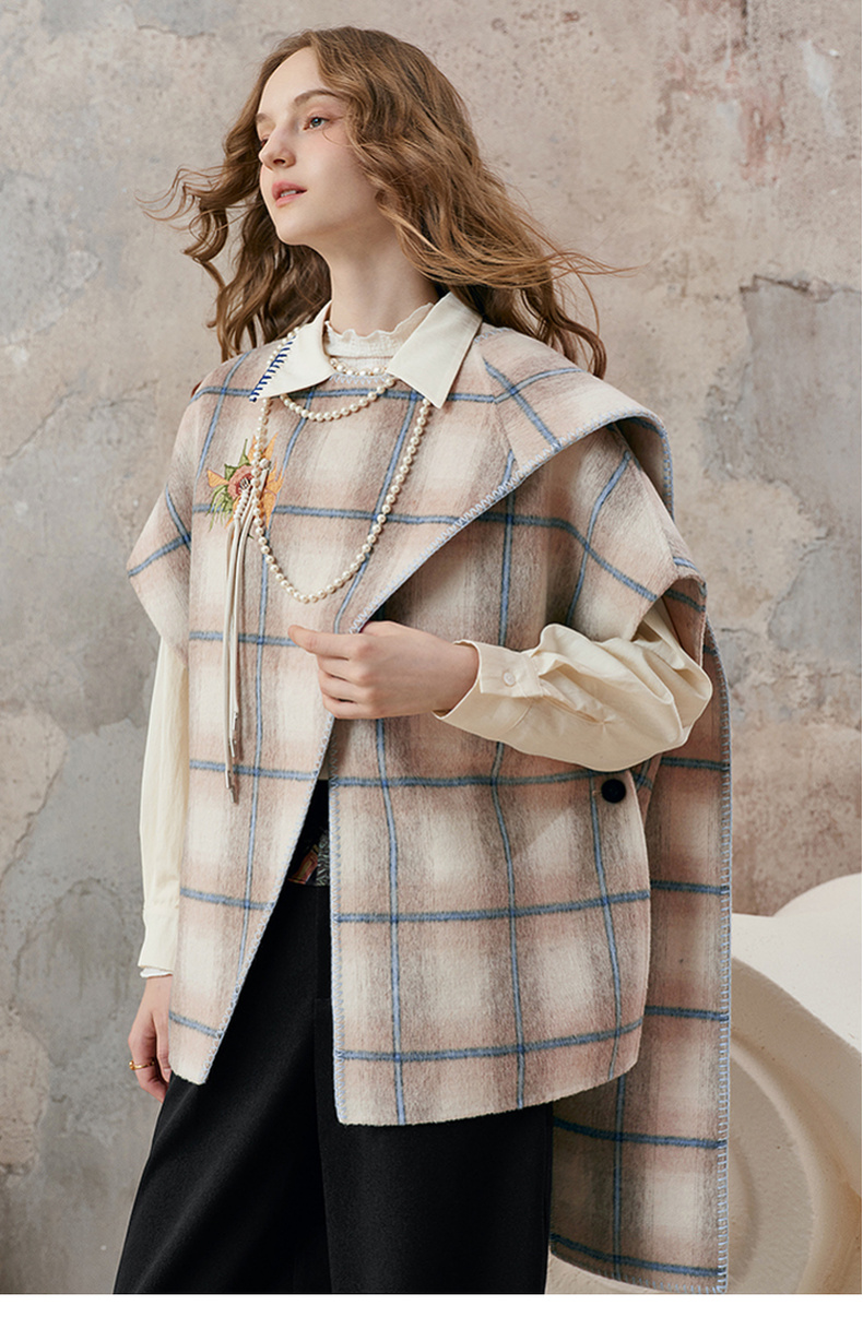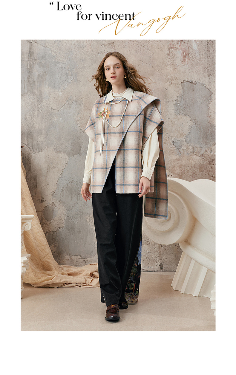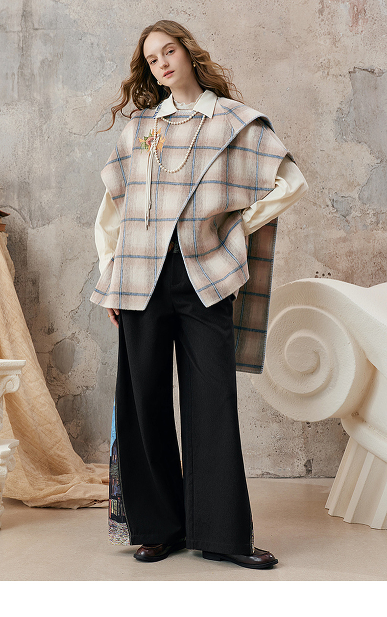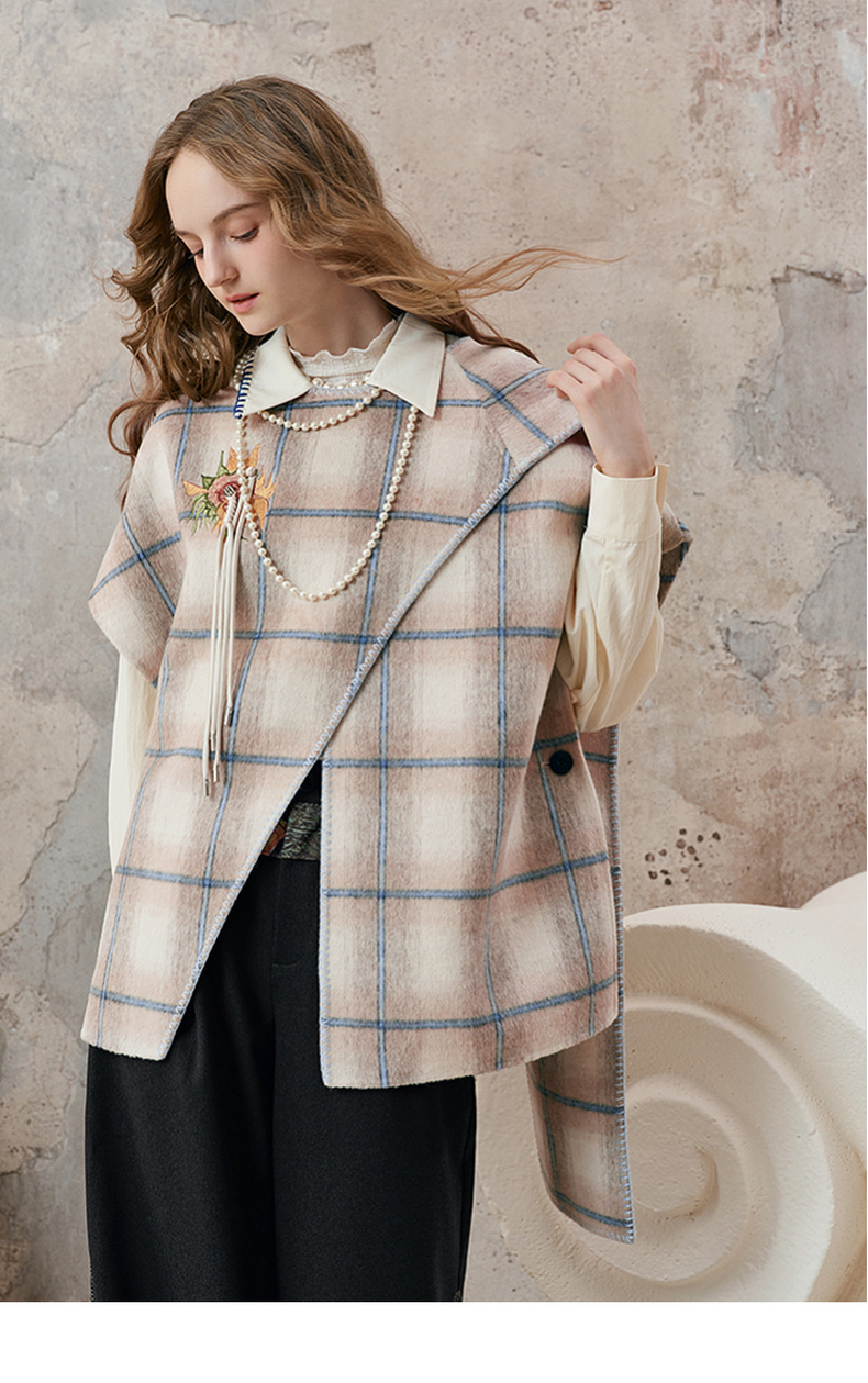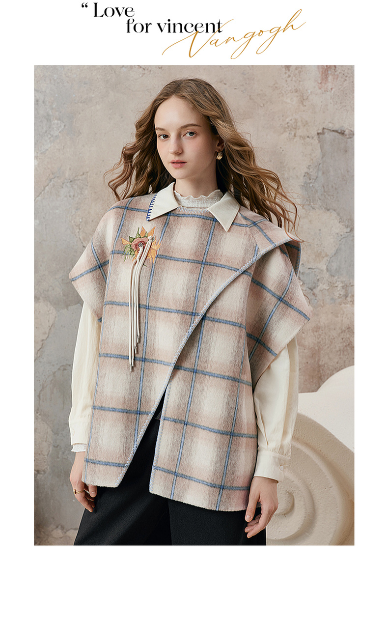 【暖冬内购】两三事梵高文艺永夜微光2025秋冬新款向日葵绣花格子双面呢外套女