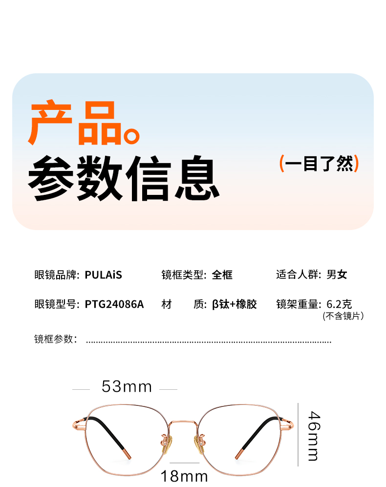 普莱斯光学镜框PTG24086A β钛+橡胶材质镜框 上脸高级 显白显脸瘦 男女同款 五色可选