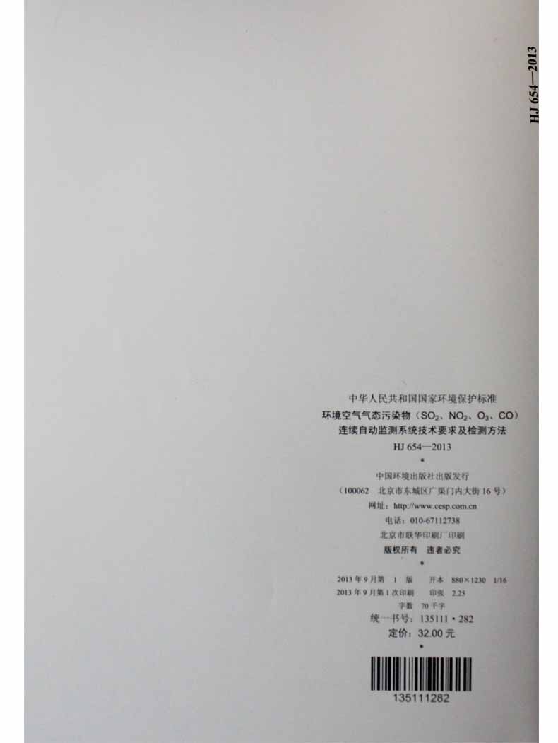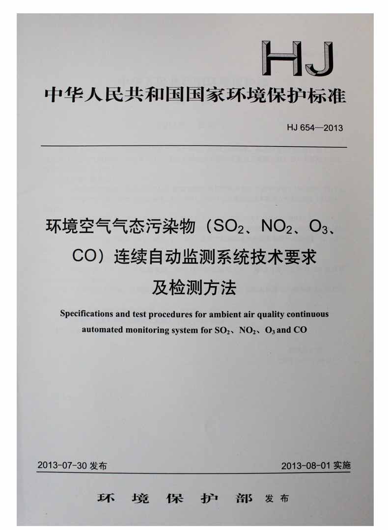 HJ 654-2013 环境空气气态污染物(SO2、NO2、O3、CO)连续自动监测系统技术要求及检测方法
