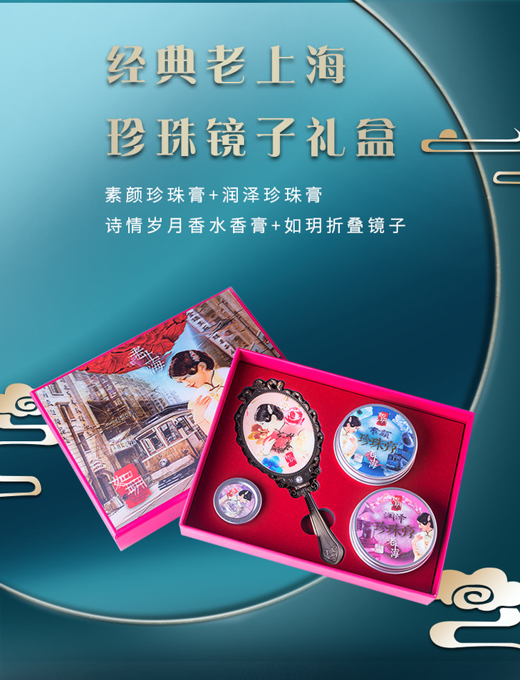 如玥老上海国货素颜霜珍珠膏香膏化妆镜礼盒套组套装