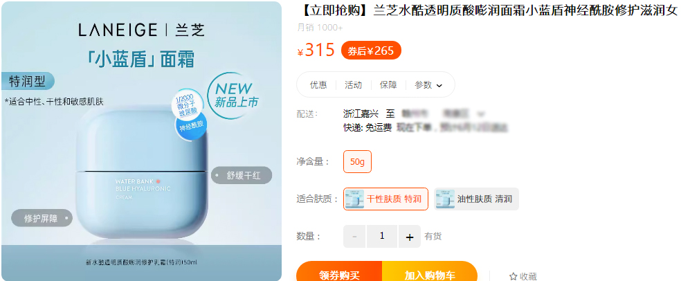 【商品名称】兰芝新水酷高保湿乳霜50ml 特润补水滋润