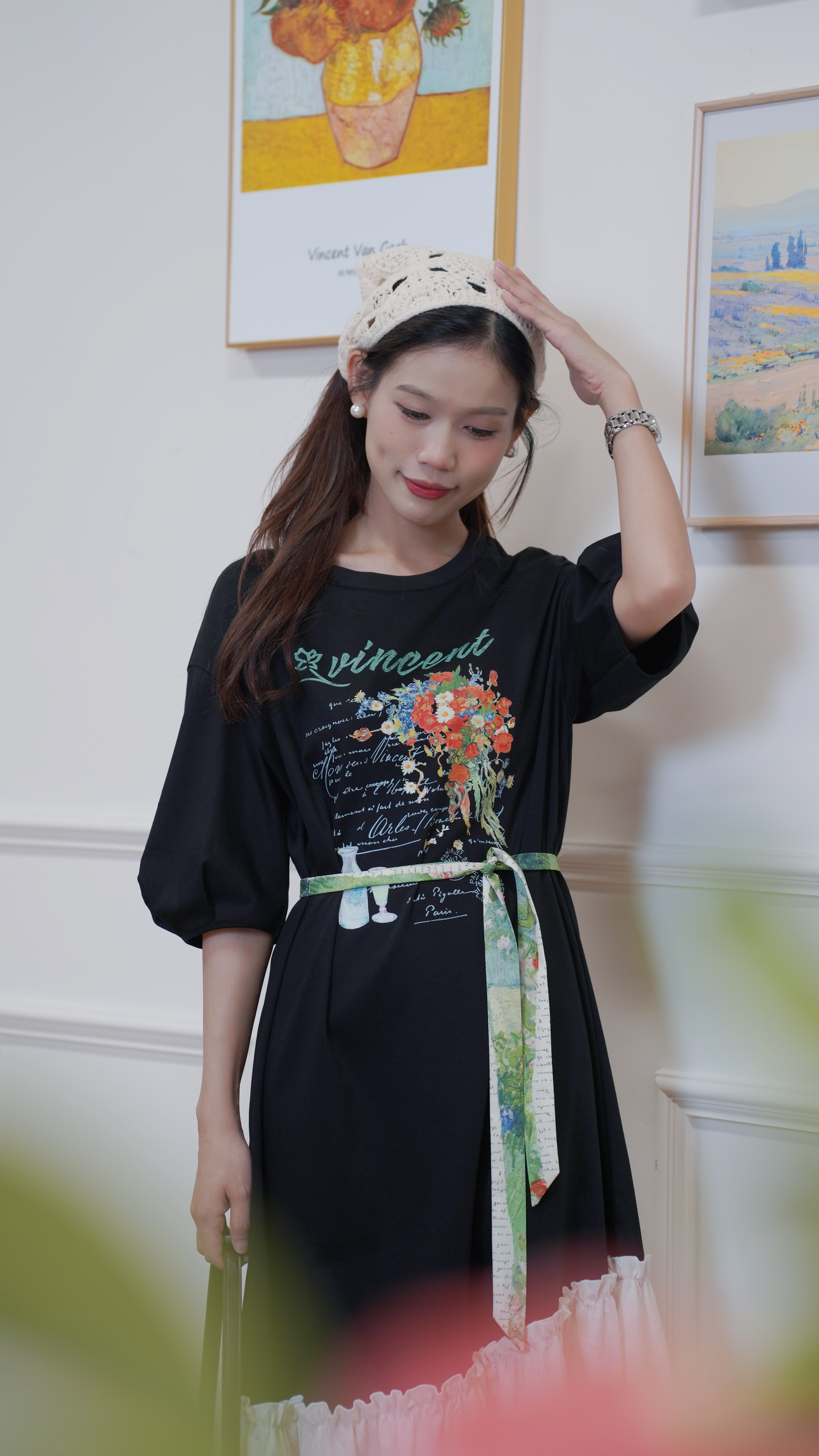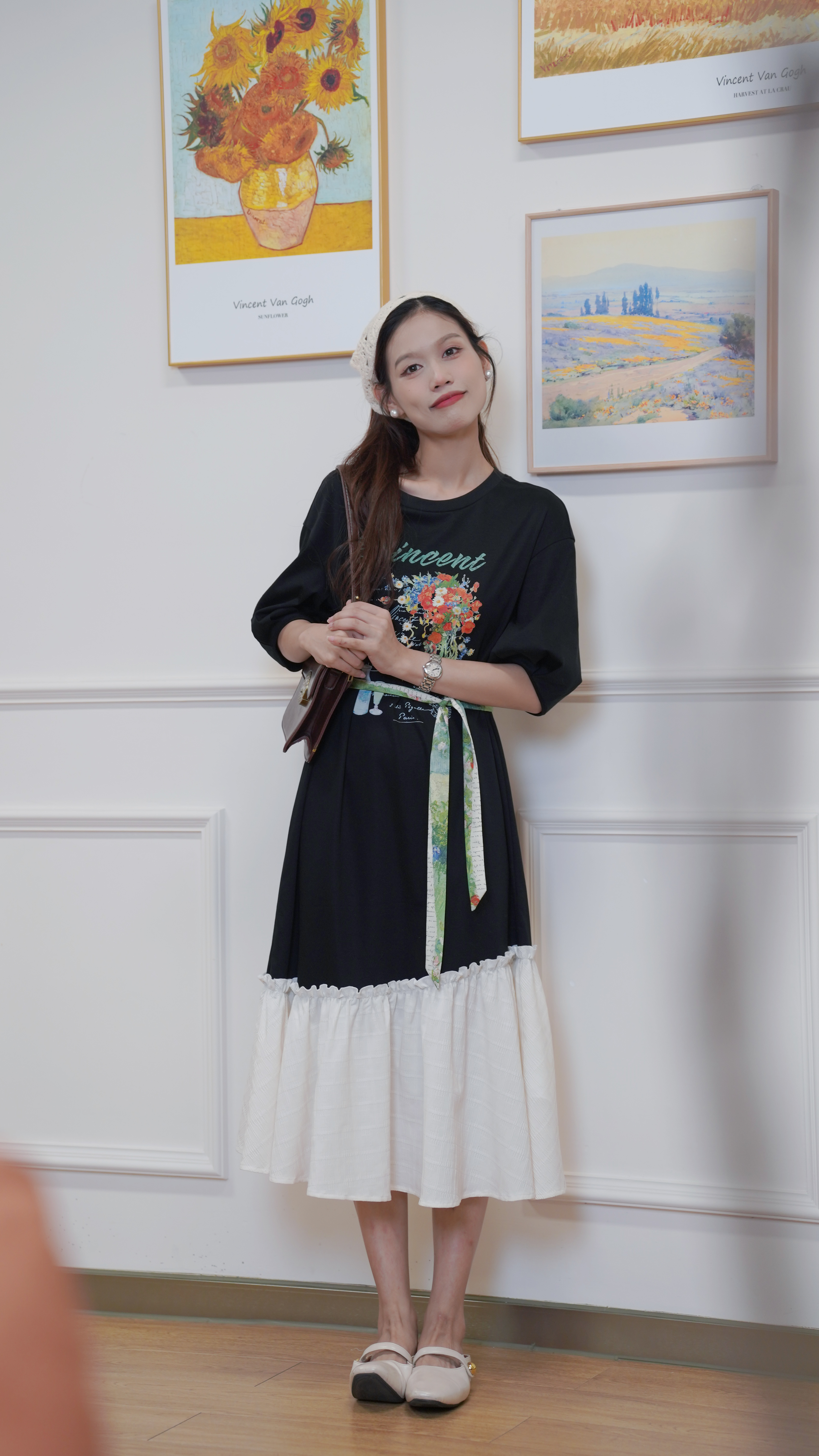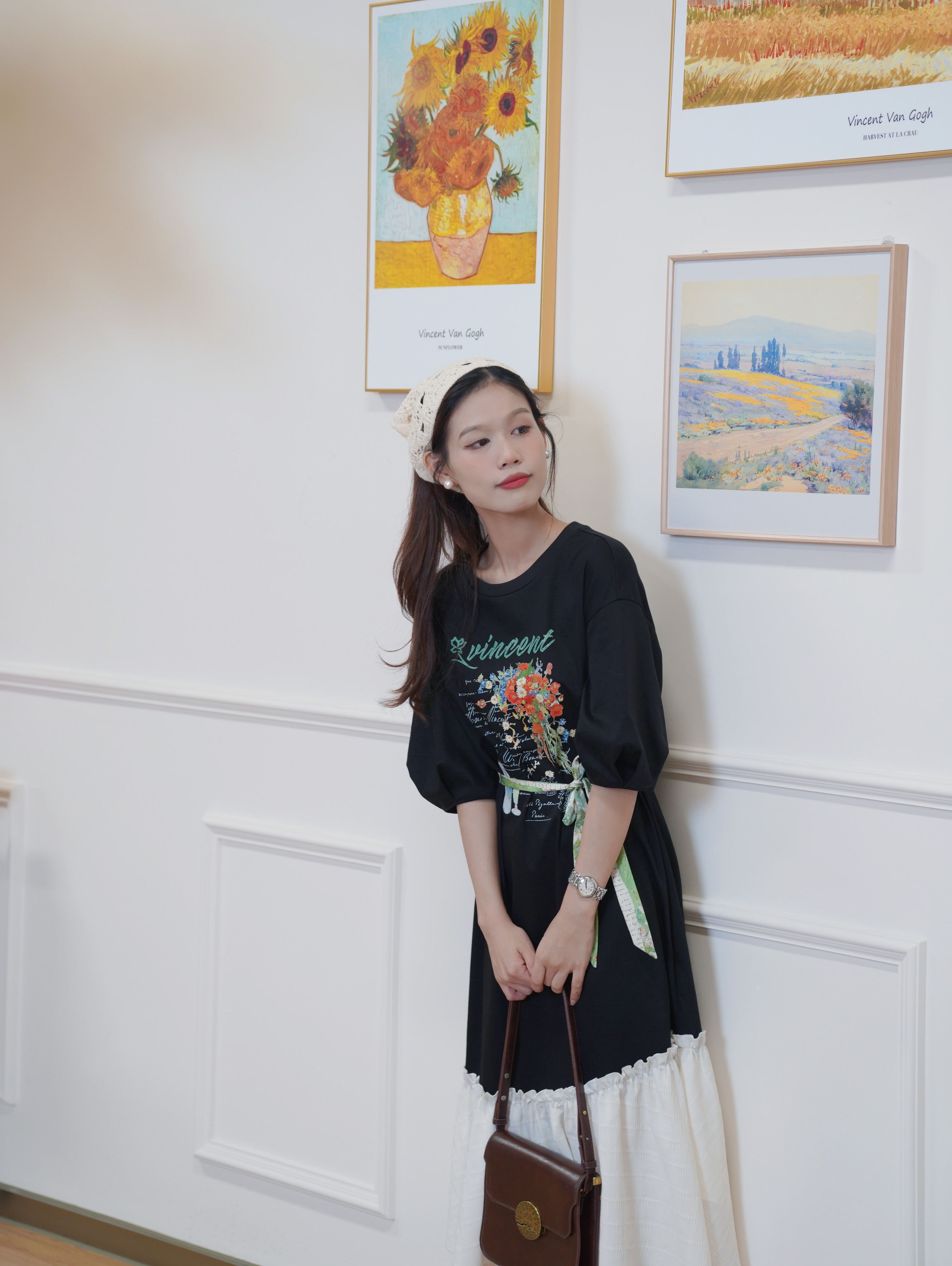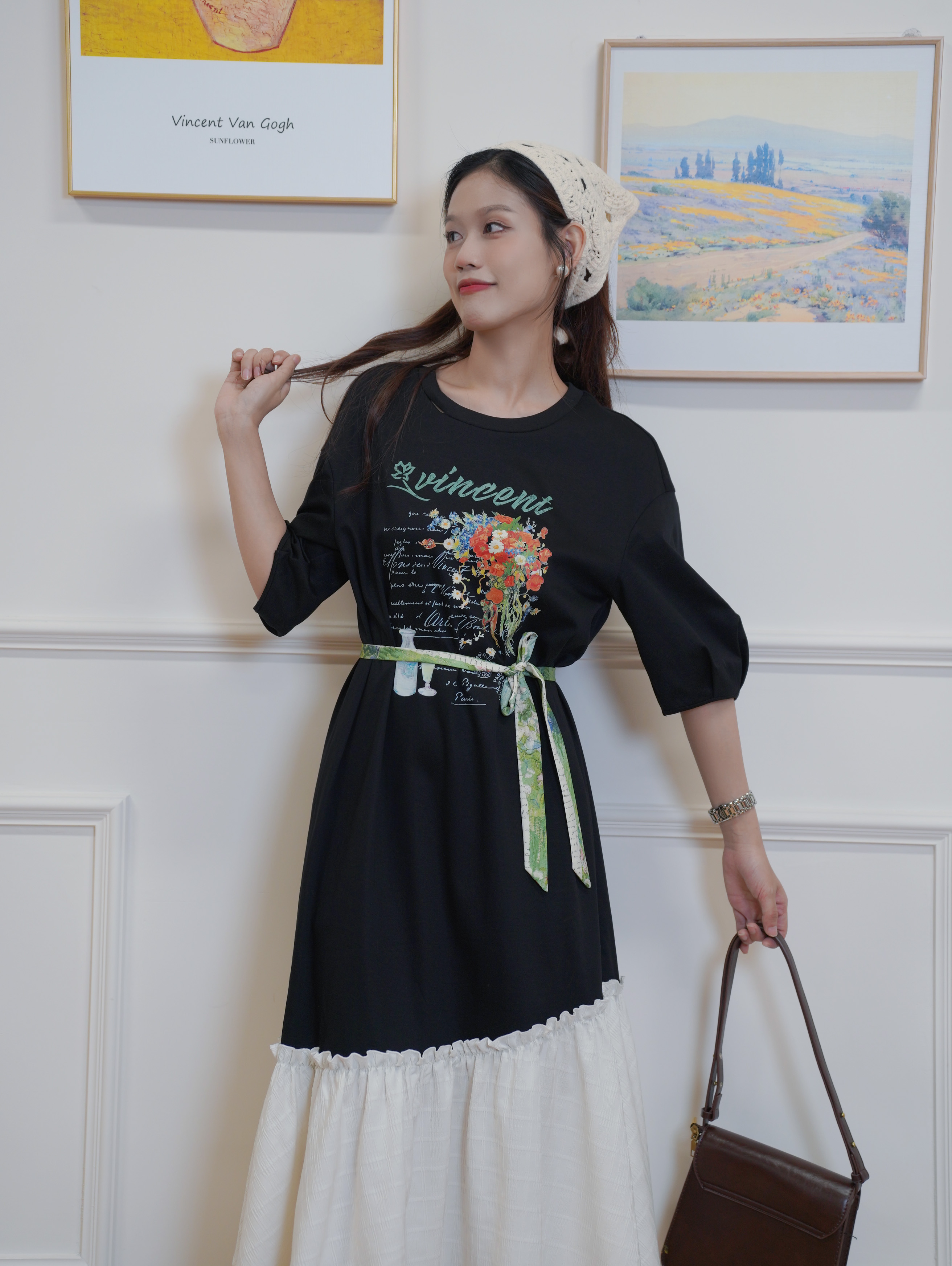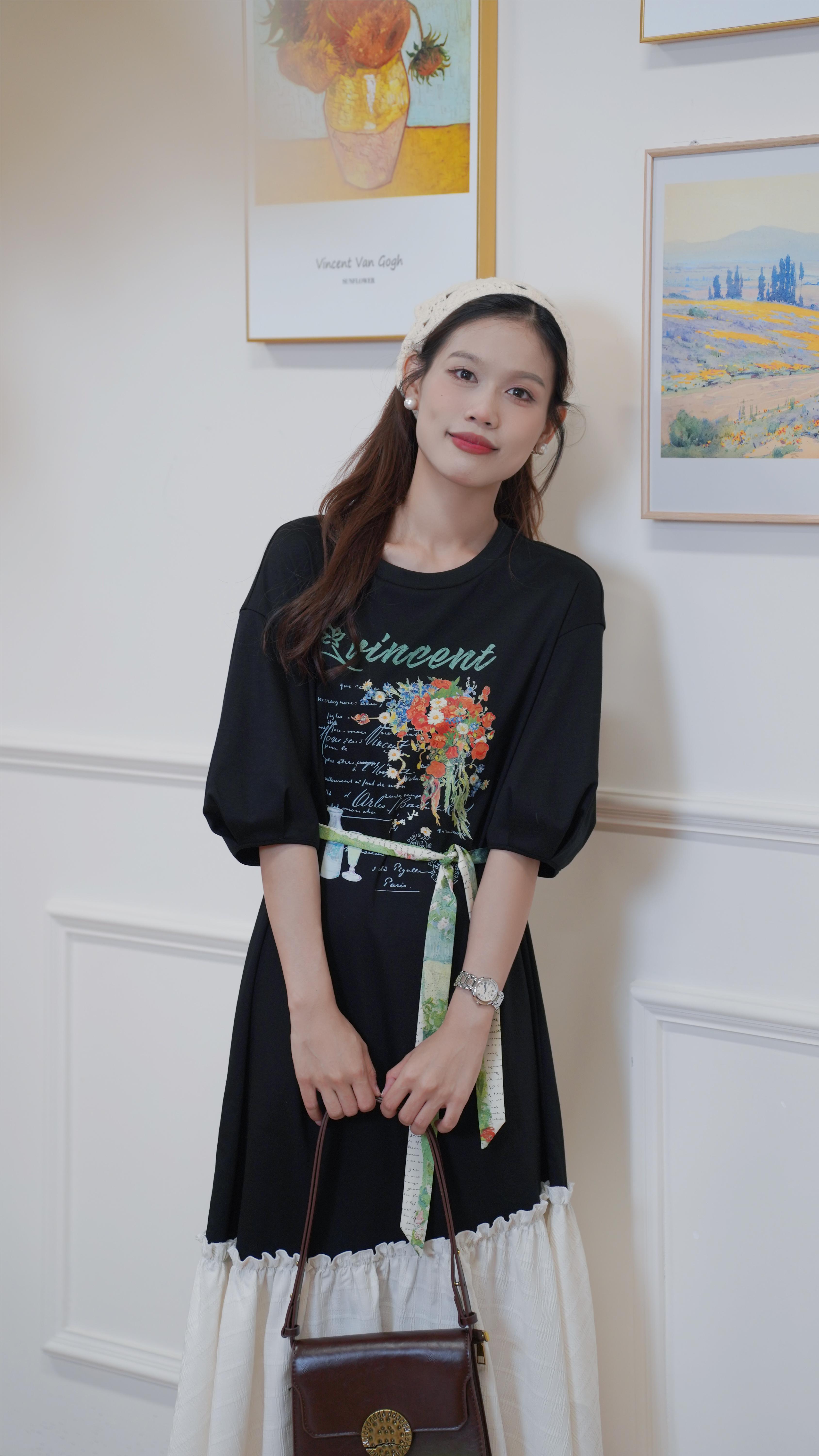 两三事一路繁花莫奈花园风宽松百搭休闲黑色复古圆领印花连衣裙