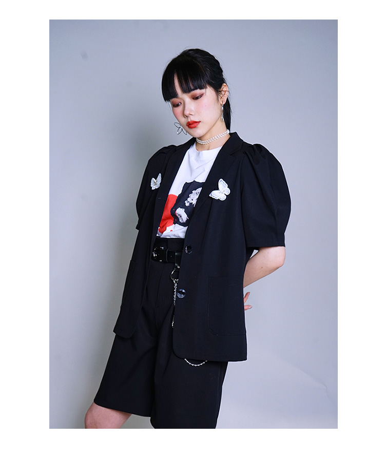 SunsetPark原创设计白色百褶半身裙女夏白色镂空爱心短袖西装套装