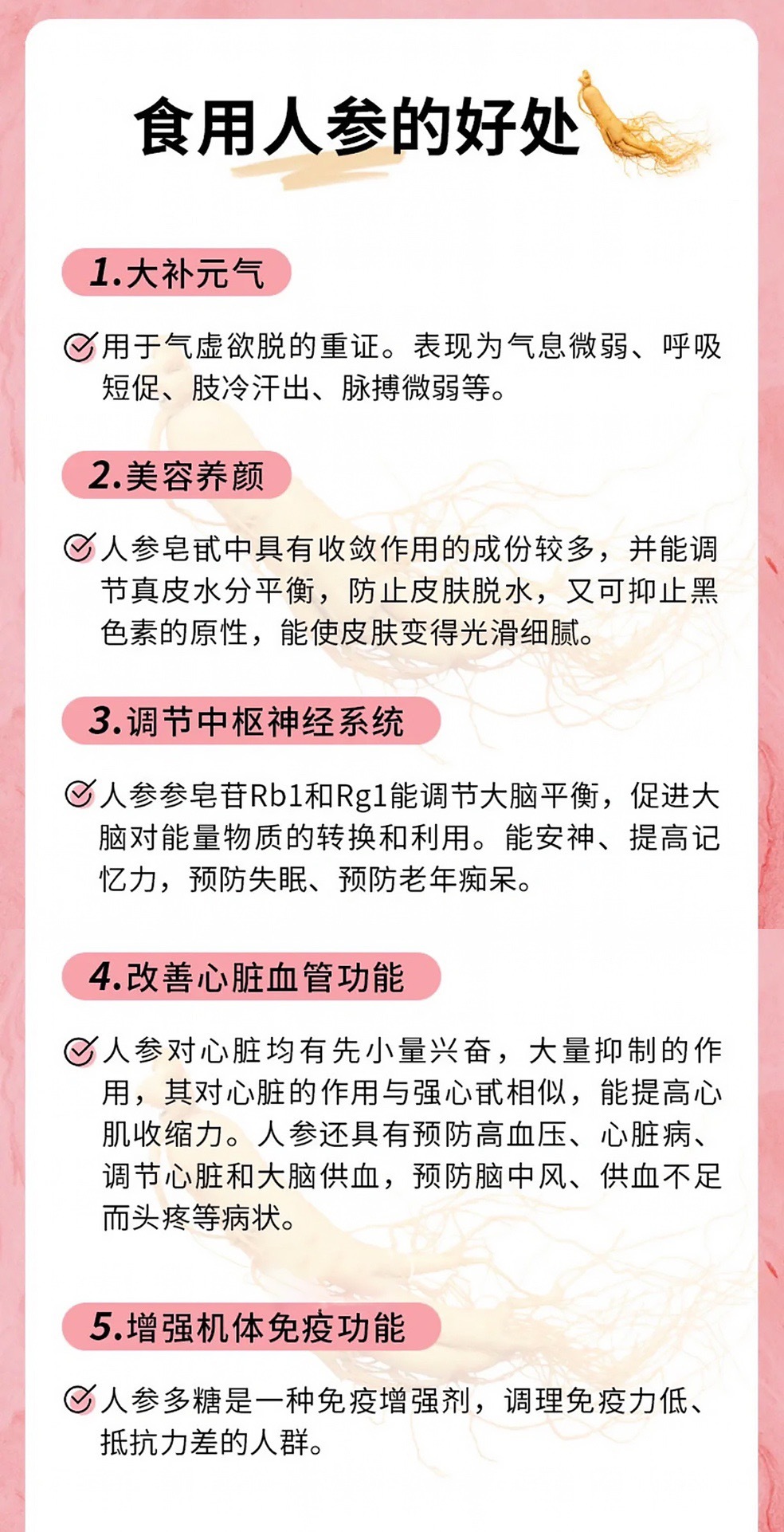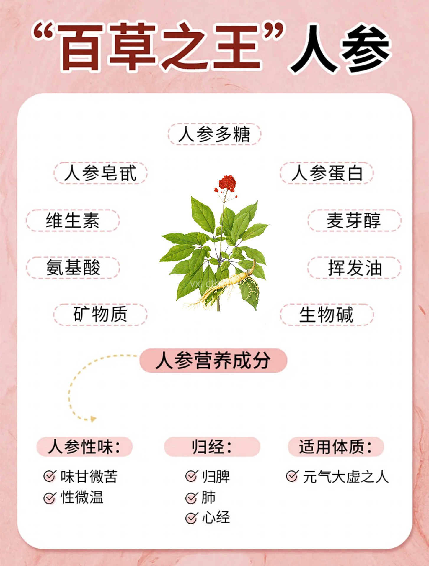 人参富含32种人参皂苷和酸性多糖、蛋白质、维生素、氨基酸等有效成分‼️能增强免疫力,缓解疲劳,抗衰老作用极强❗️
