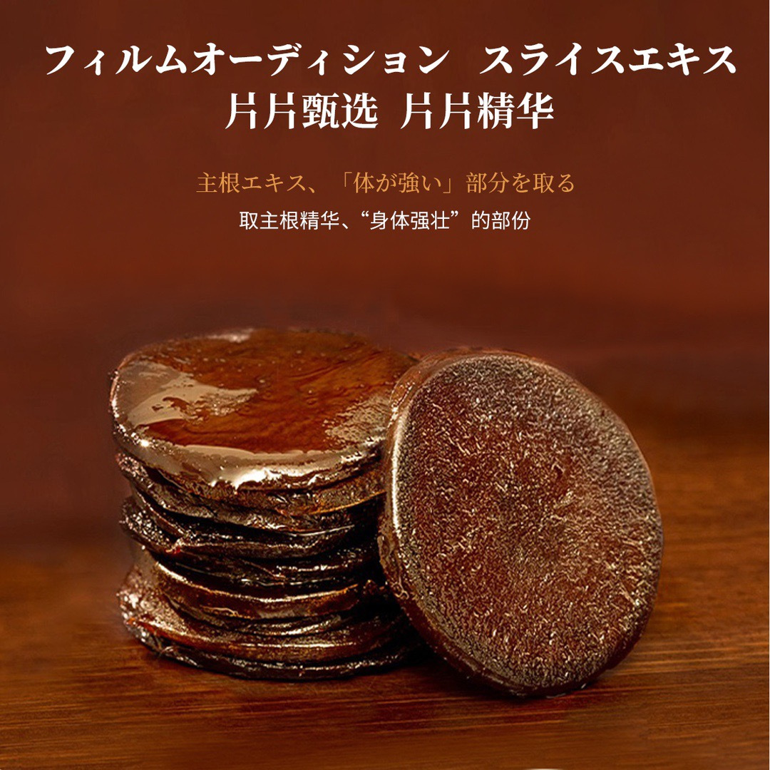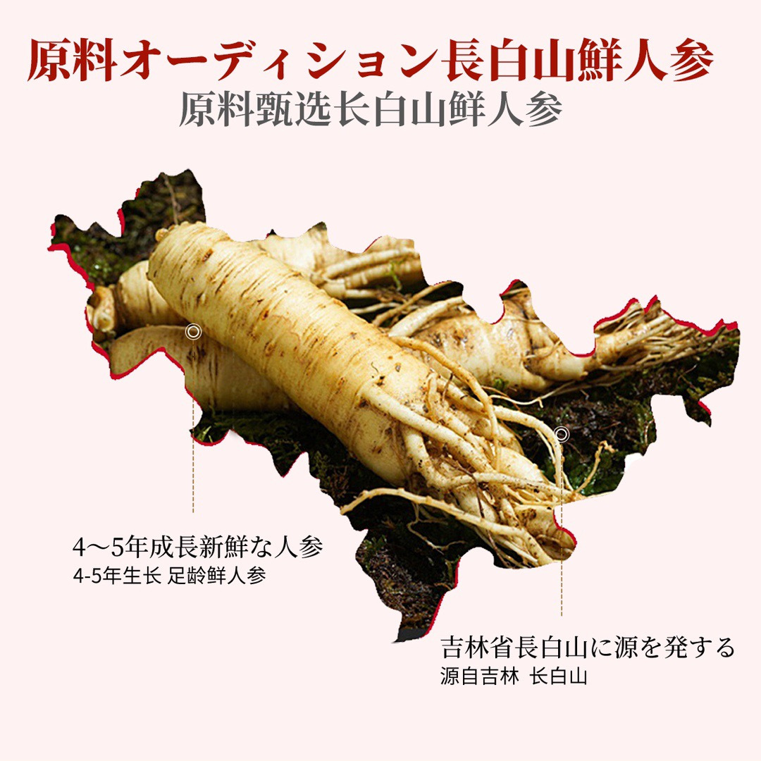 只选用长白山4-5年足龄鲜人参,且每支只选最优部分提取5片,配以云南贡蜜和阿胶,经过16道独家工艺,浸泡3个月以上,有效成分互相融合,每一片都是色泽饱满,韧性十足、参味浓郁,甜而不腻。