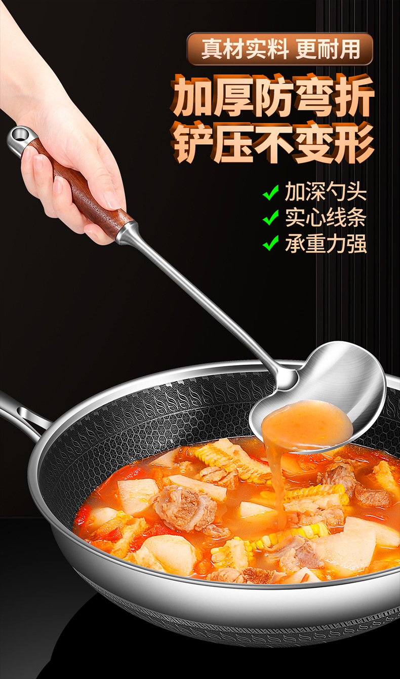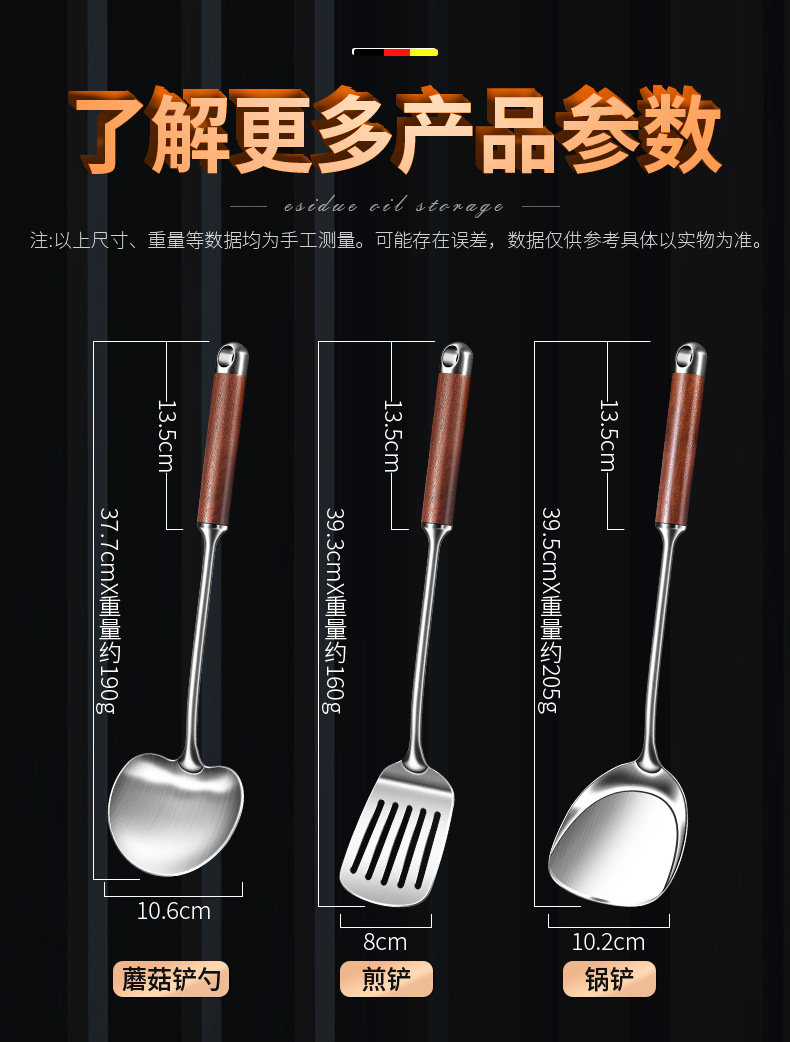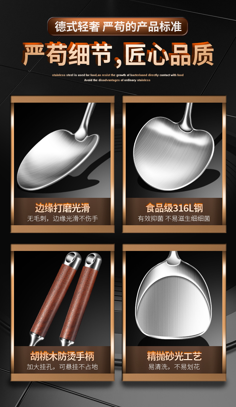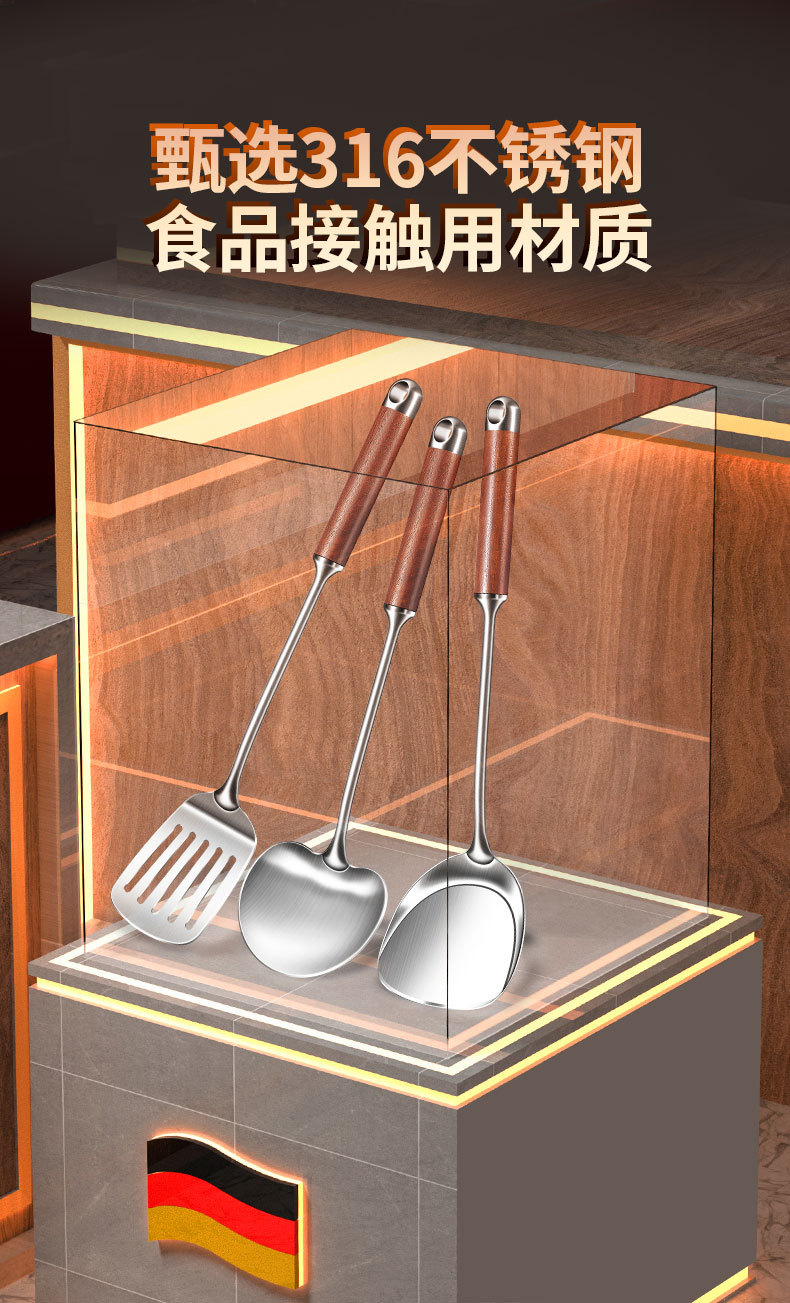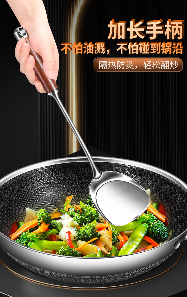 【跨境出口德国316不锈钢蘑菇铲】316L不锈钢蘑菇铲实木防烫炒铲厨房加长锅铲家用烹饪汤勺加厚煎铲
