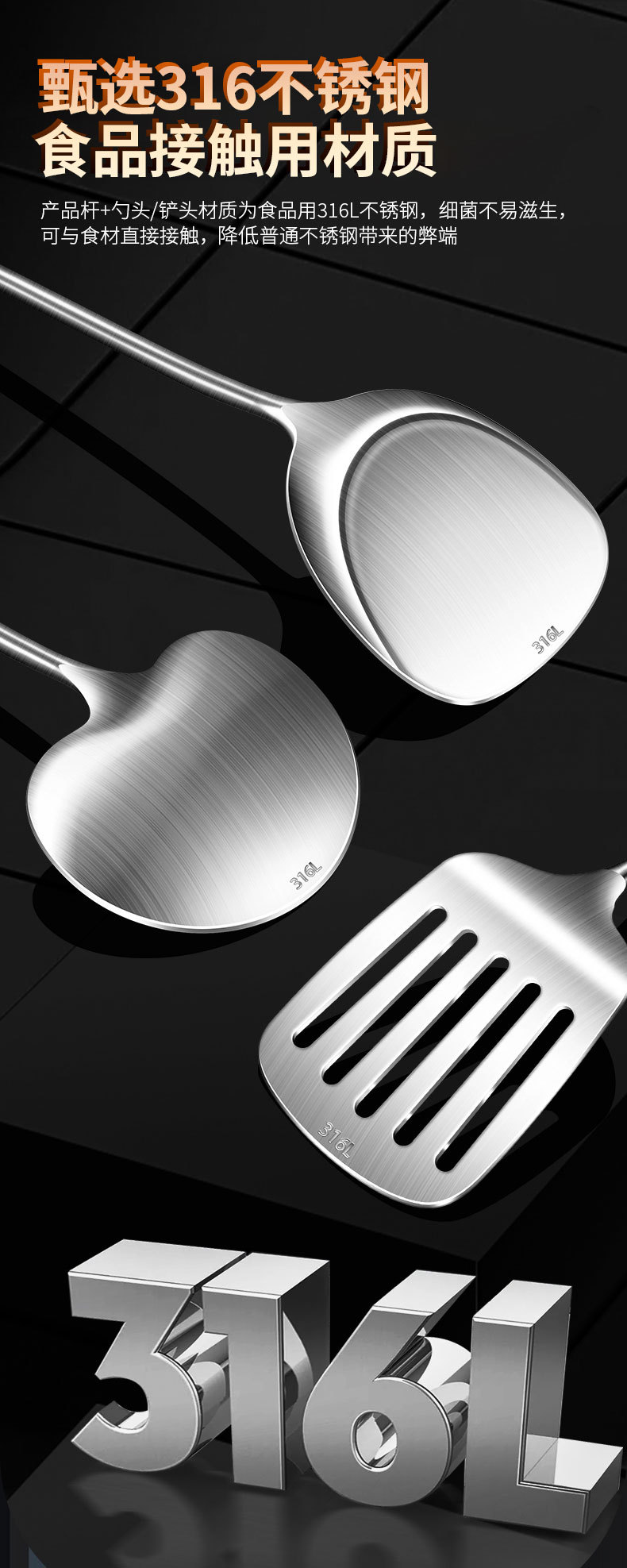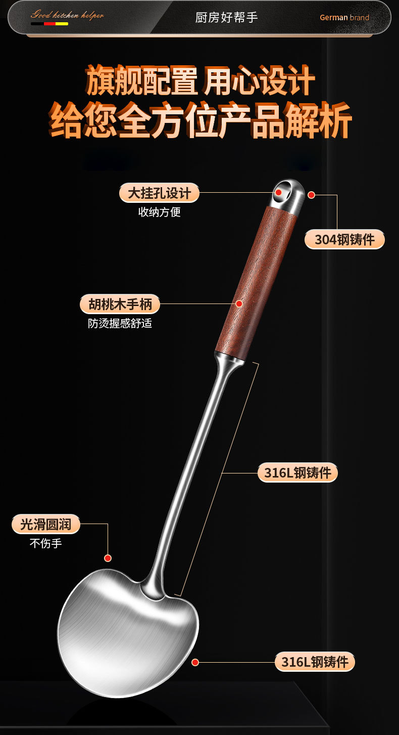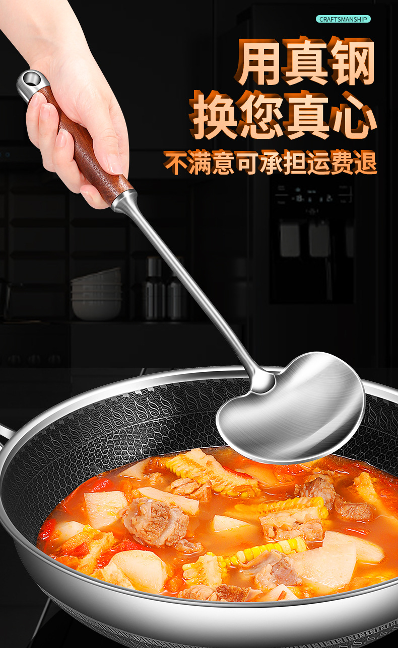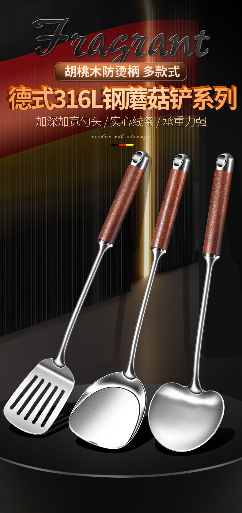 【跨境出口德国316不锈钢蘑菇铲】316L不锈钢蘑菇铲实木防烫炒铲厨房加长锅铲家用烹饪汤勺加厚煎铲