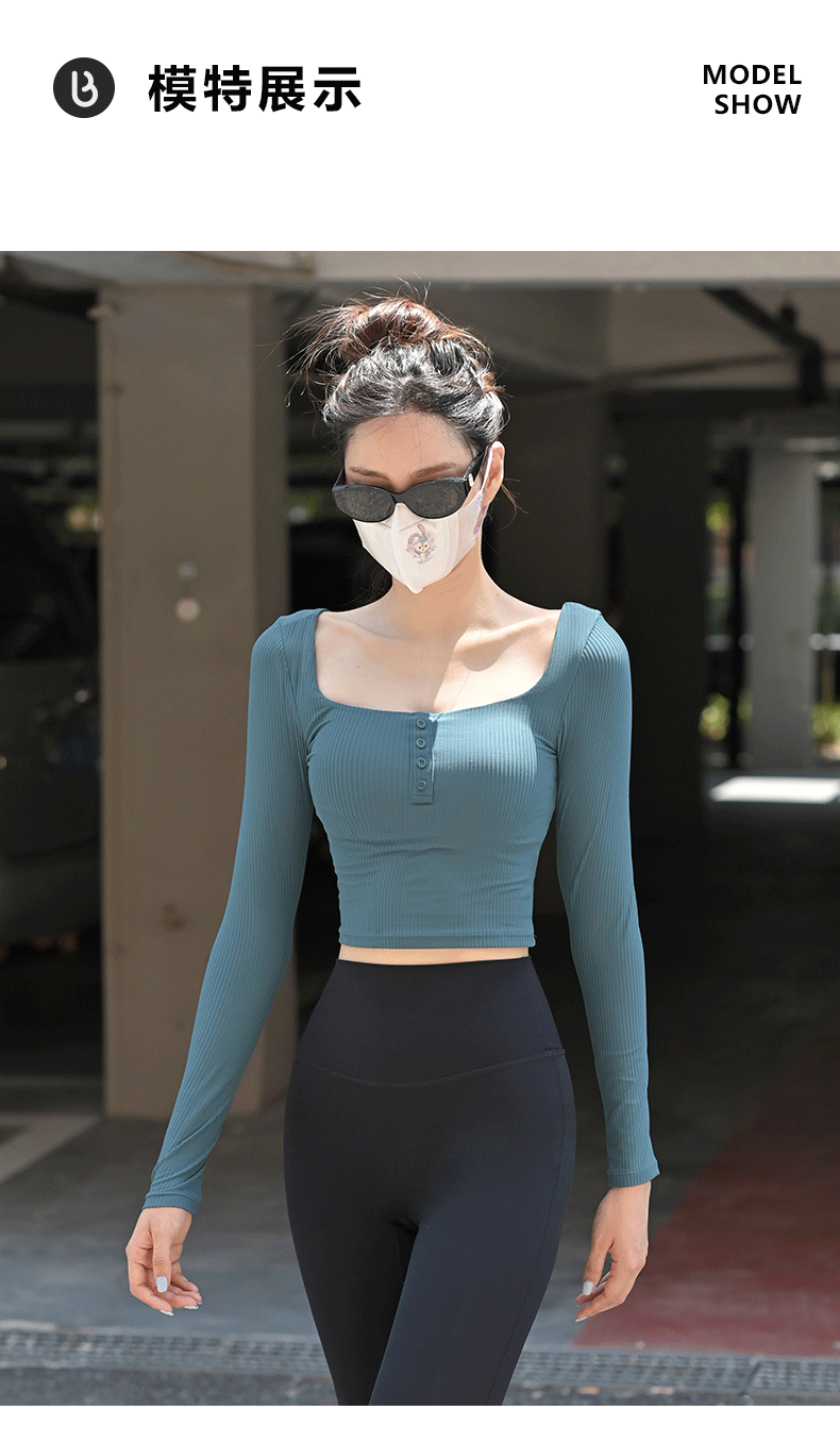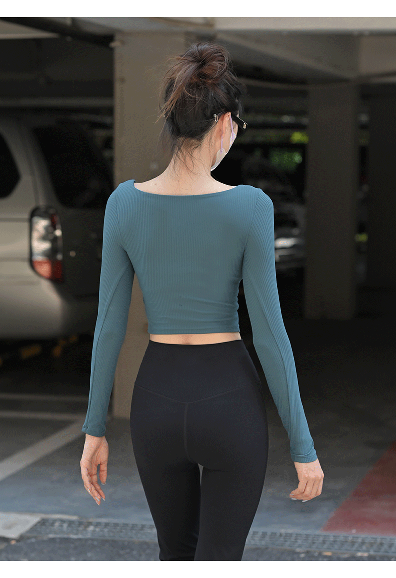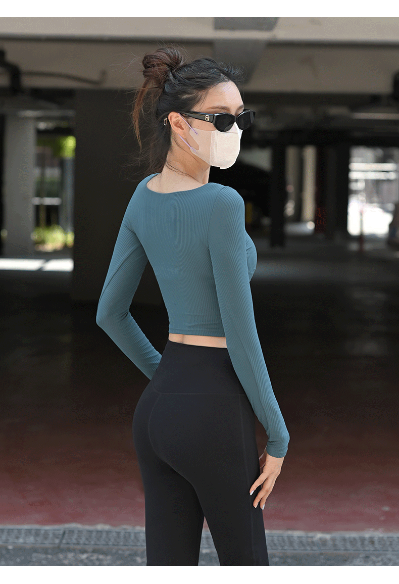 Beemen固定杯运动上衣女外穿紧身短款螺纹瑜伽长袖t恤