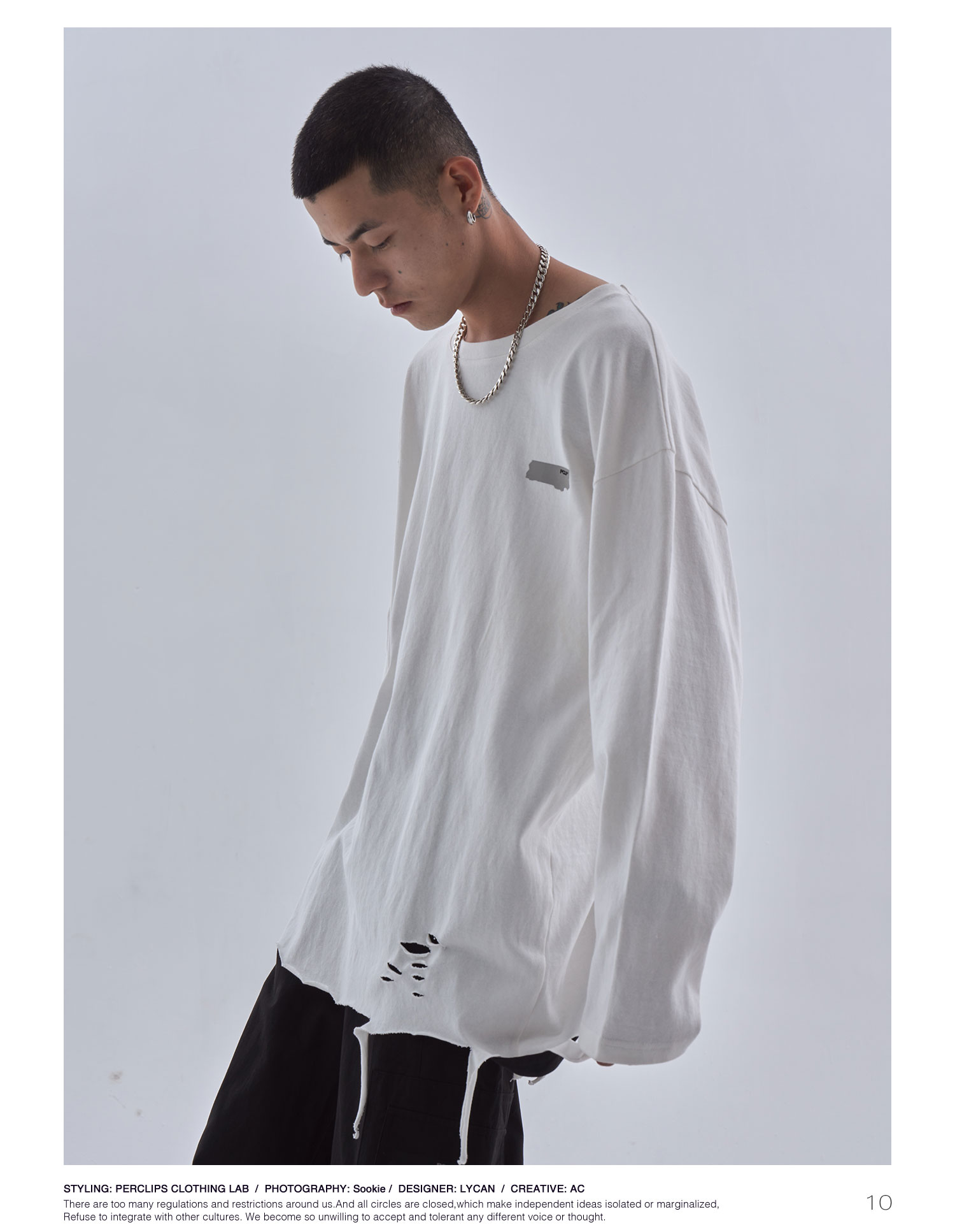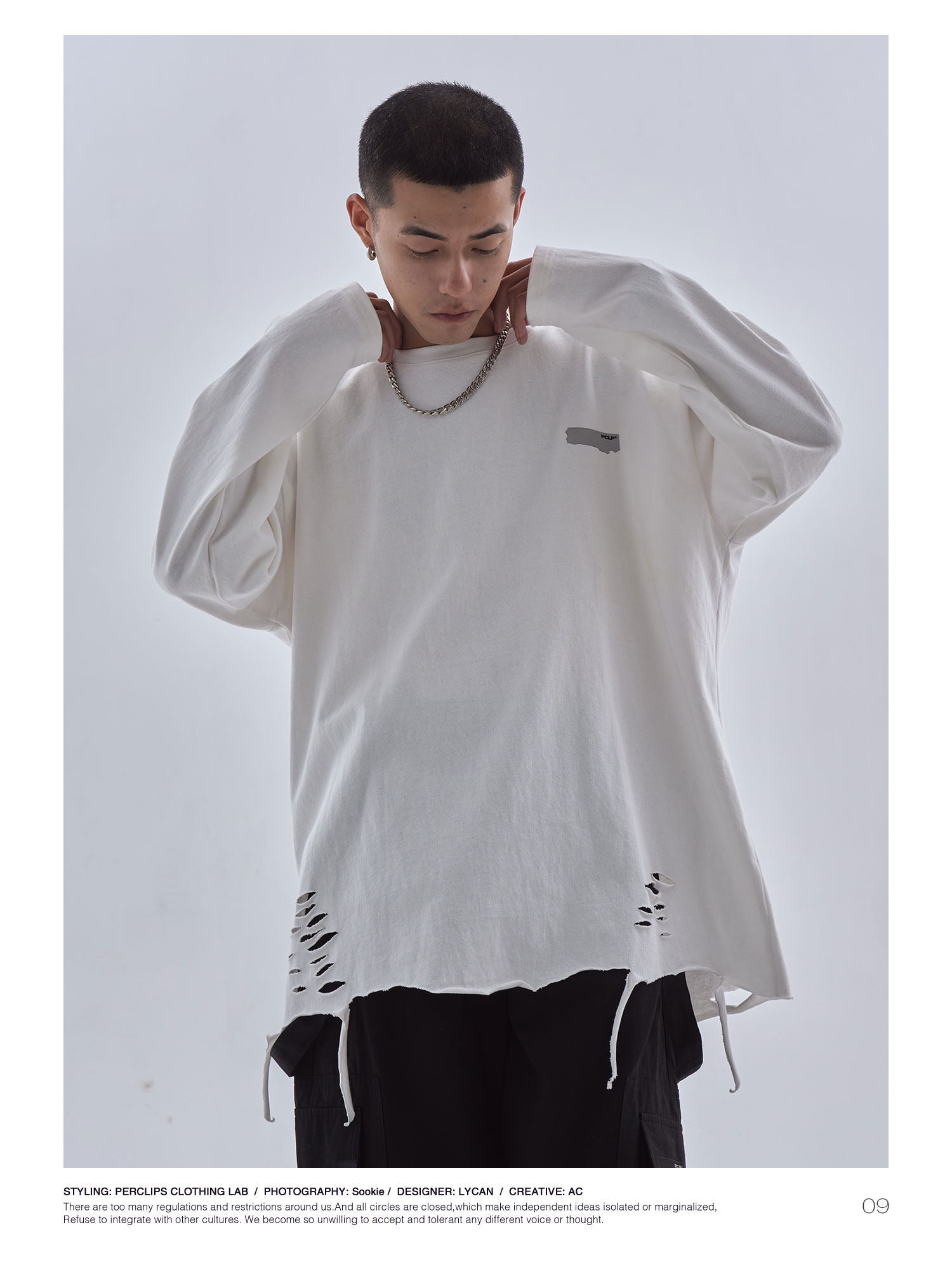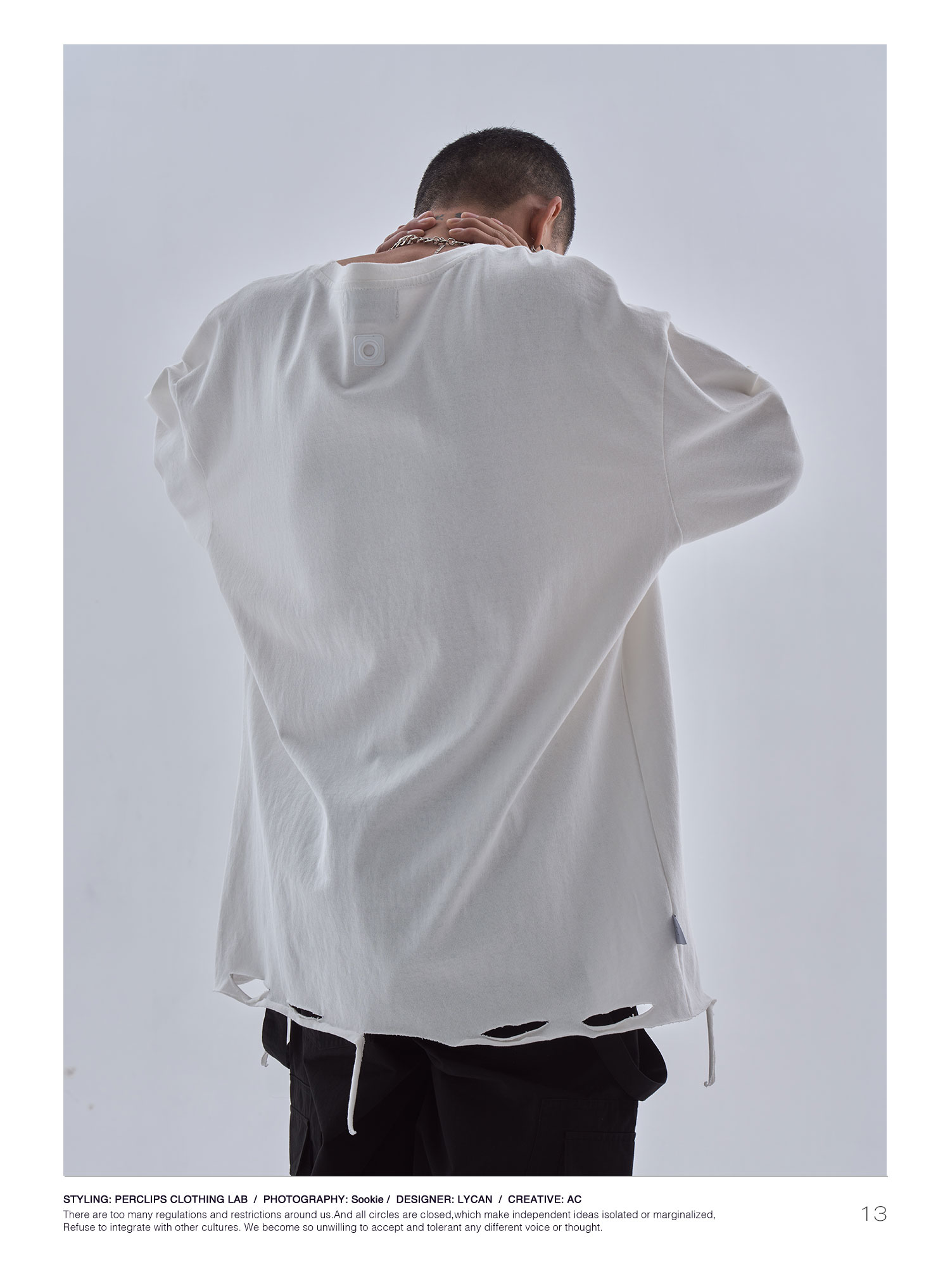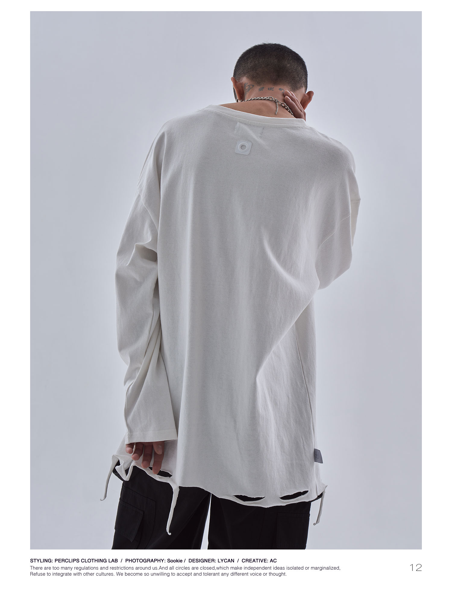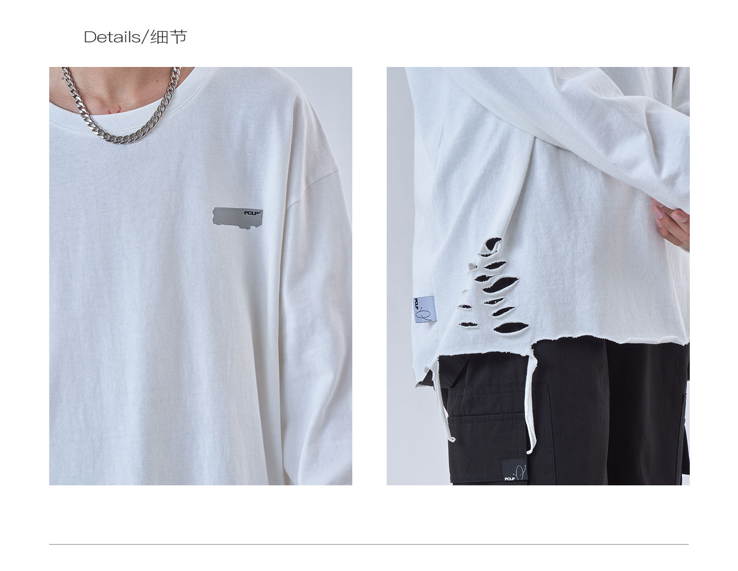 PCLP(PERCLIPS)圆领破洞白色长袖T恤 国潮牌纯棉内搭打底衫体恤男