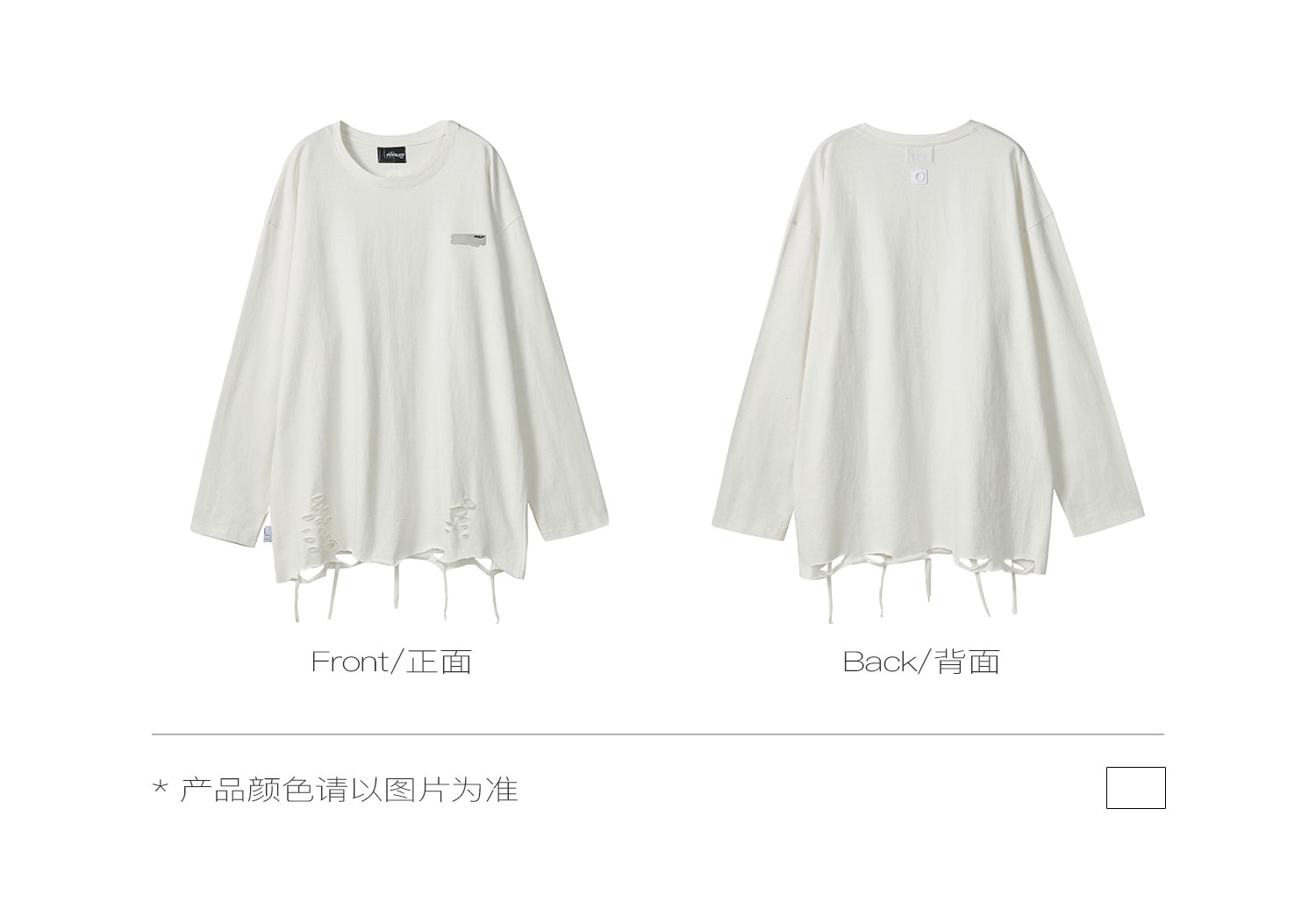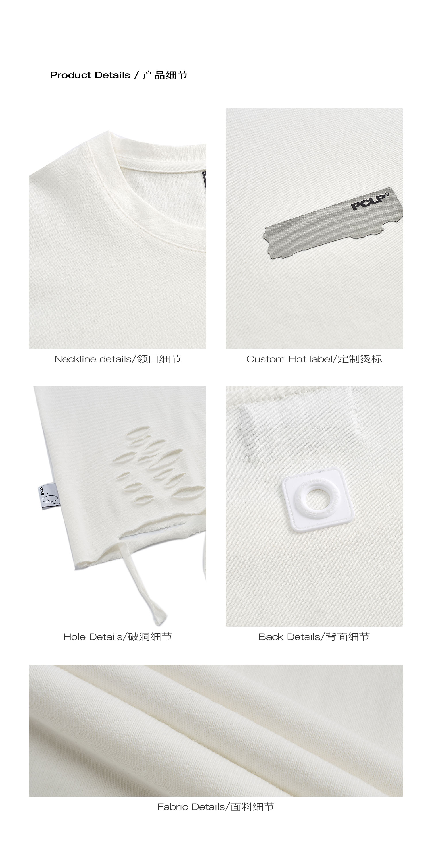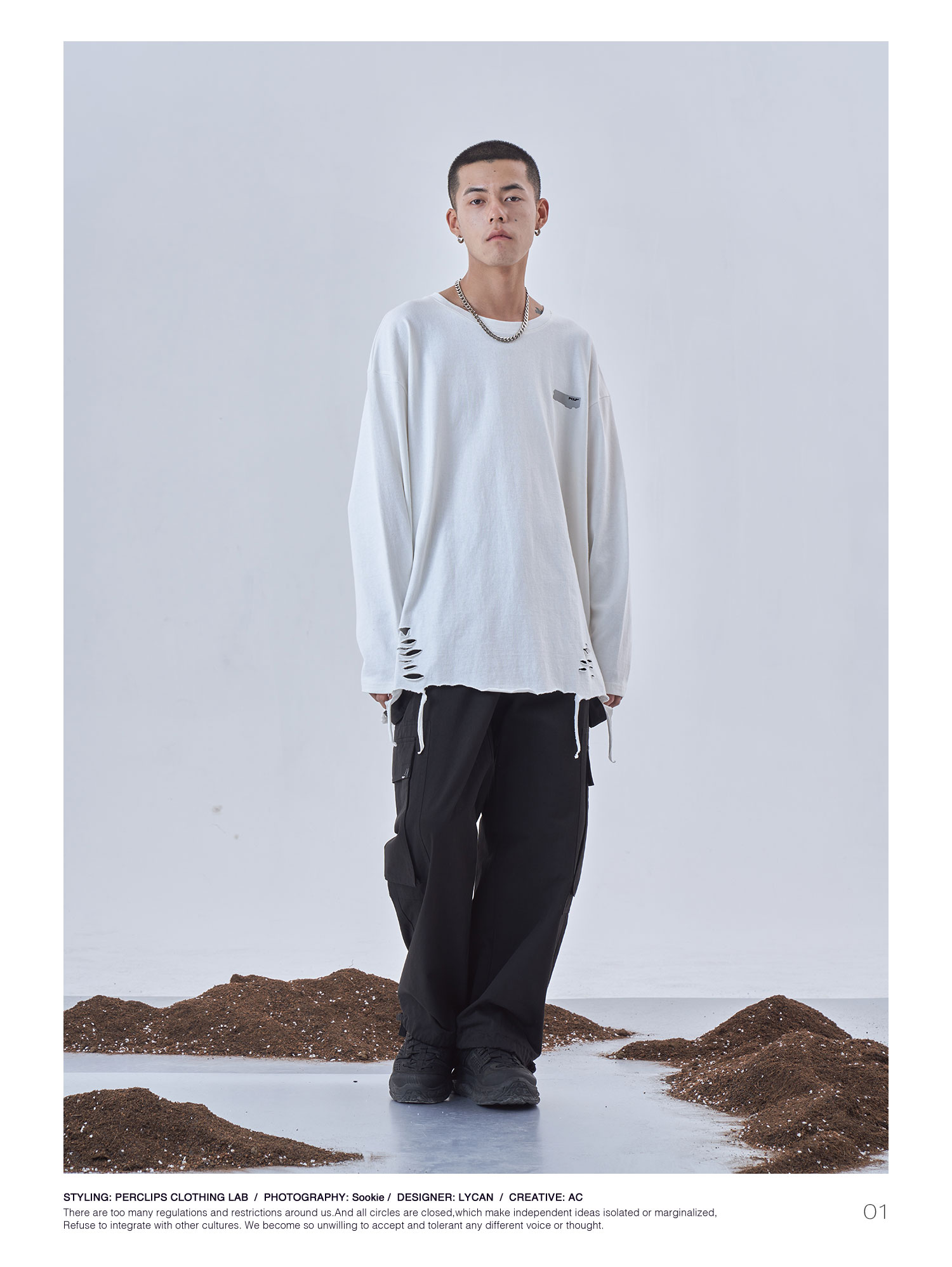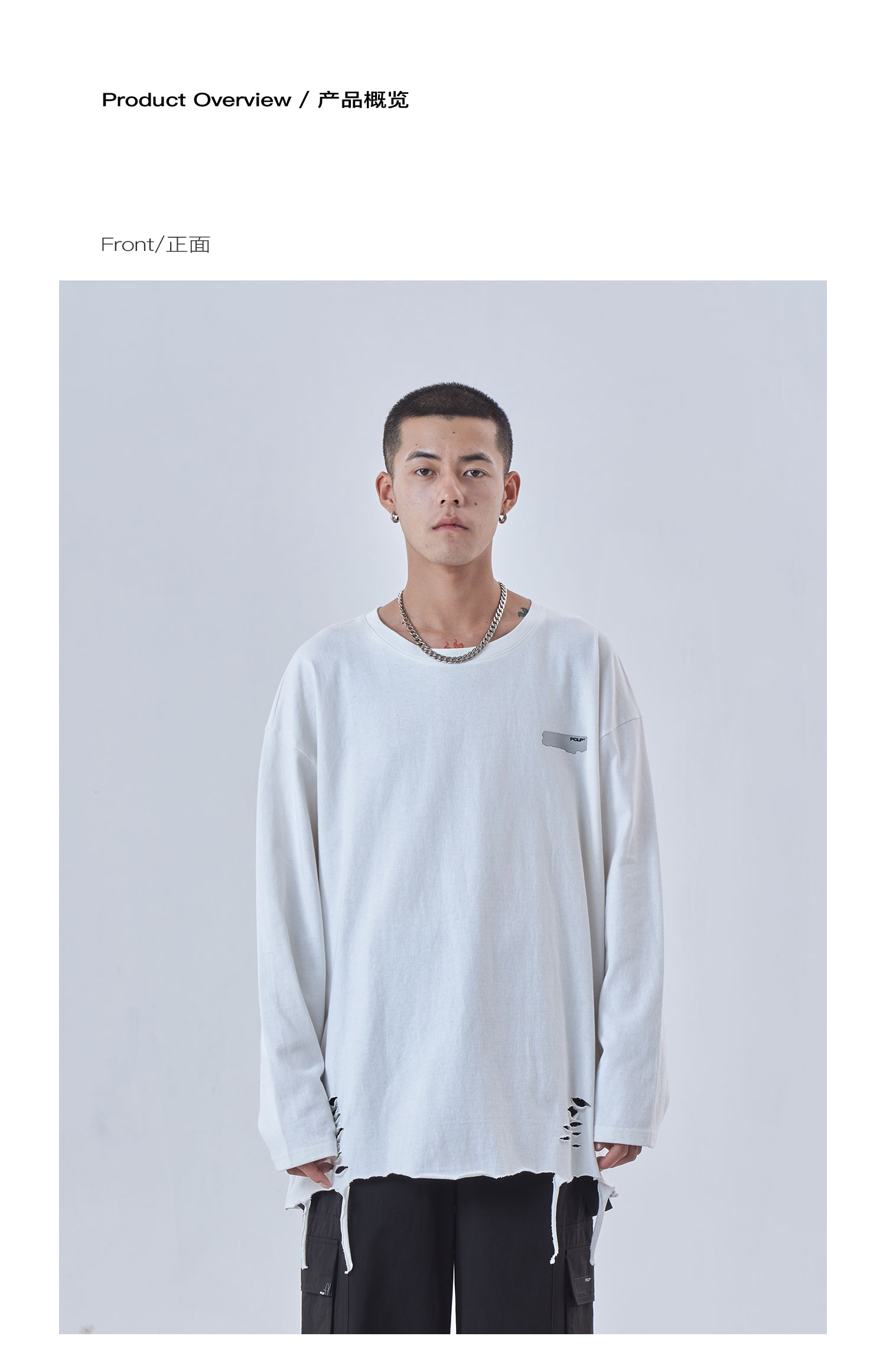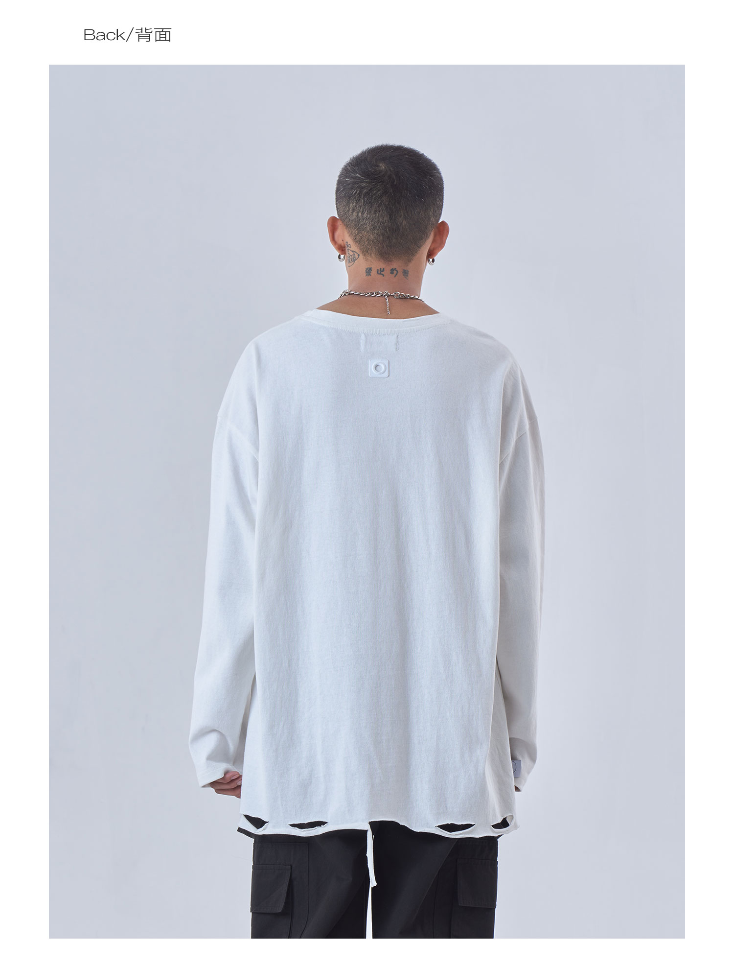 PCLP(PERCLIPS)圆领破洞白色长袖T恤 国潮牌纯棉内搭打底衫体恤男