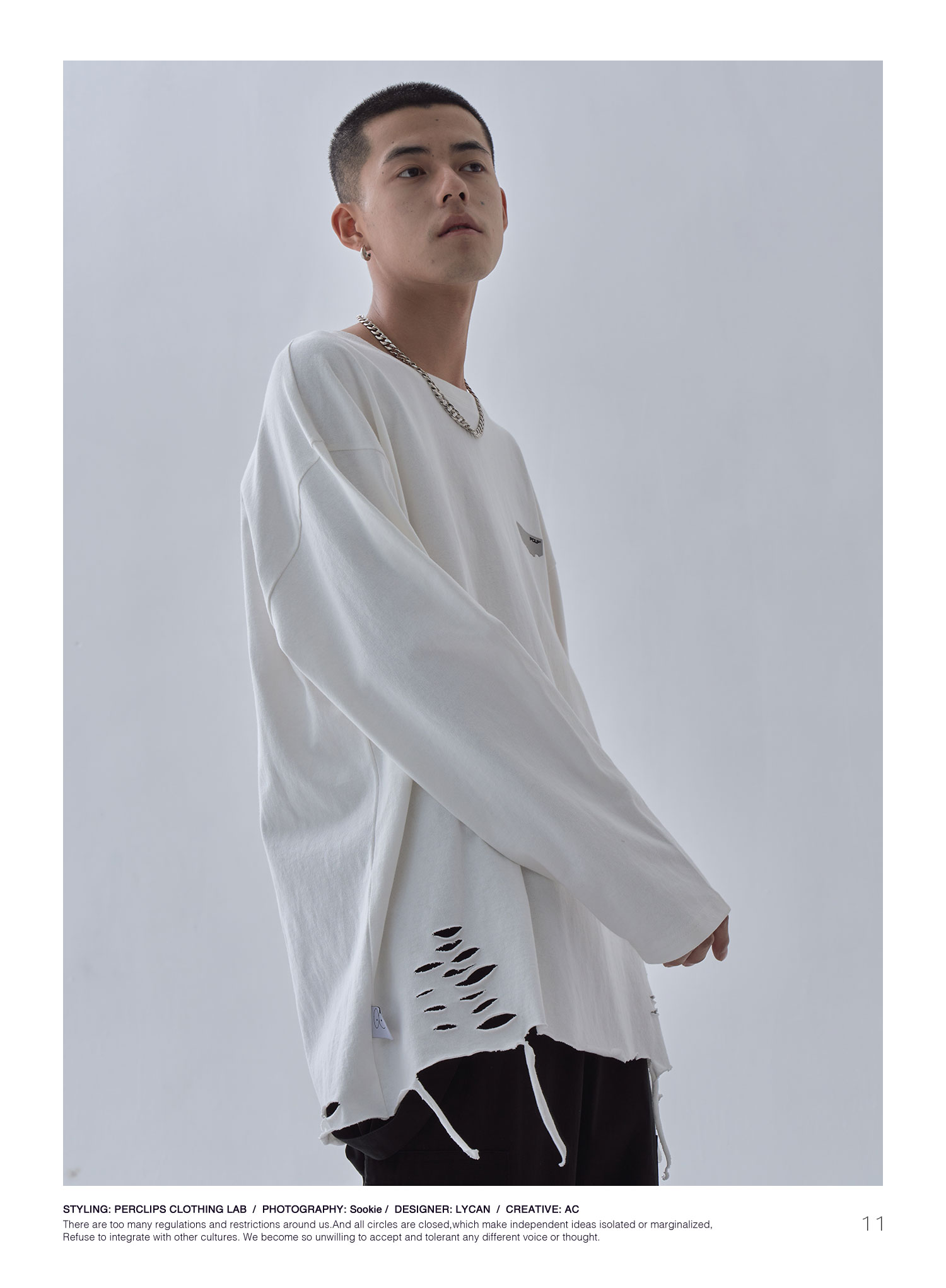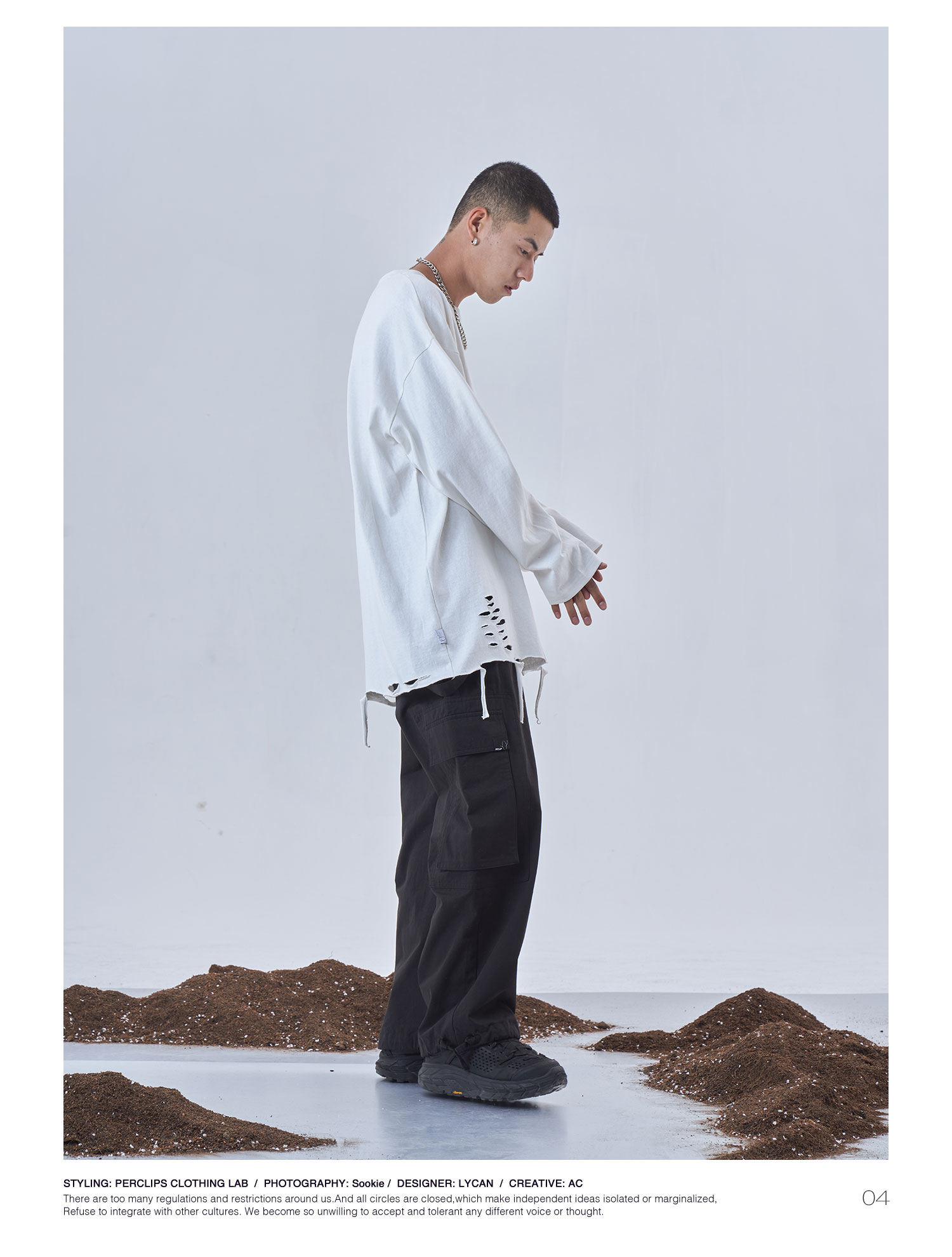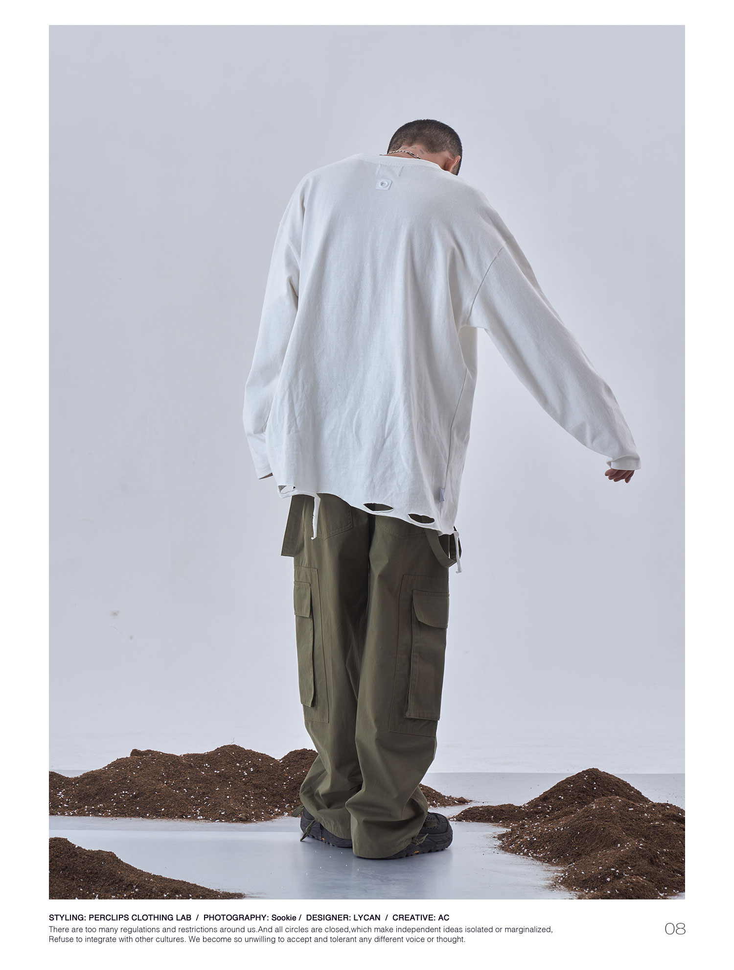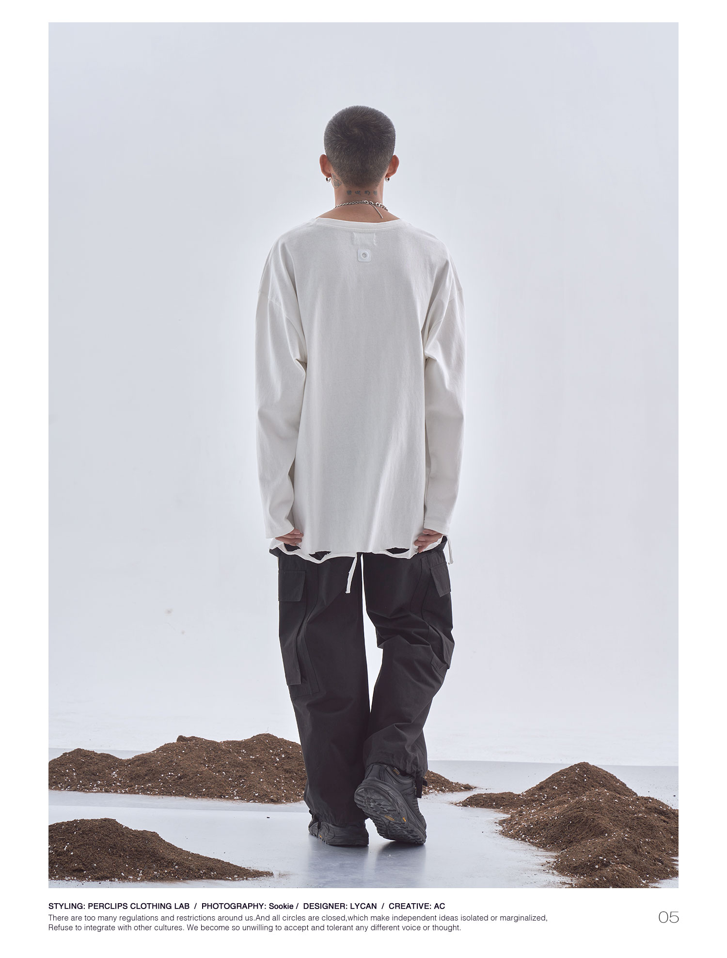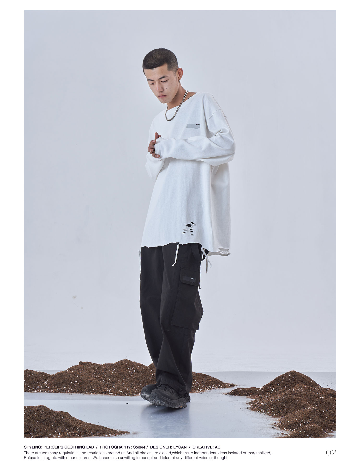 PCLP(PERCLIPS)圆领破洞白色长袖T恤 国潮牌纯棉内搭打底衫体恤男