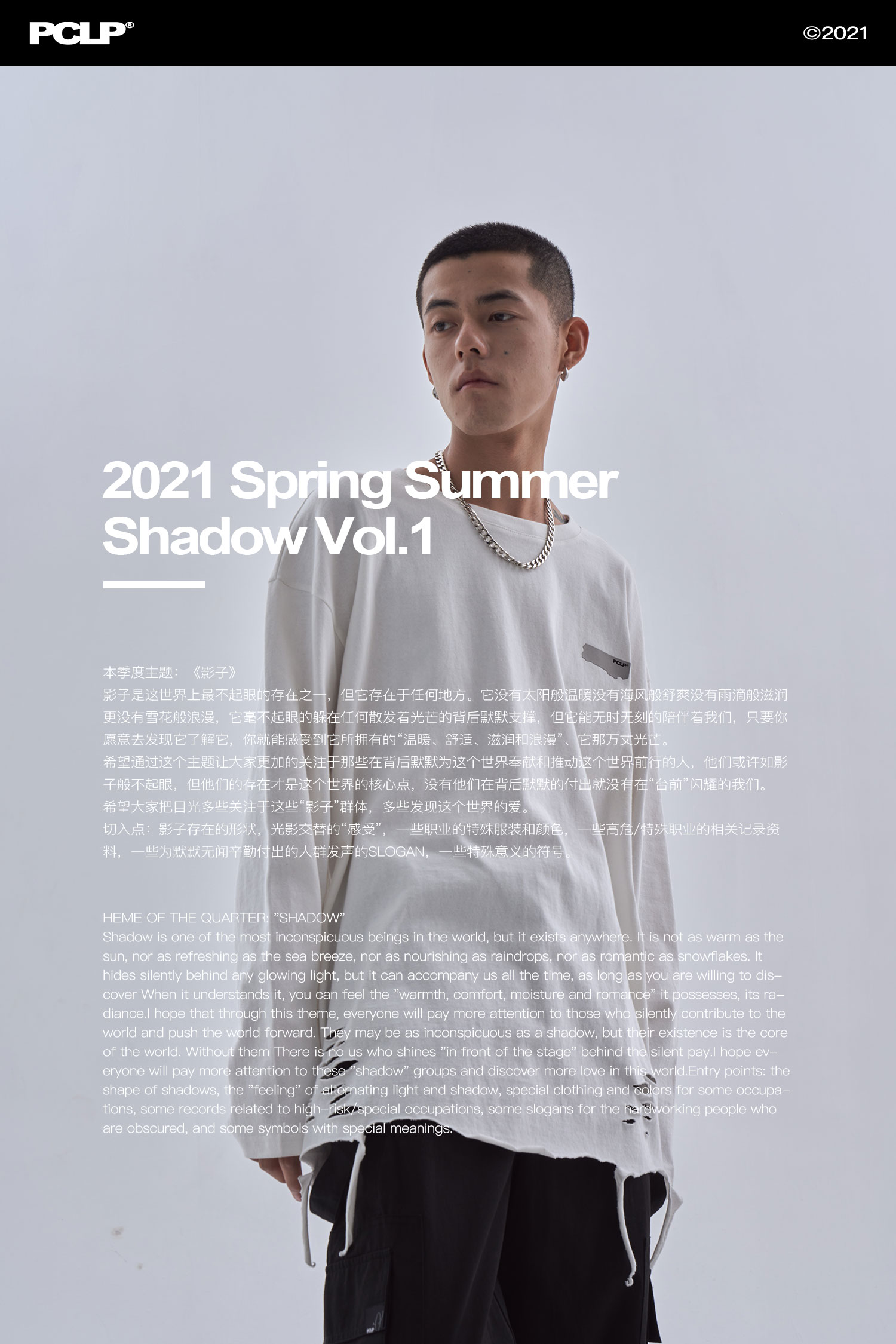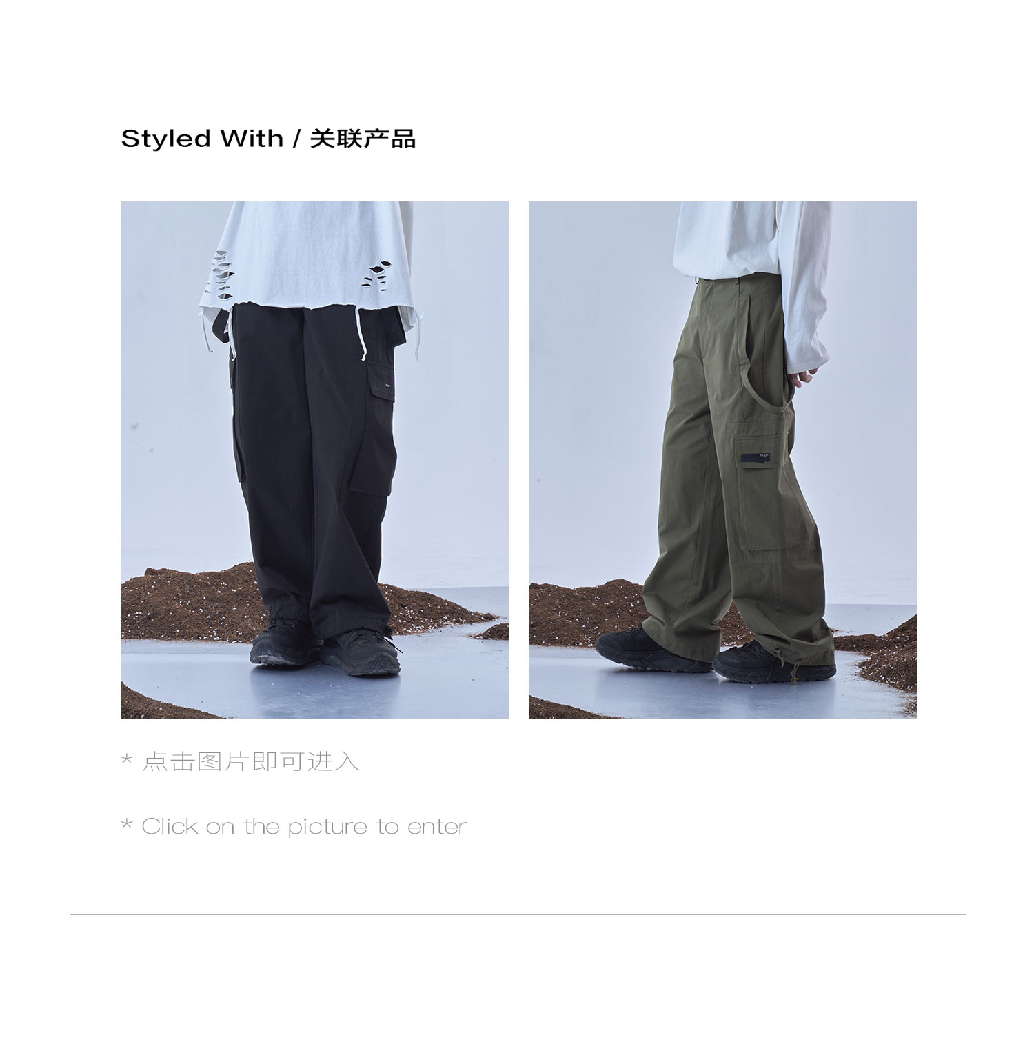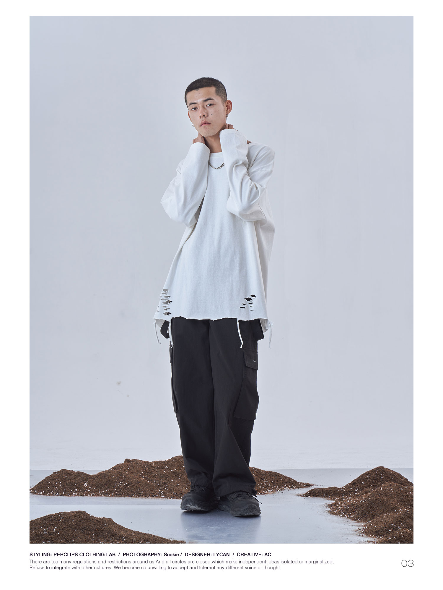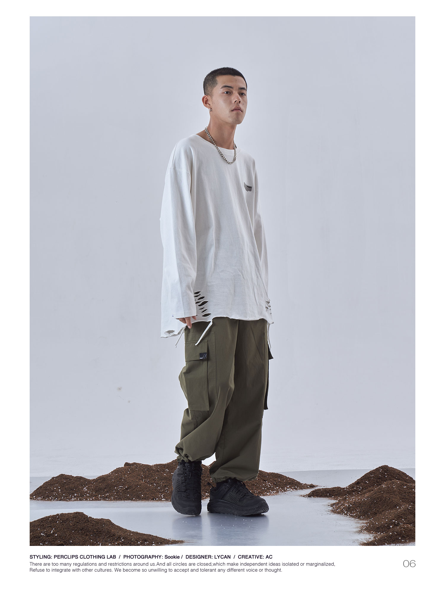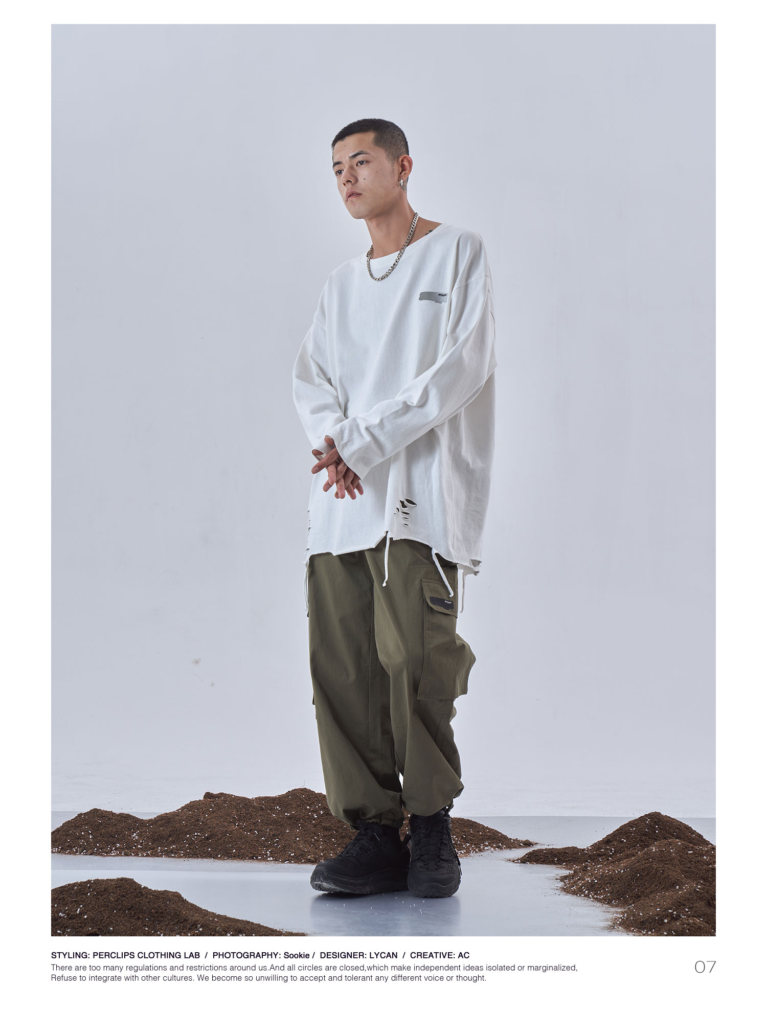 PCLP(PERCLIPS)圆领破洞白色长袖T恤 国潮牌纯棉内搭打底衫体恤男