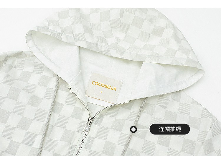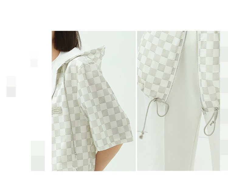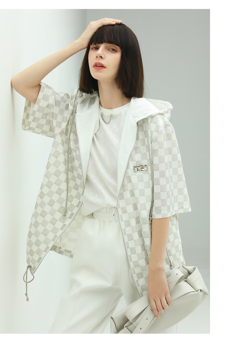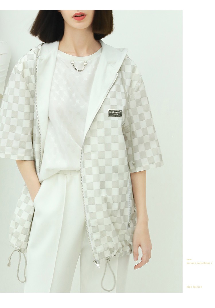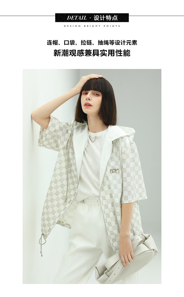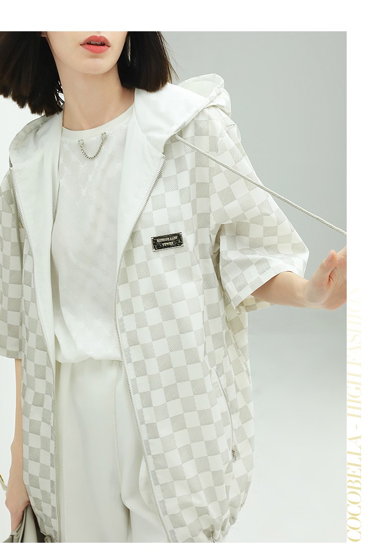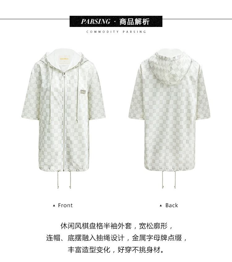 【限时秒杀】COCOBELLA棋盘格印花短袖外套女中长款宽松休闲连帽上衣SC53