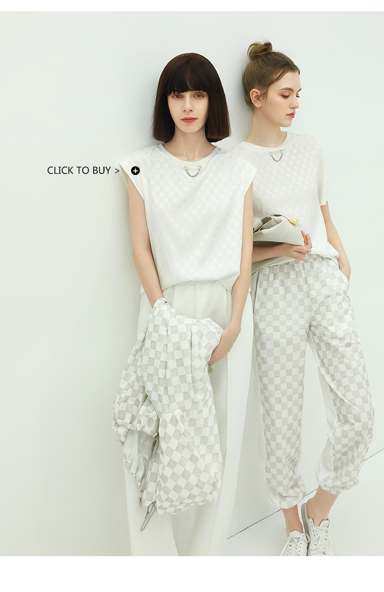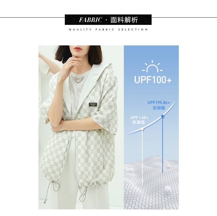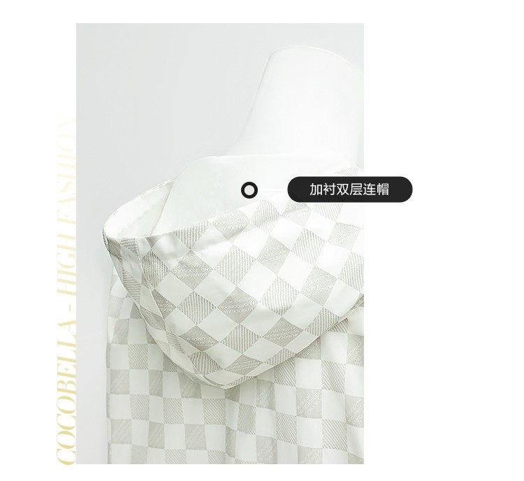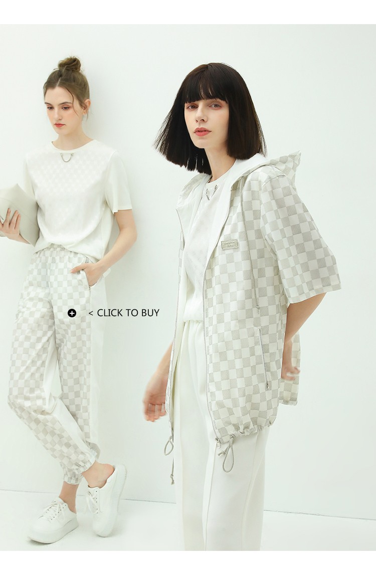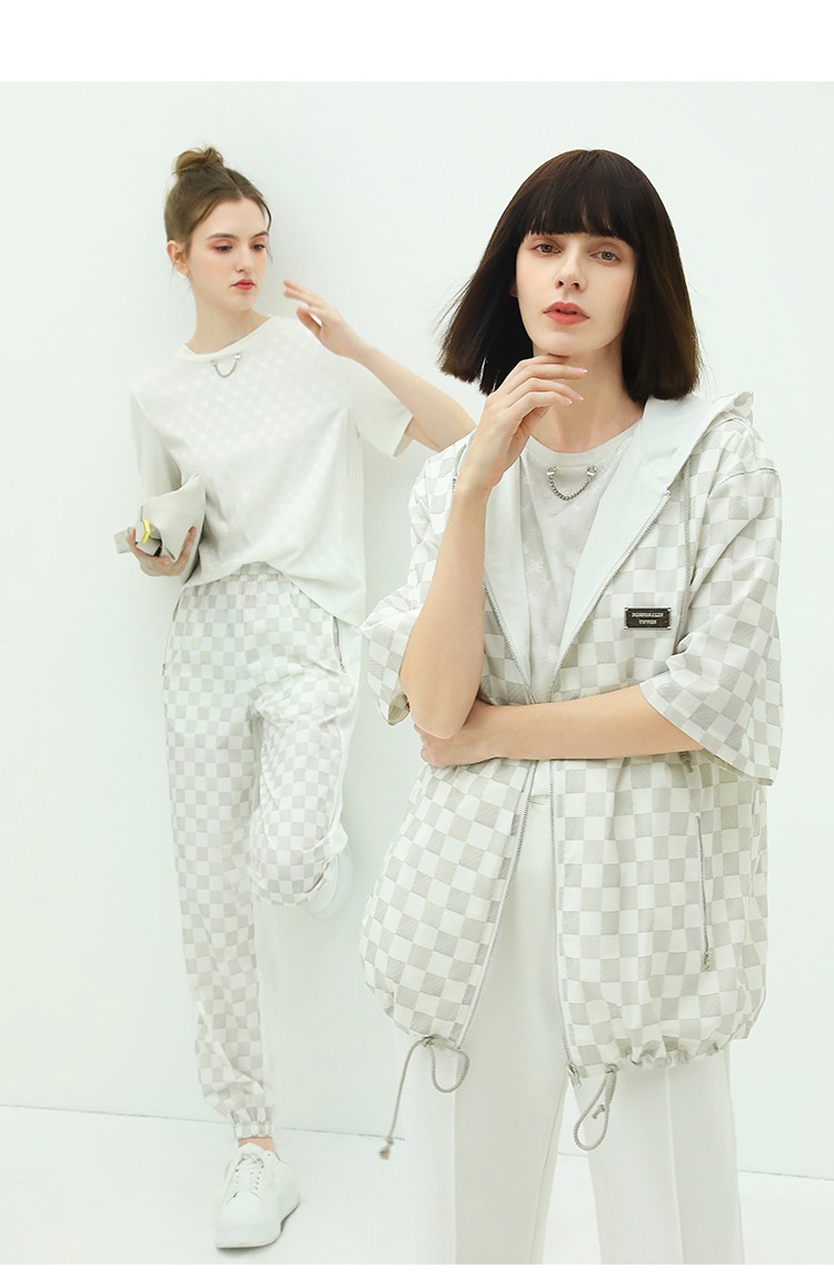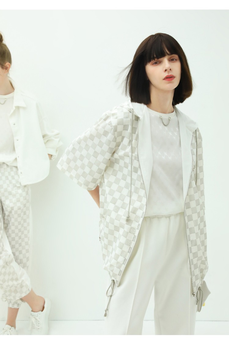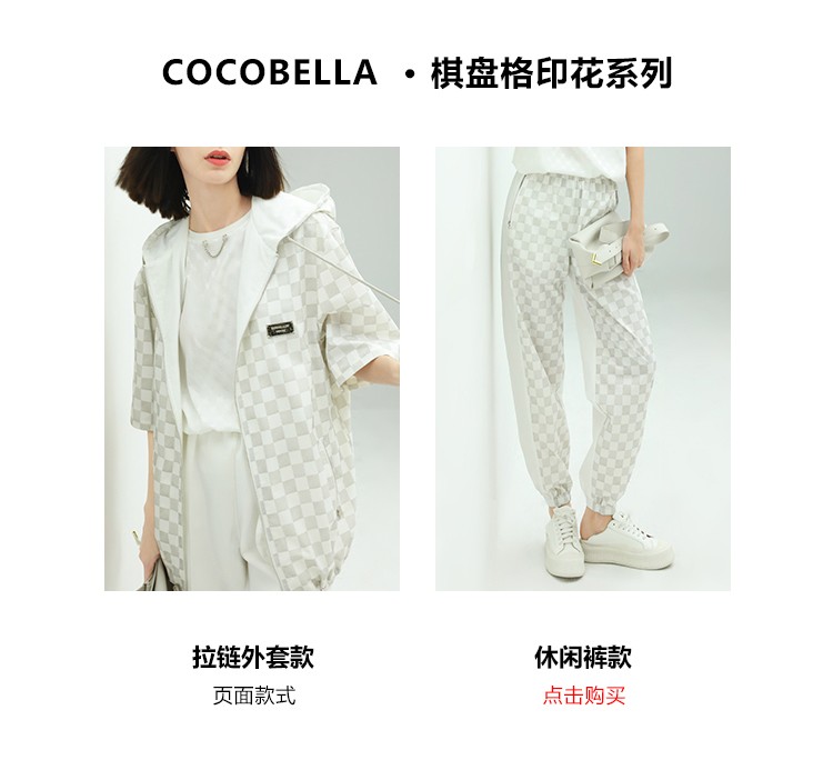 【限时秒杀】COCOBELLA棋盘格印花短袖外套女中长款宽松休闲连帽上衣SC53