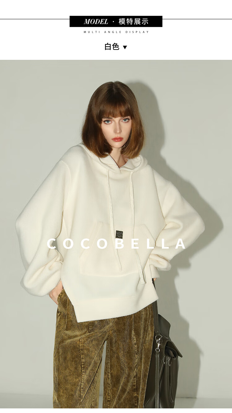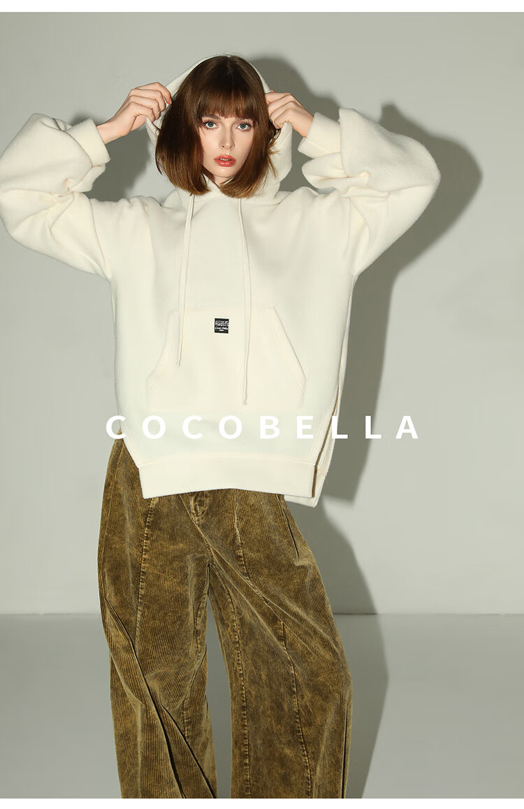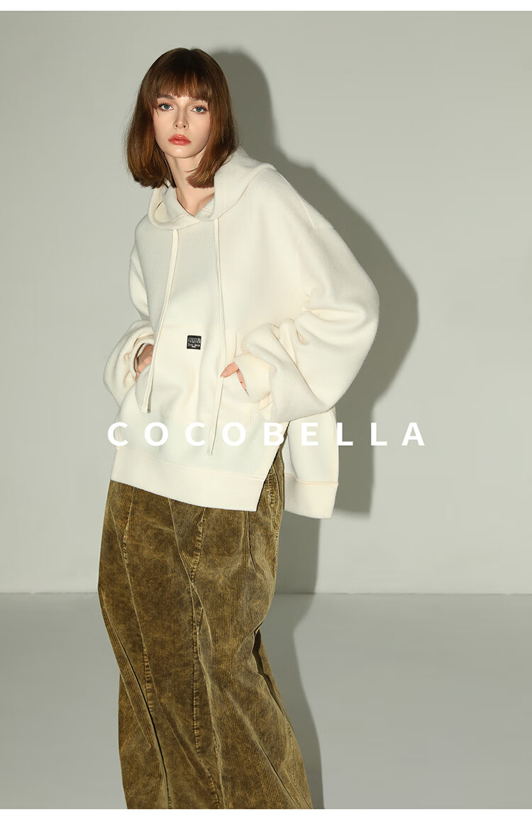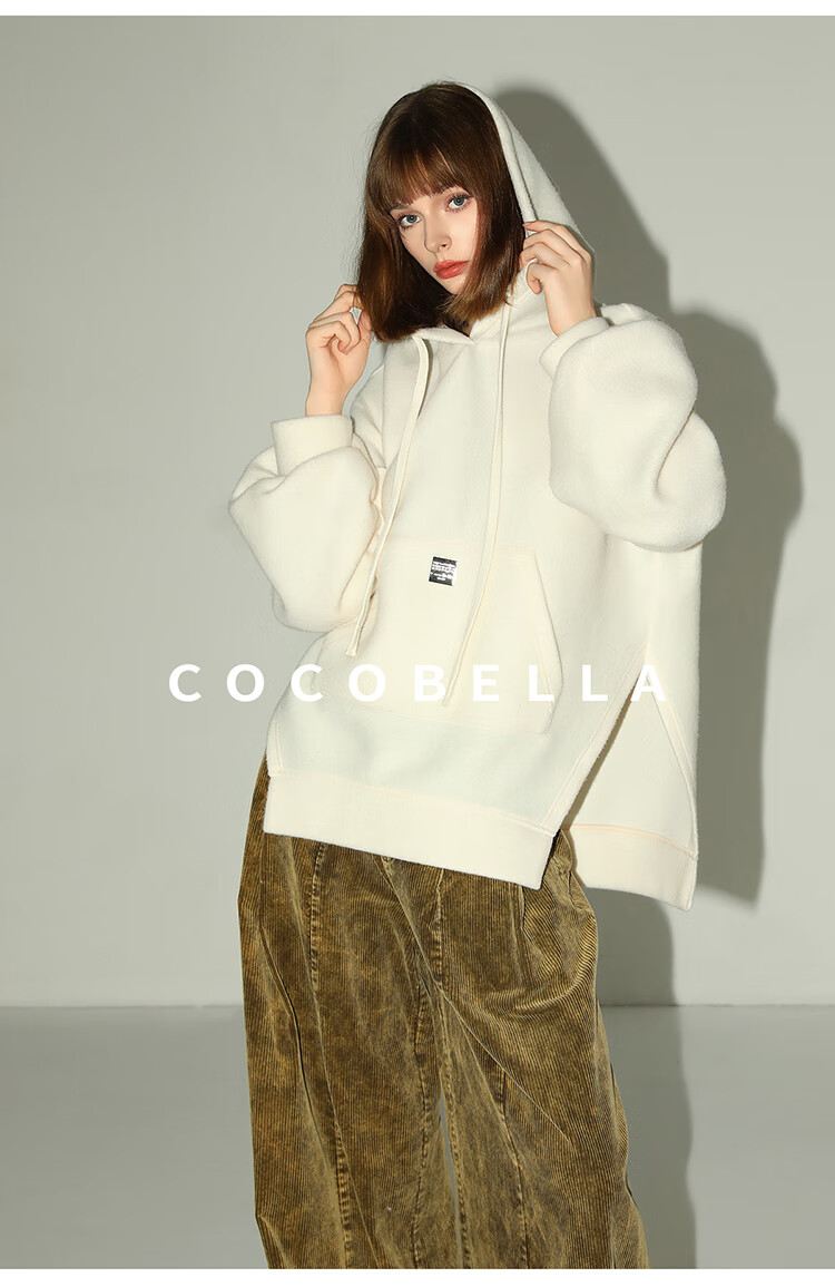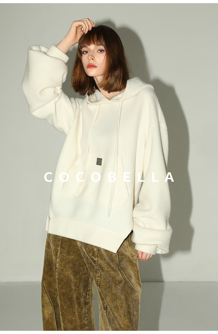 COCOBELLA软糯绒感灯笼袖卫衣女宽松休闲开叉针织帽衫SE0001B