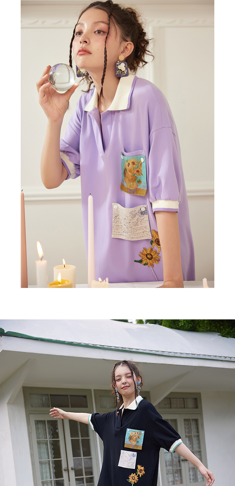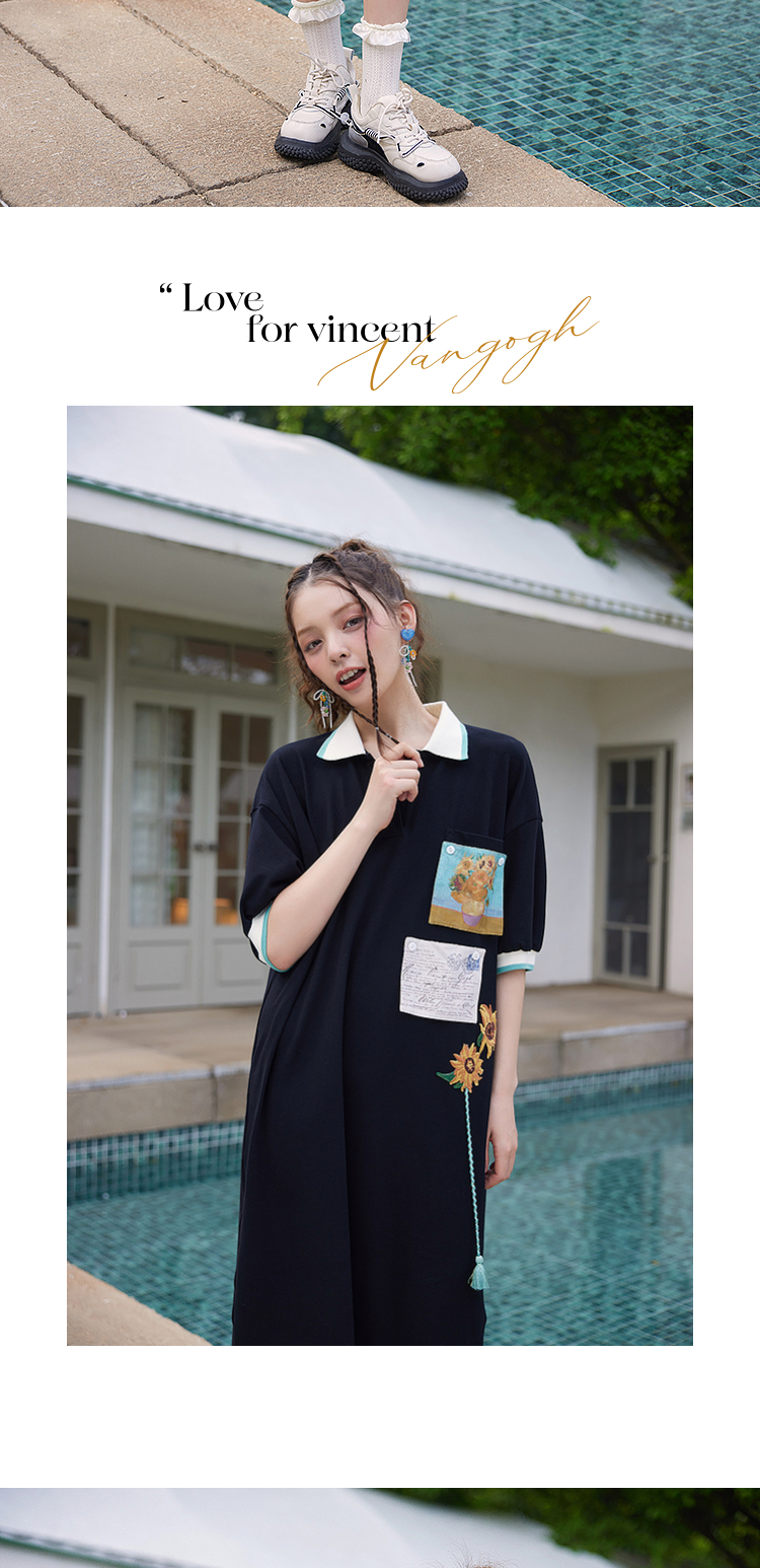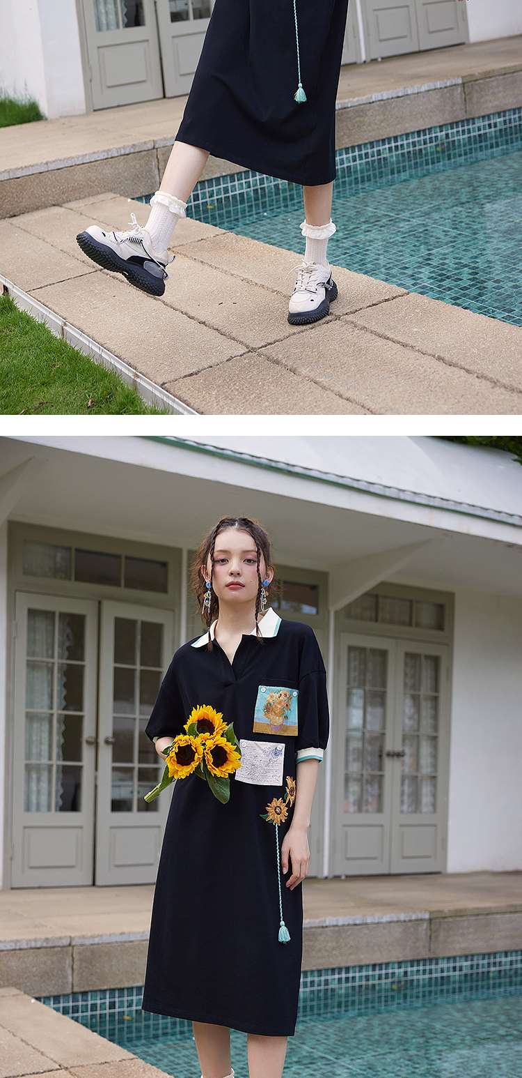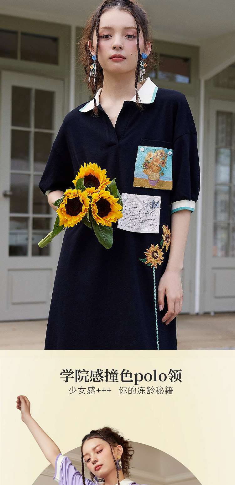 两三事巴黎手账 夏季休闲印花布口袋绣花polo领连衣裙