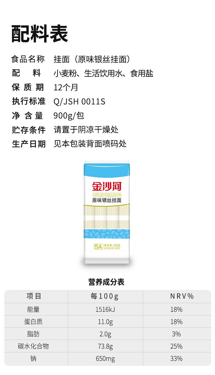 金沙河 原味银丝挂面 龙须面 方便速食拉面 清汤面 900g/袋