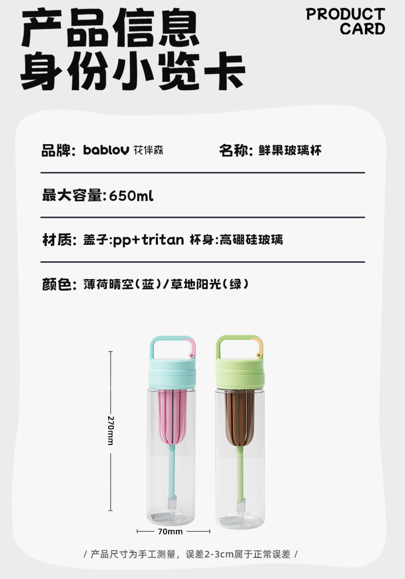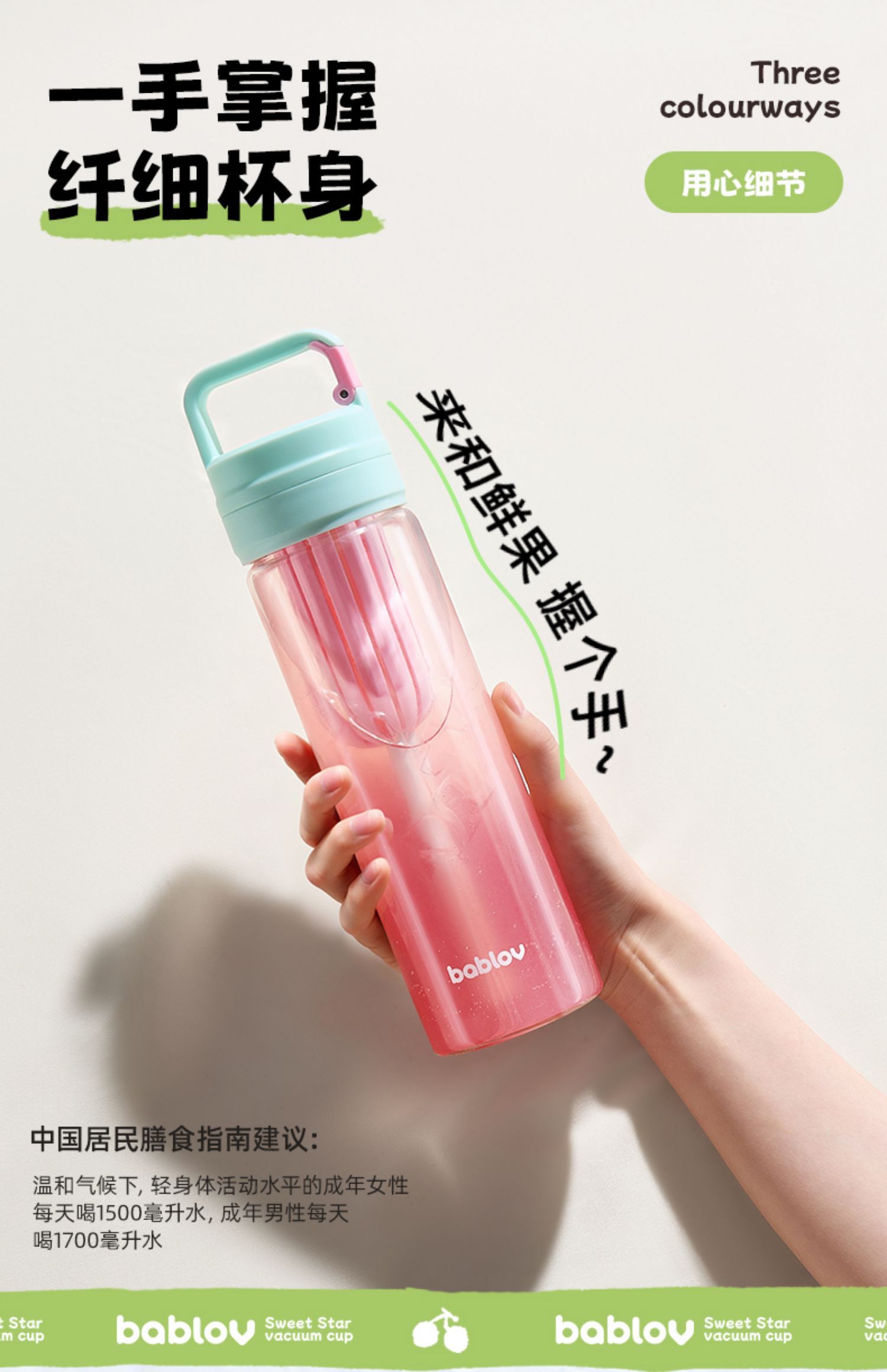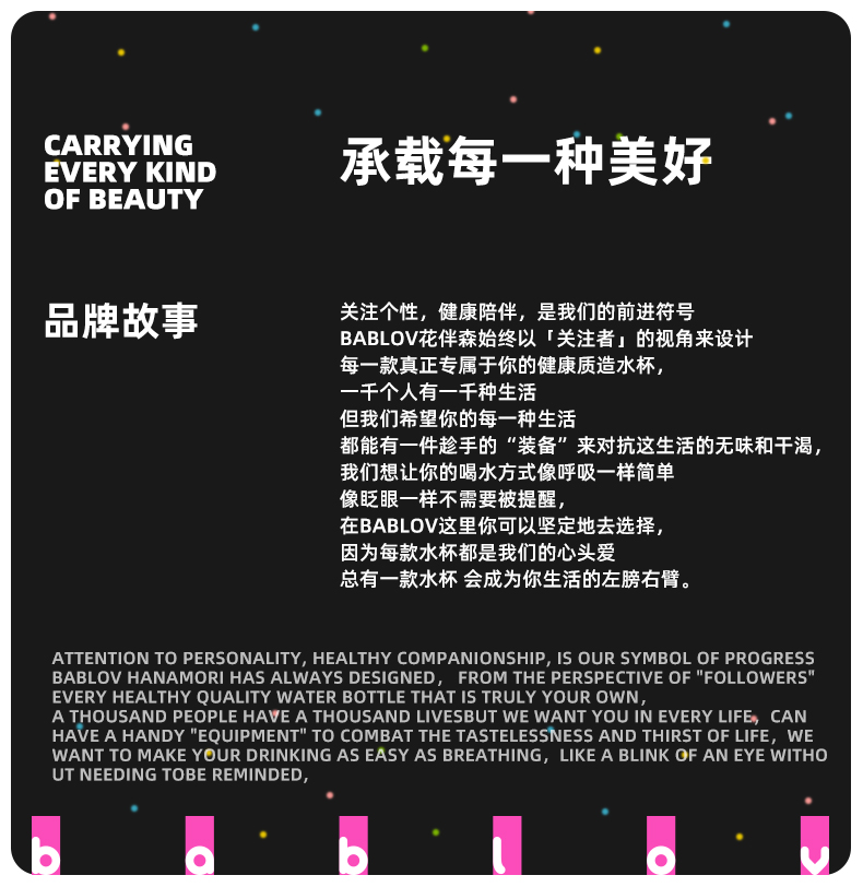 - BABLOV关注中国人的饮水健康,更不断探索未知可能性,专注于新生代自我个性表达,创造玩味新潮的产品体系。希望将水杯带入Z世代年轻人的生活,传递更多“饮”响力。