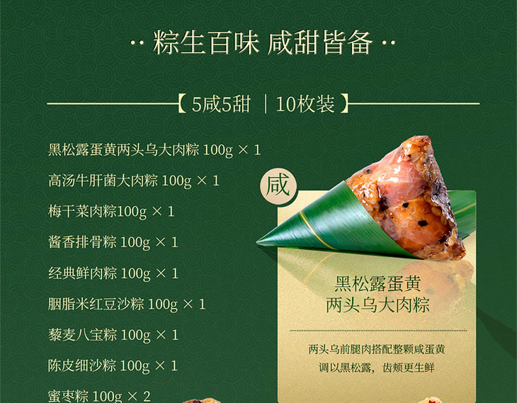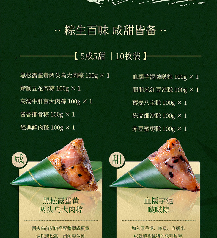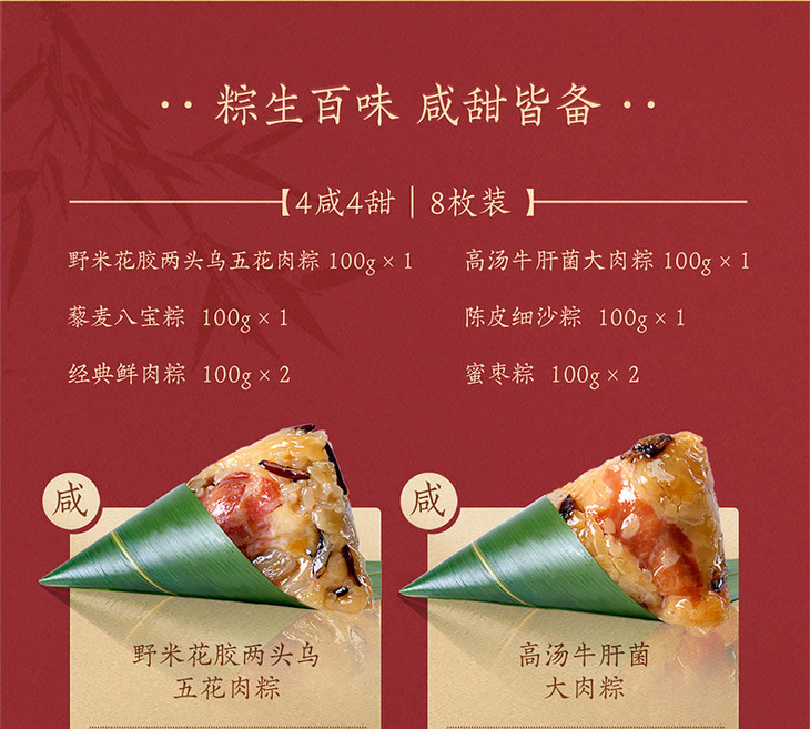 野米花胶两头乌五花肉粽、酱香排骨粽六款咸粽;