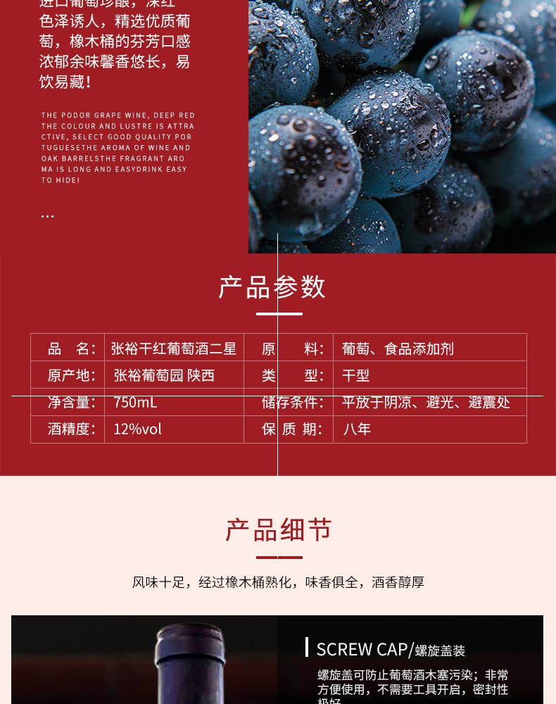 张裕二星干红葡萄酒 红酒 750ml*2支(裸瓶)