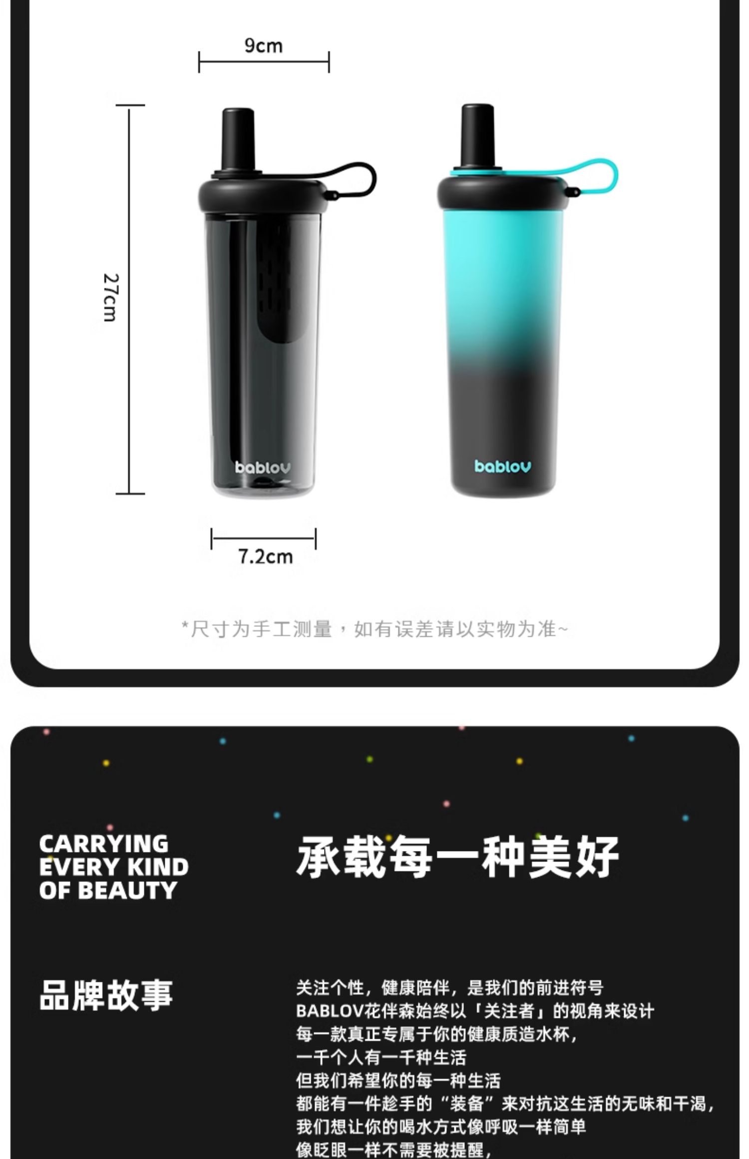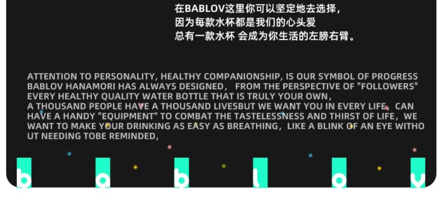 - BABLOV关注中国人的饮水健康,更不断探索未知可能性,专注于新生代自我个性表达,创造玩味新潮的产品体系。希望将水杯带入Z世代年轻人的生活,传递更多“饮”响力。