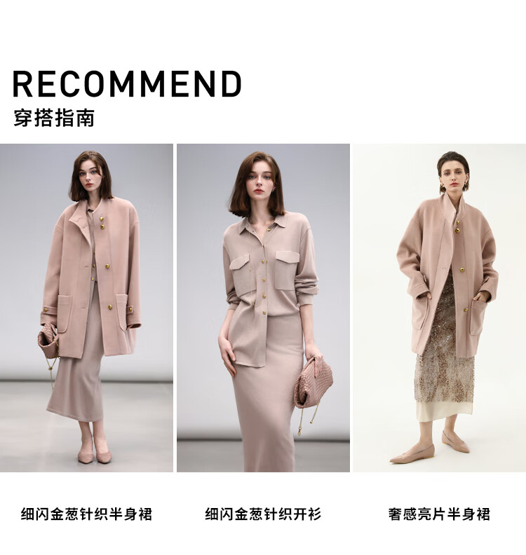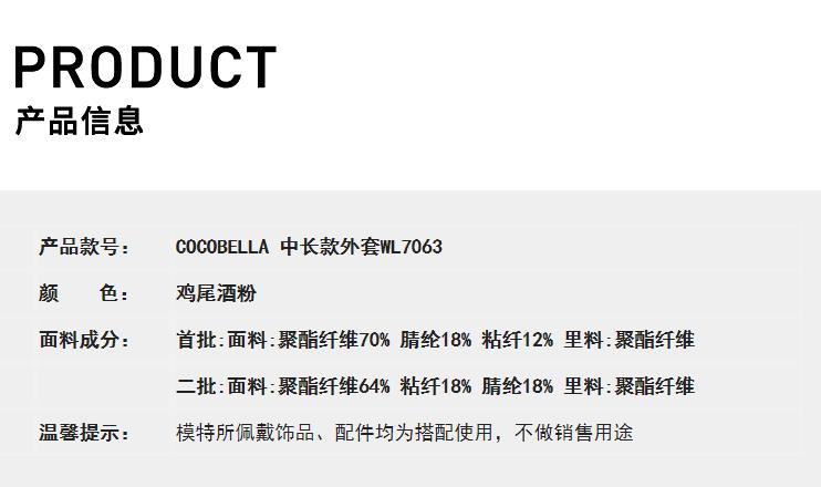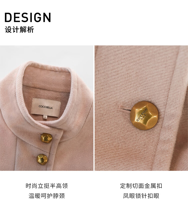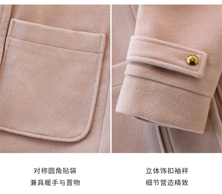 COCOBELLA气质粉温柔风毛呢外套质感金属扣中长款大衣WL7063-2