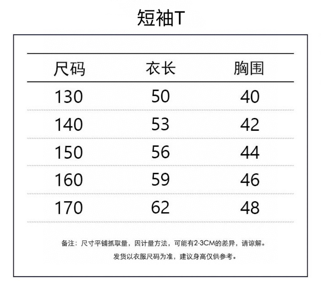 尺码表, 130-170码 身高+1码拍