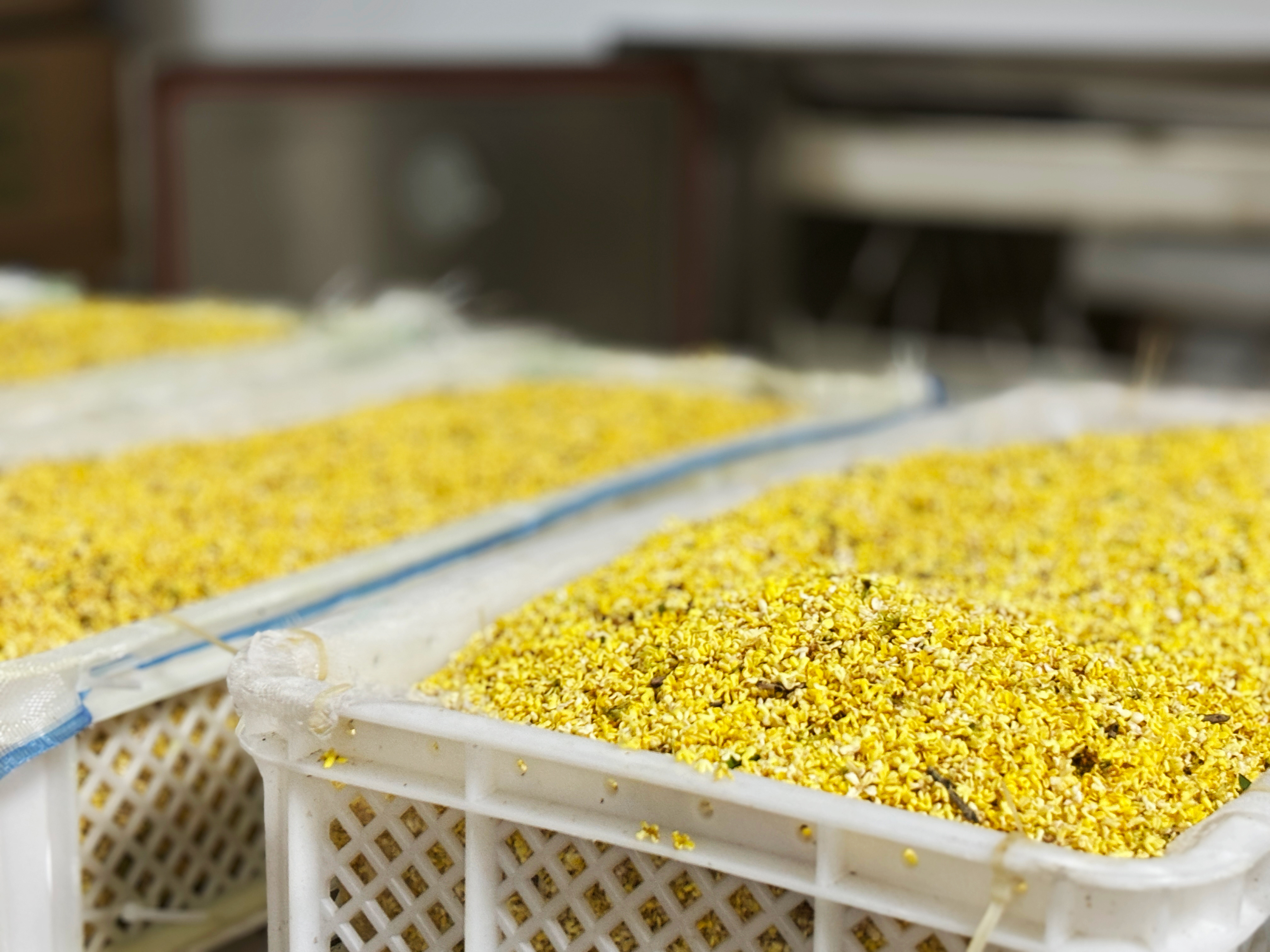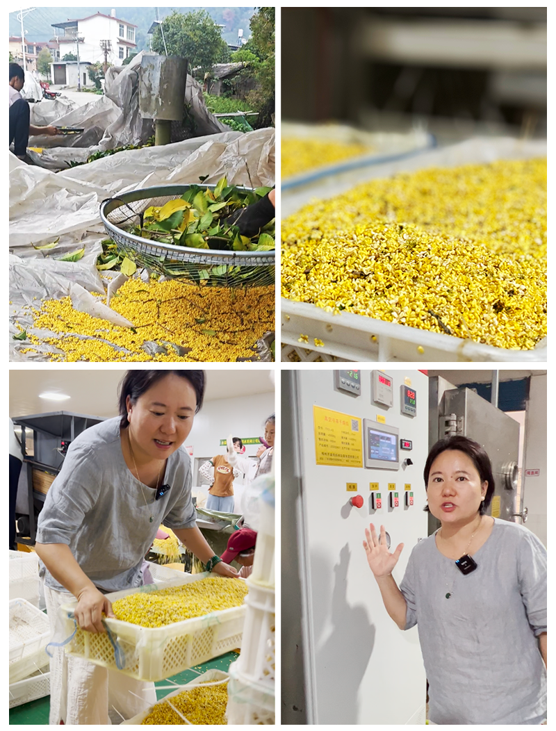你或许也听说过:桂花可以烘干,可以生晒,可以冻干。。。但每一种工艺下留存的桂花,品质可以说是天差地别。如果不去产地,你永远都不知道,原来市面上仅少量的桂花,是冻干品质;人工挑选去梗去黑的,更是少数;大多数都是烘干,而烘干的过程中❌为了保持色泽,硫熏,竟是常规操作……