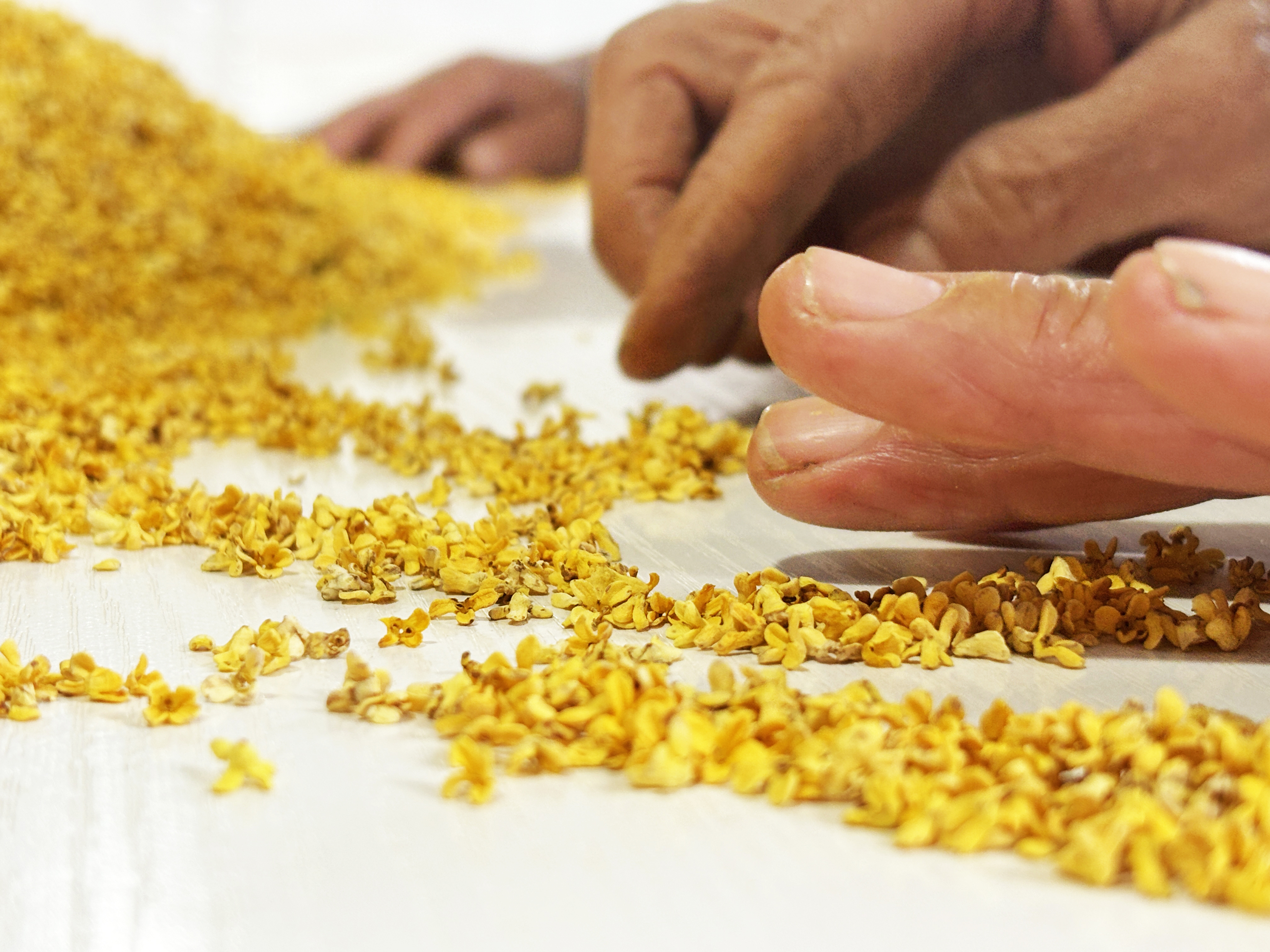 ✅人工一朵朵筛选,去掉梗、叶、瘪花、黑朵,4个人,一上午只能筛选4斤桂花,才得到您手上的那朵桂花,金黄、饱满、香气扑鼻、宛若鲜花~
