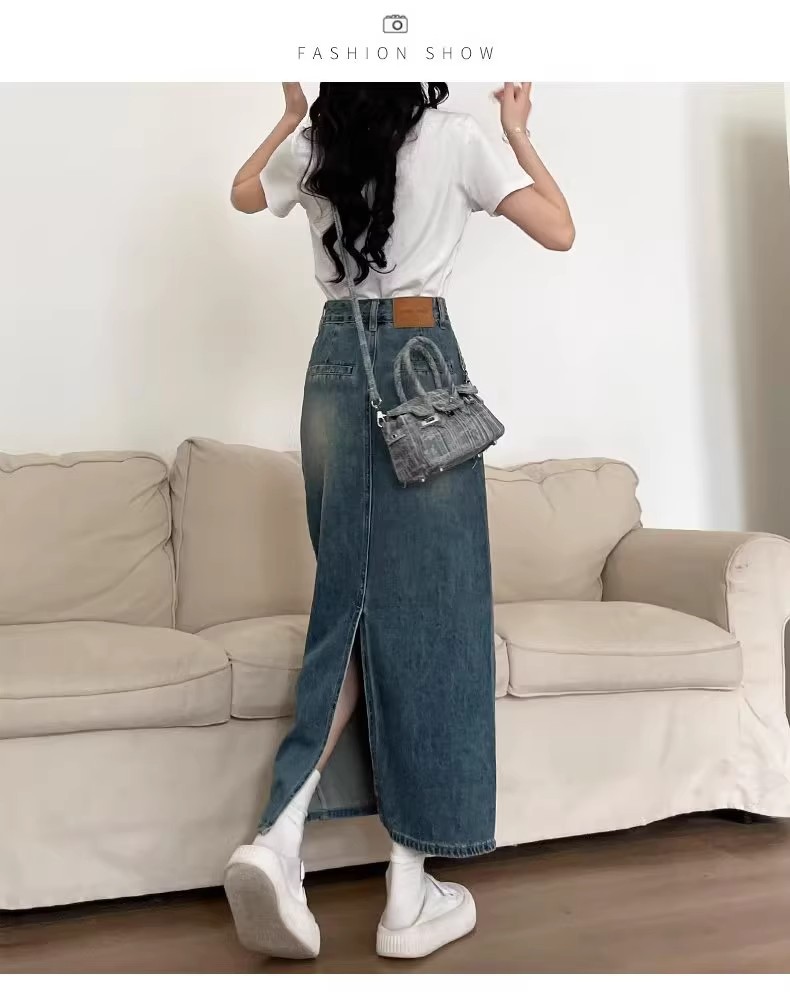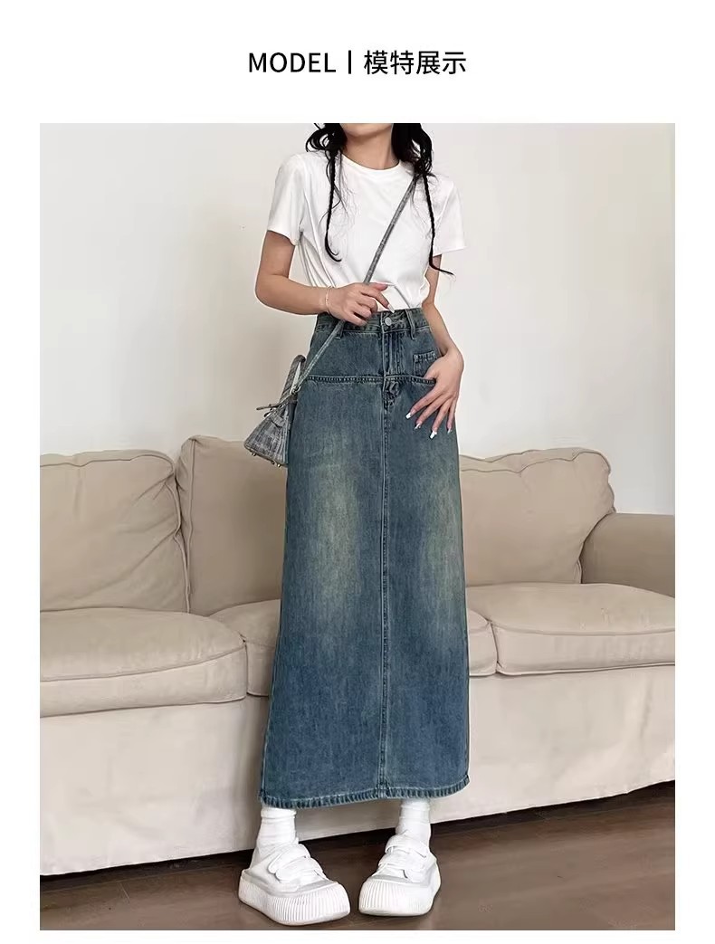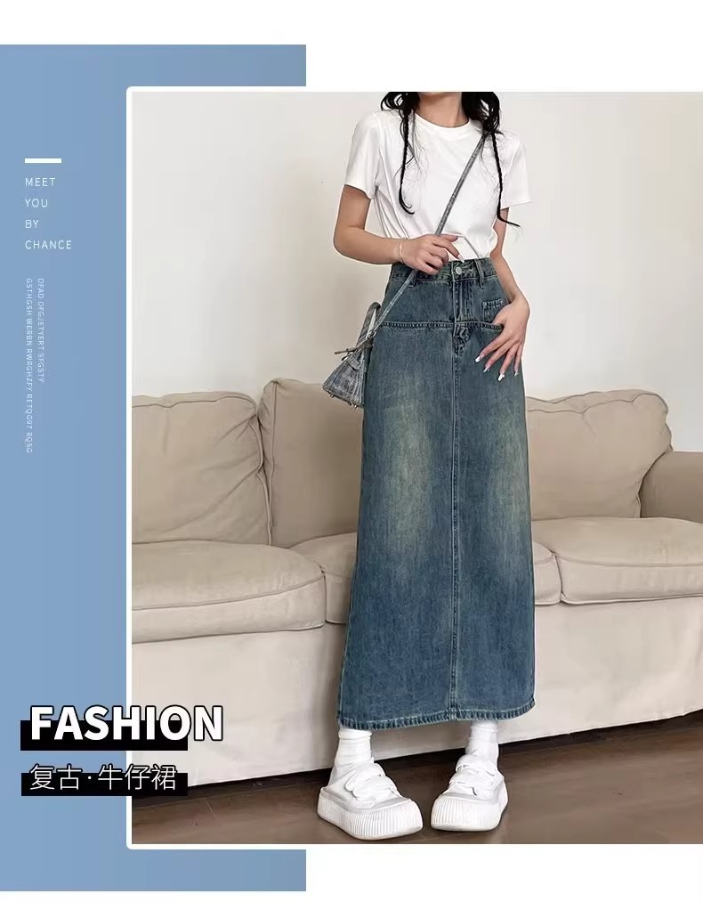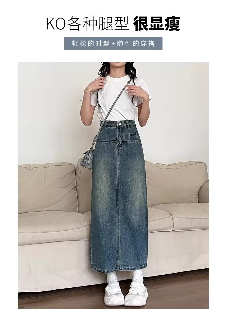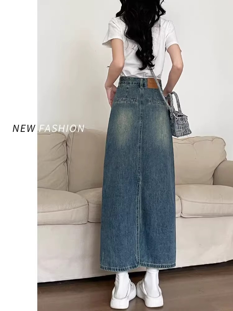 复古牛仔半身裙女夏季2024年新款高腰遮跨中长款后开叉a字裙夏季