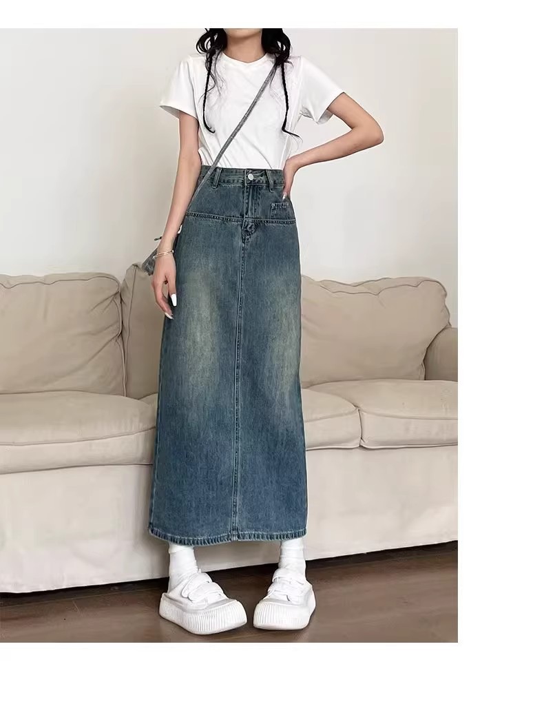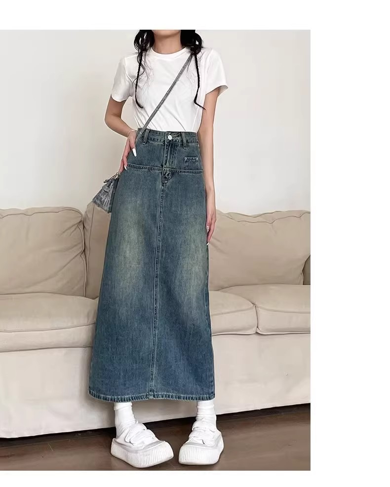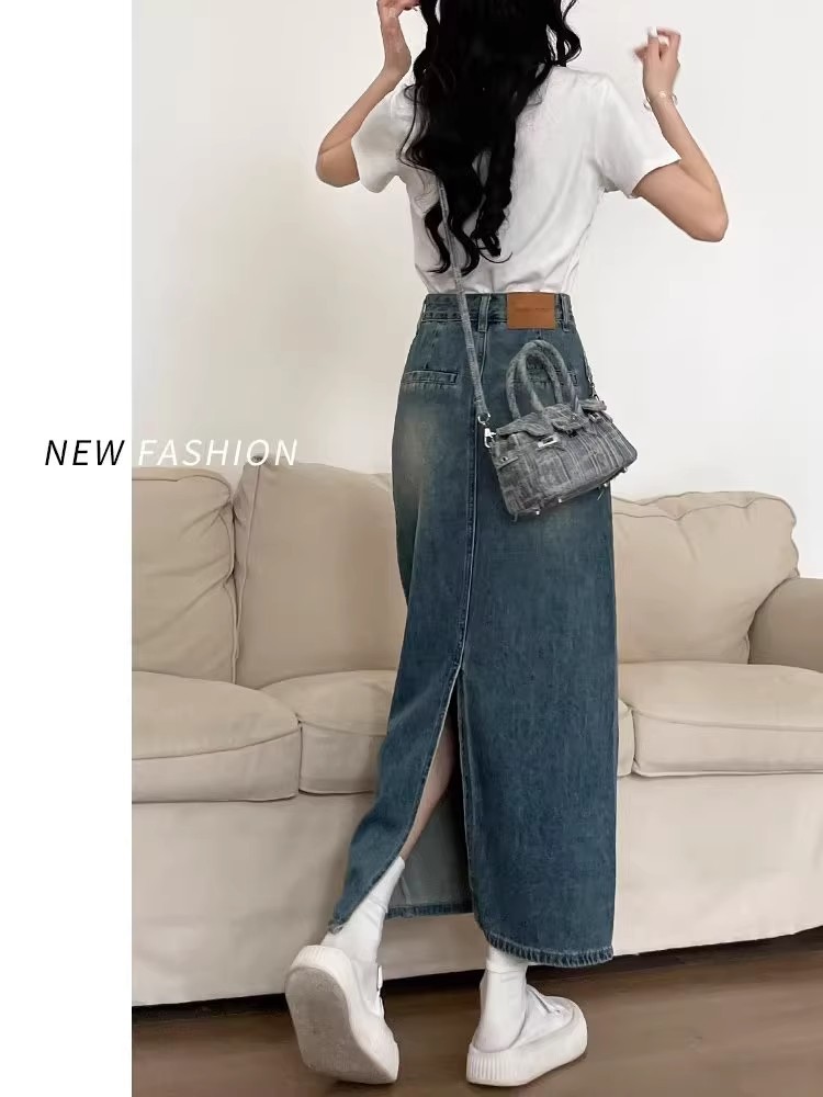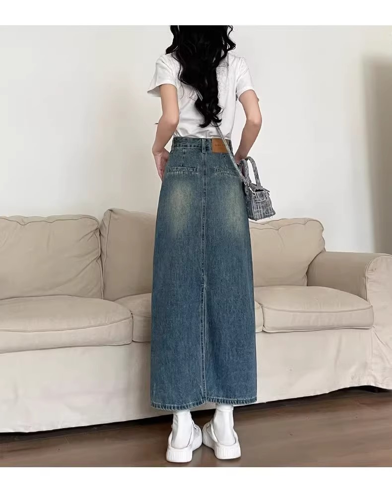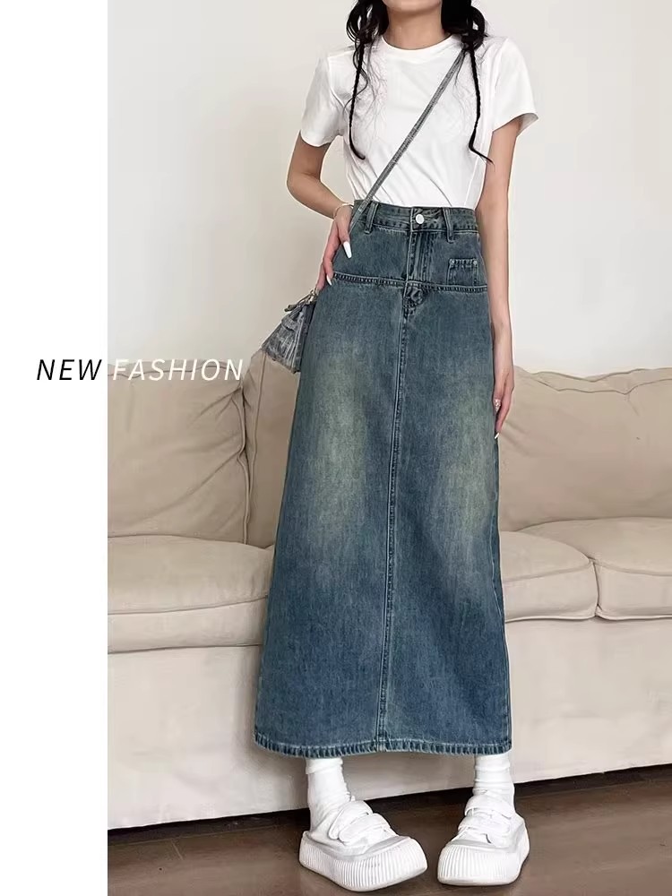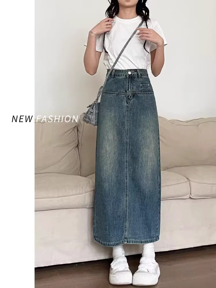 复古牛仔半身裙女夏季2024年新款高腰遮跨中长款后开叉a字裙夏季
