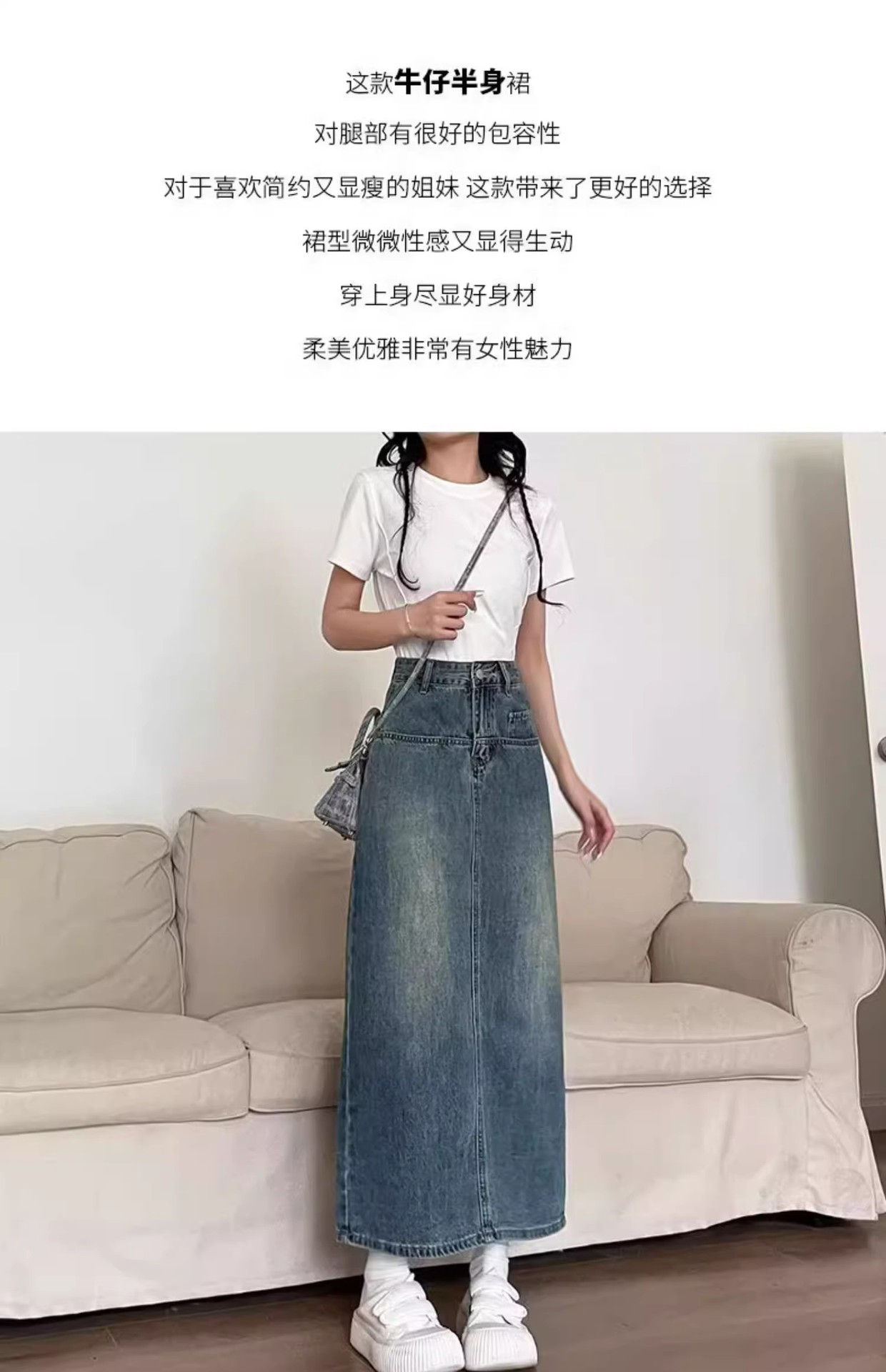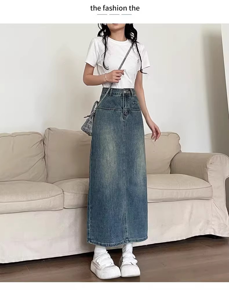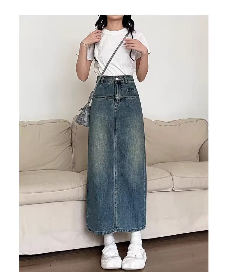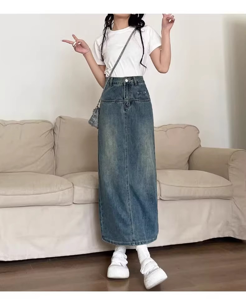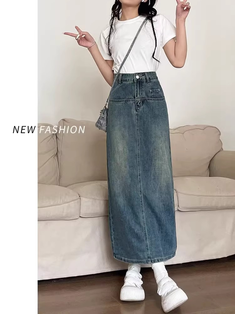 复古牛仔半身裙女夏季2024年新款高腰遮跨中长款后开叉a字裙夏季
