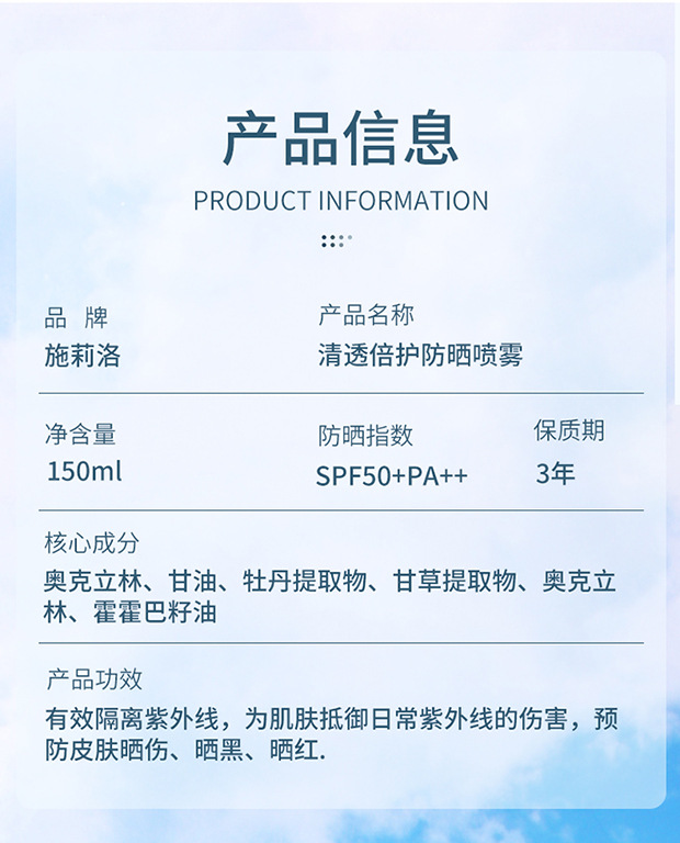 「第2瓶半价!冰感防晒」施莉洛清透倍护防晒喷雾 面部全身可用补水保湿防晒乳美容护肤