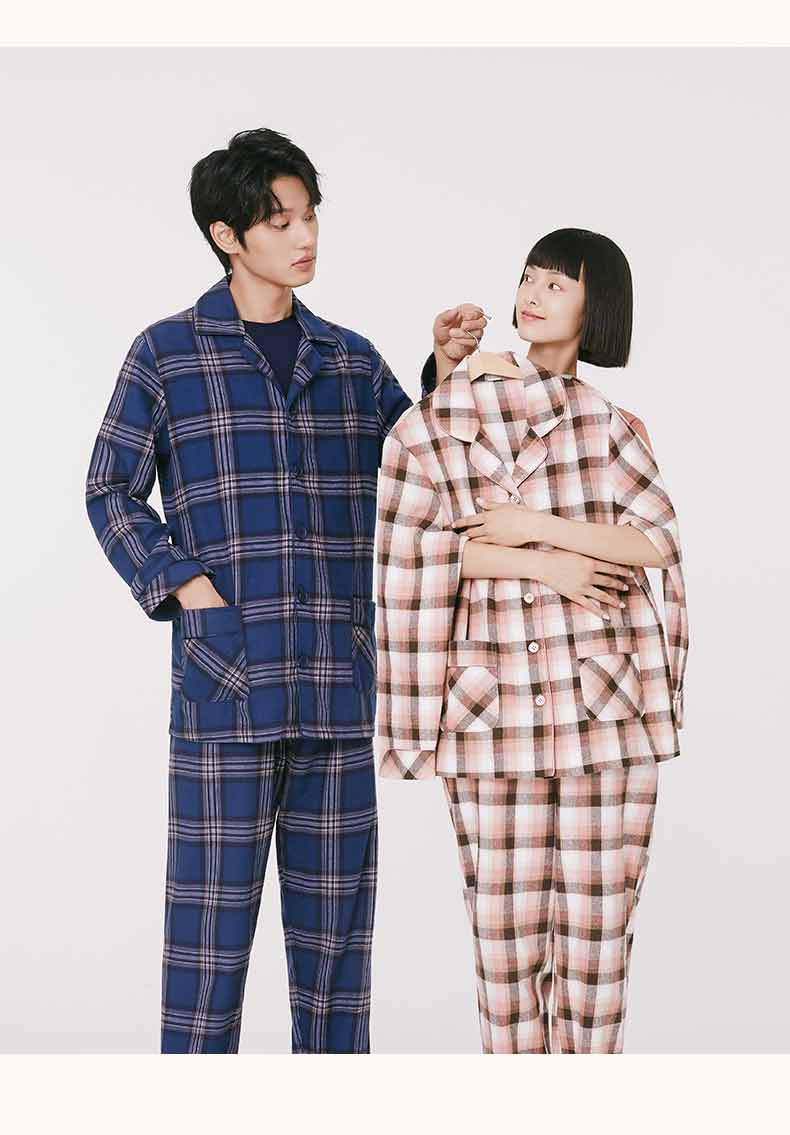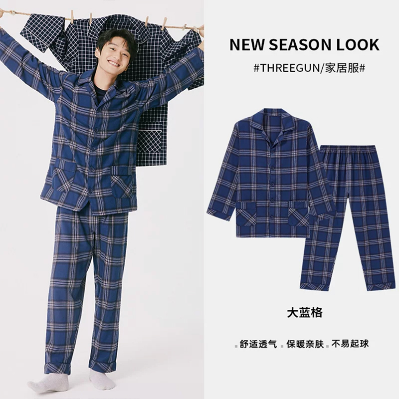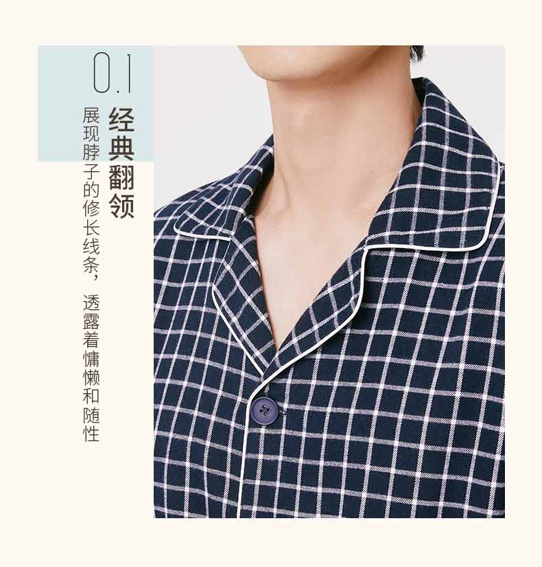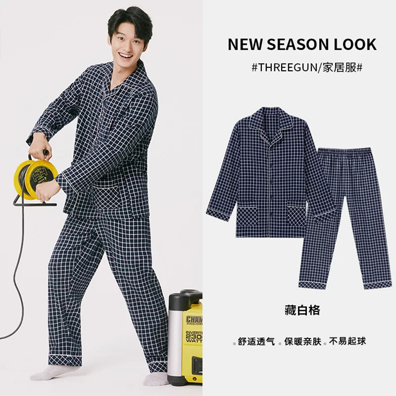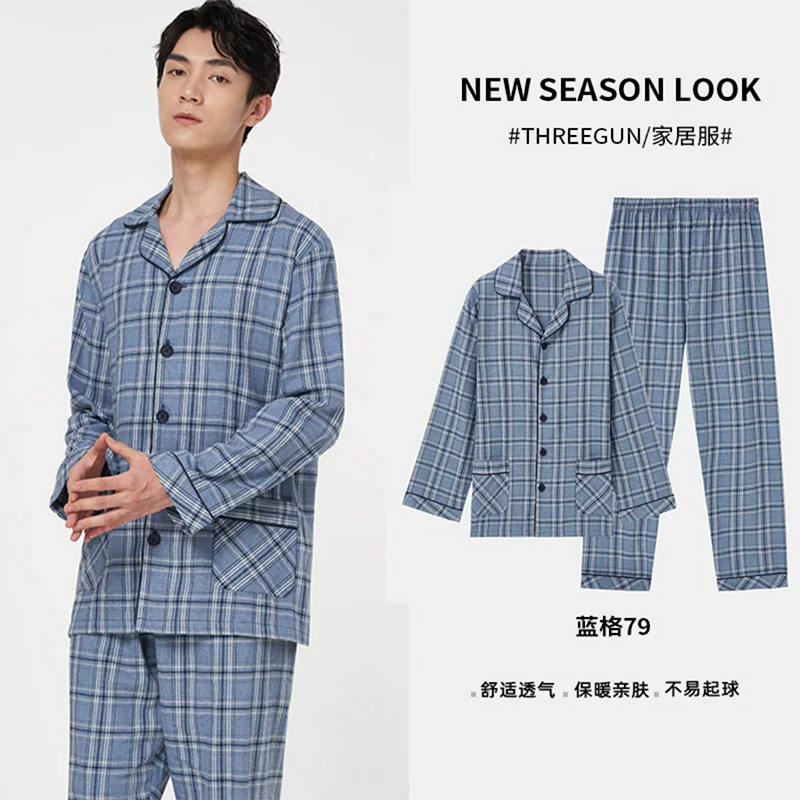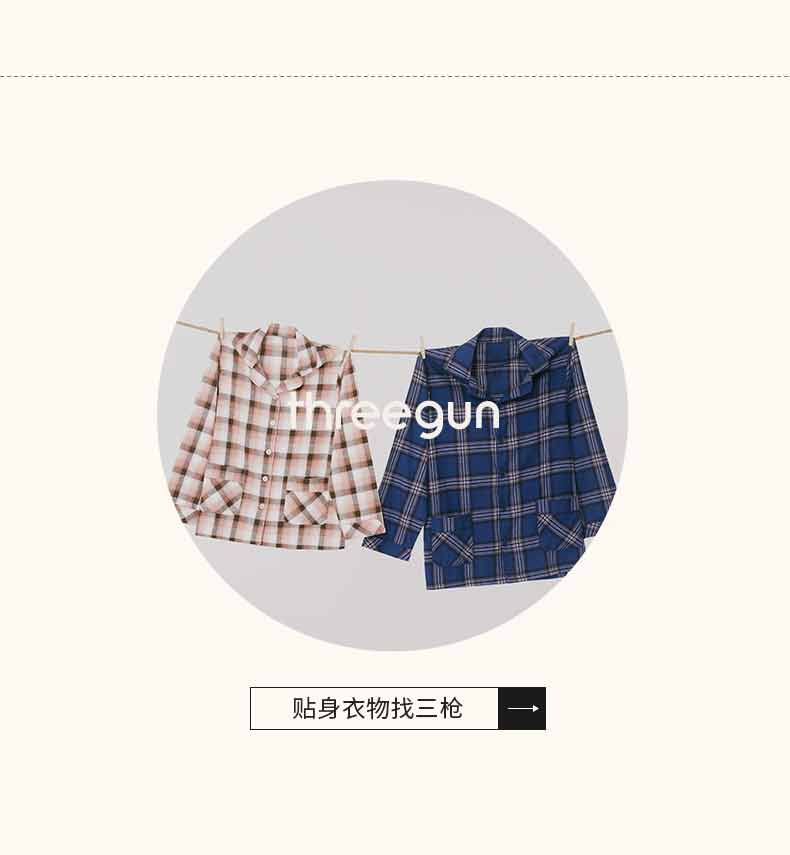 Threegun三枪 【彩格绒布】翻领开襟男士休闲家居套家居服-80517D211