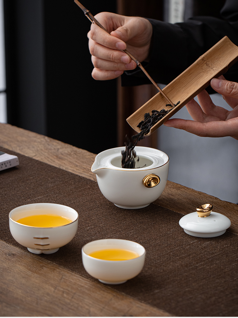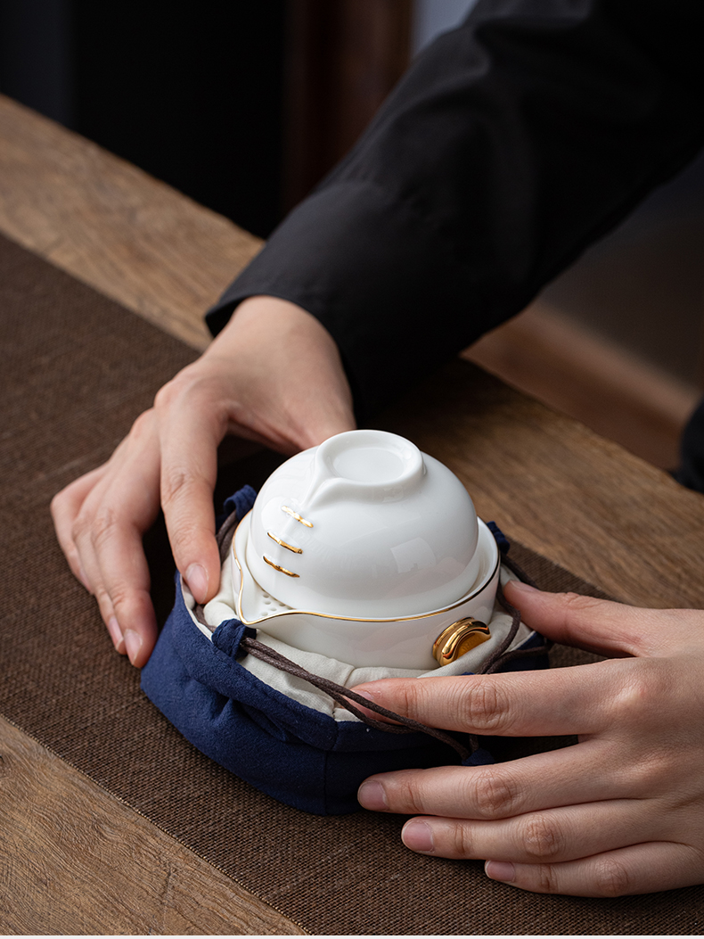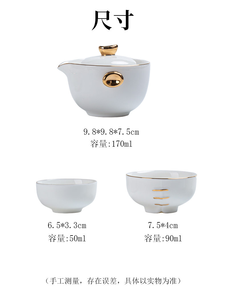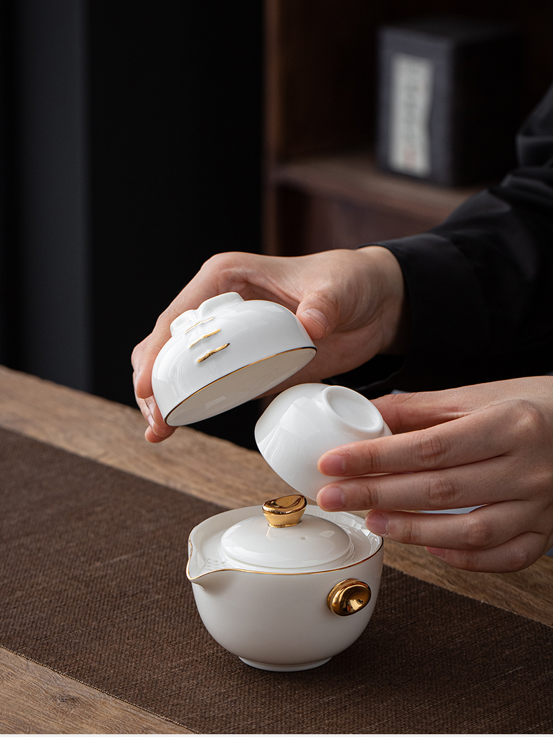 羊脂玉白瓷旅行茶具套装快客杯一壶二杯便携式户外茶具随身高端吉祥三宝 描金快客杯