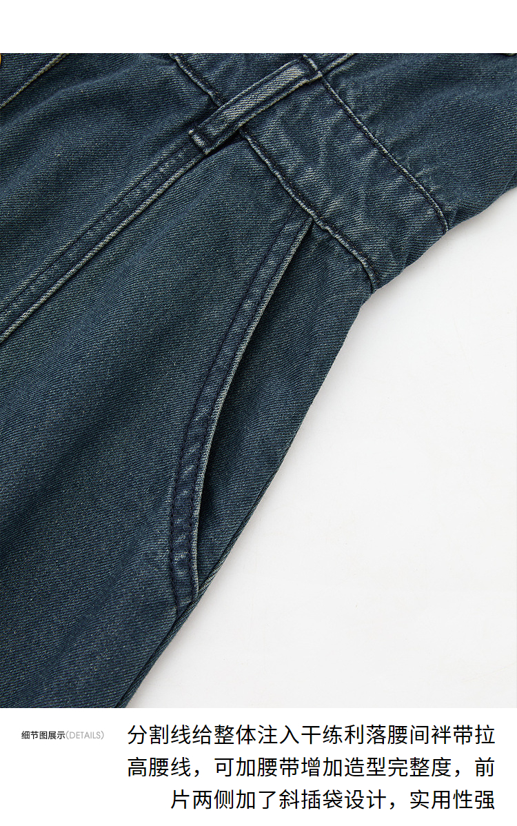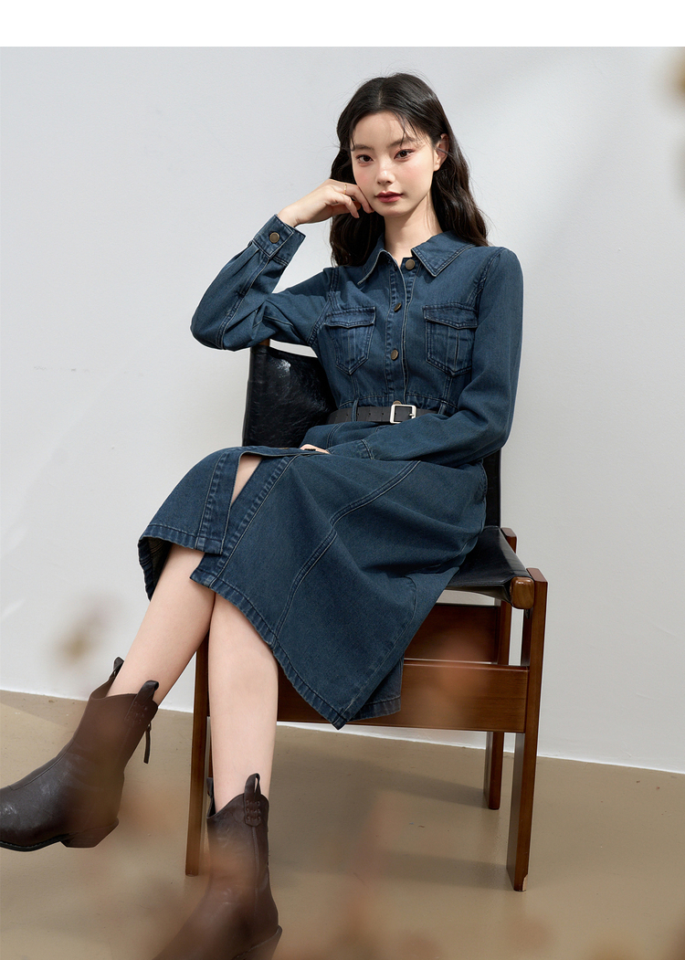 西遇长袖牛仔连衣裙女新款翻领港风复古收腰A字长裙13442547