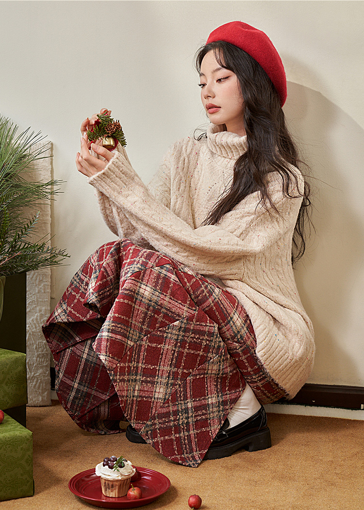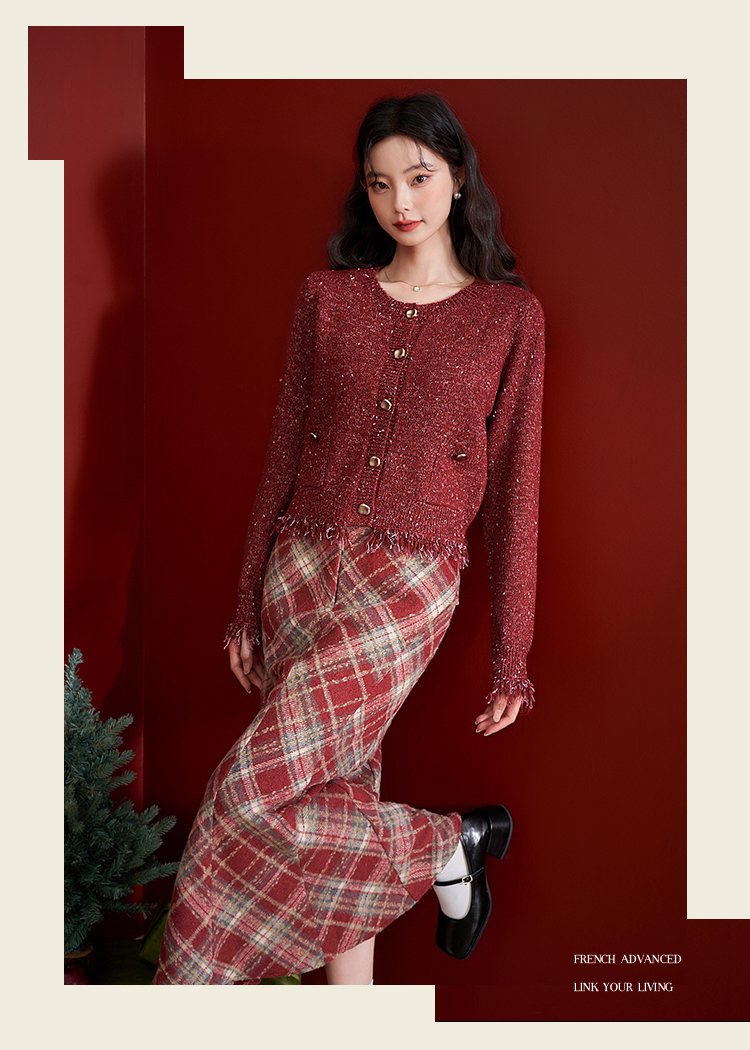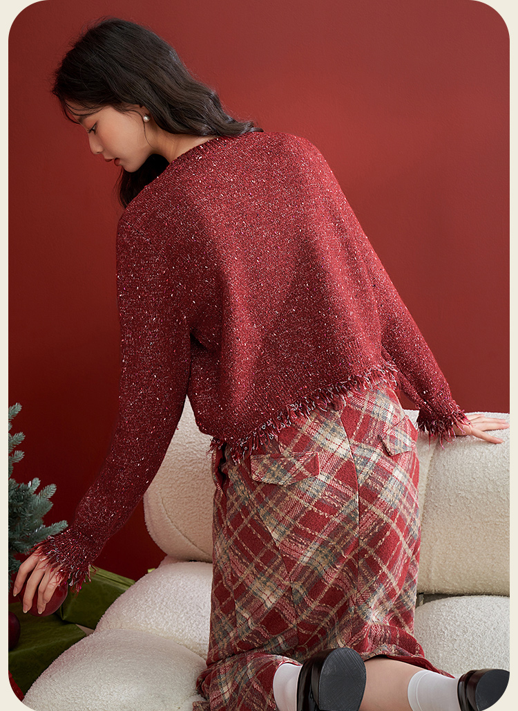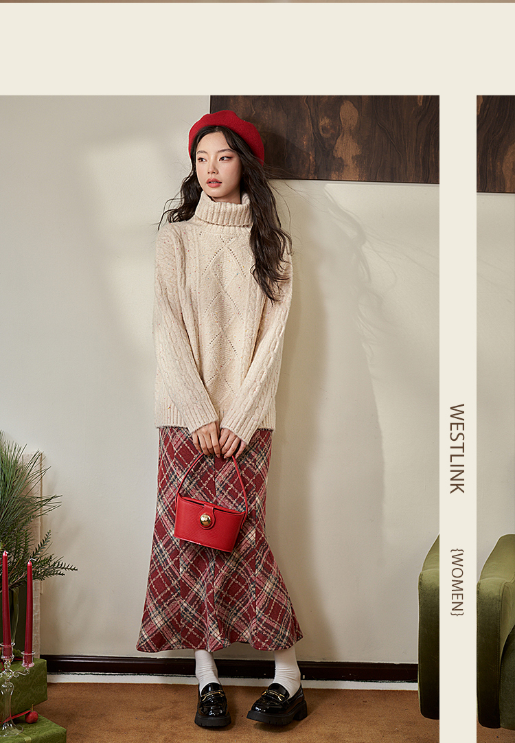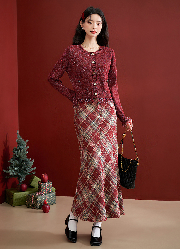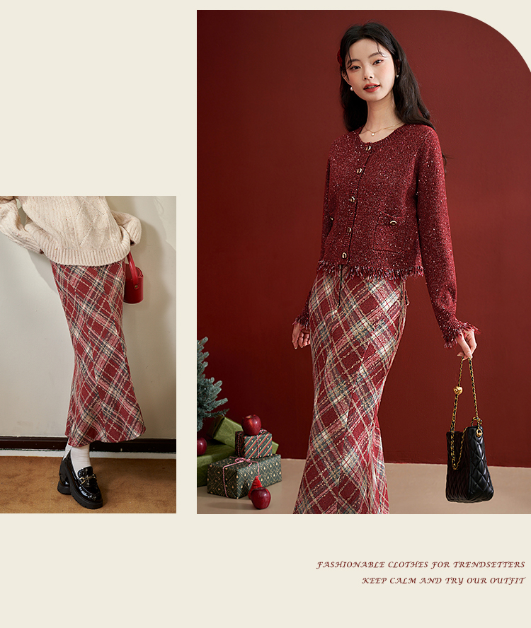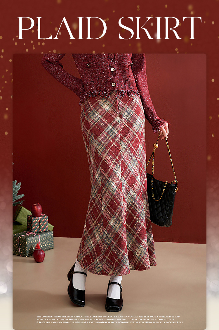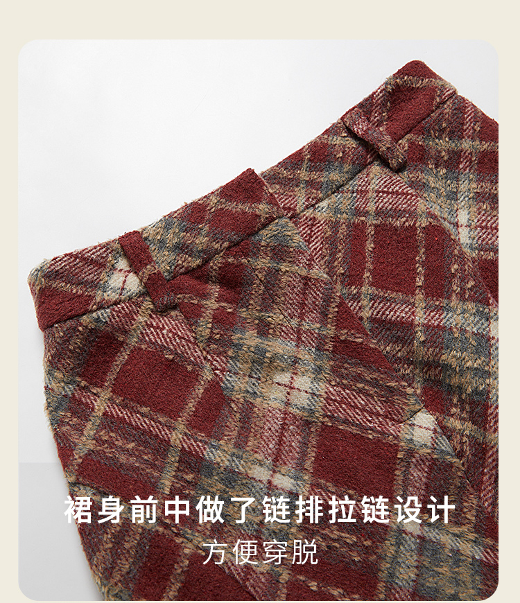 西遇英伦学院风红色格纹半身裙女新款高腰包臀复古鱼尾裙10240044