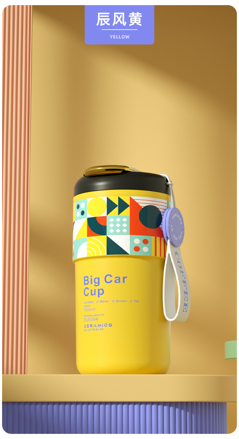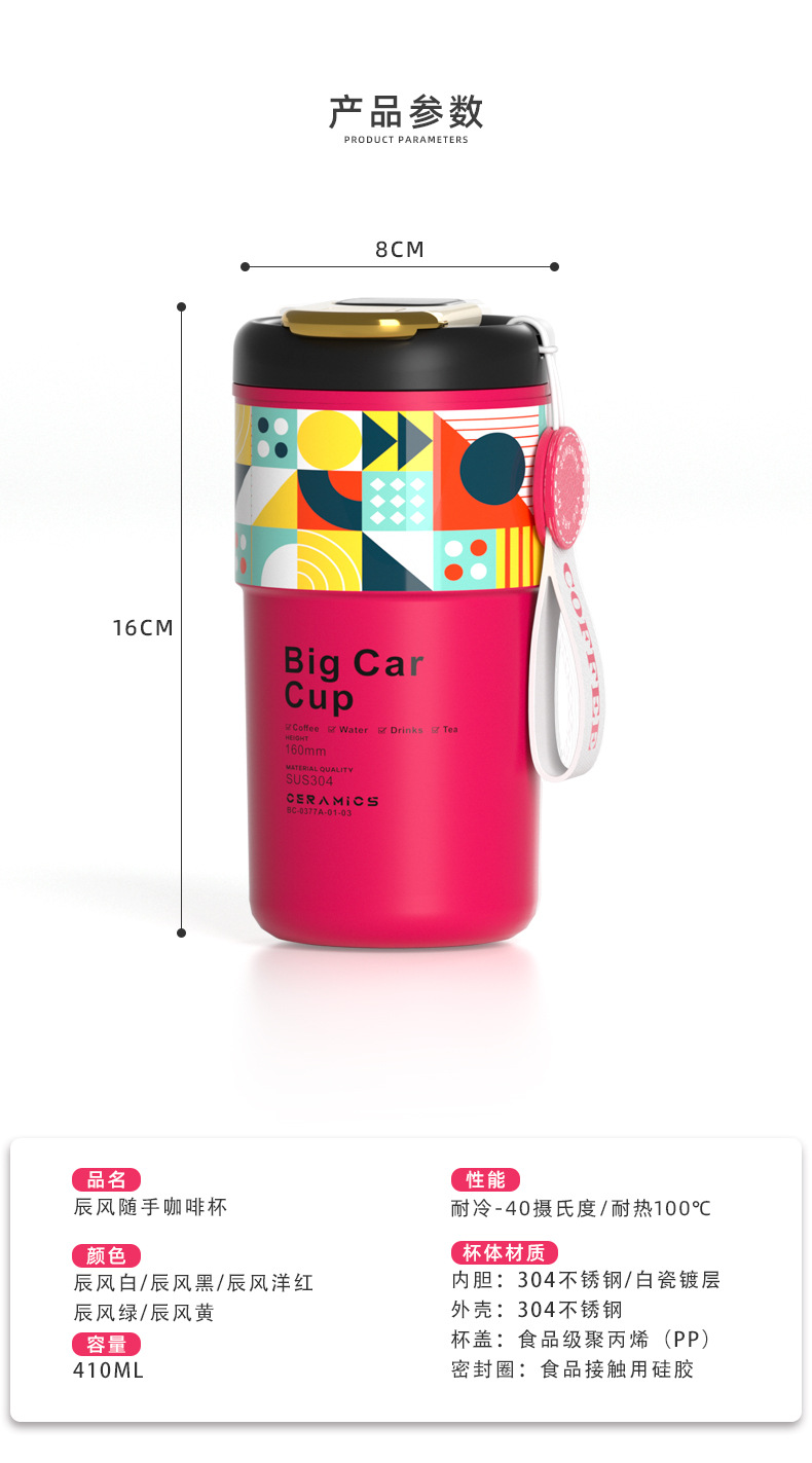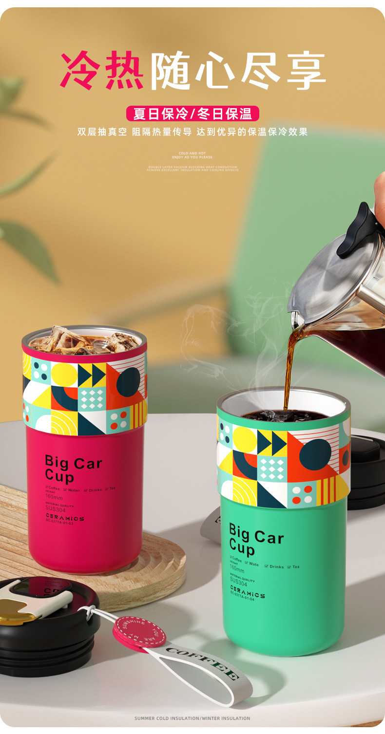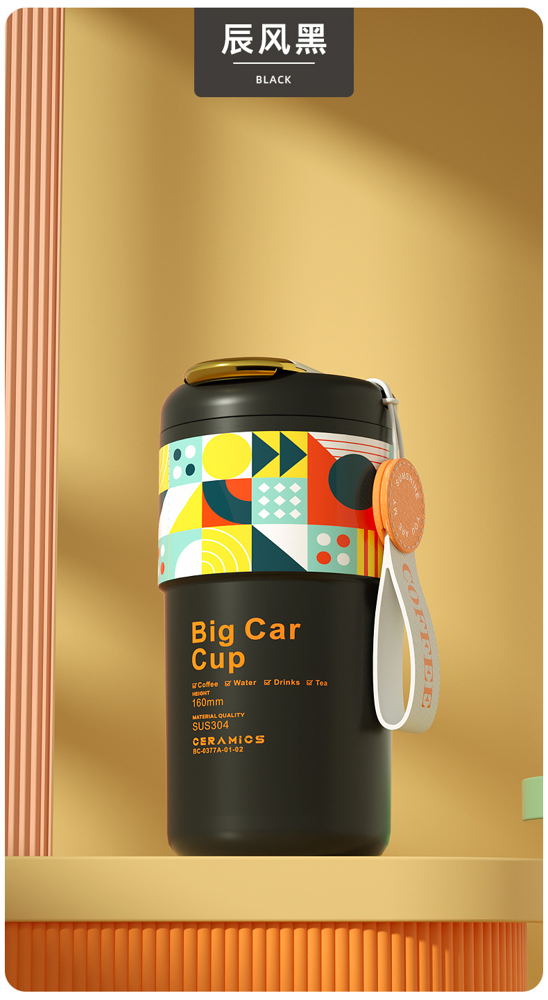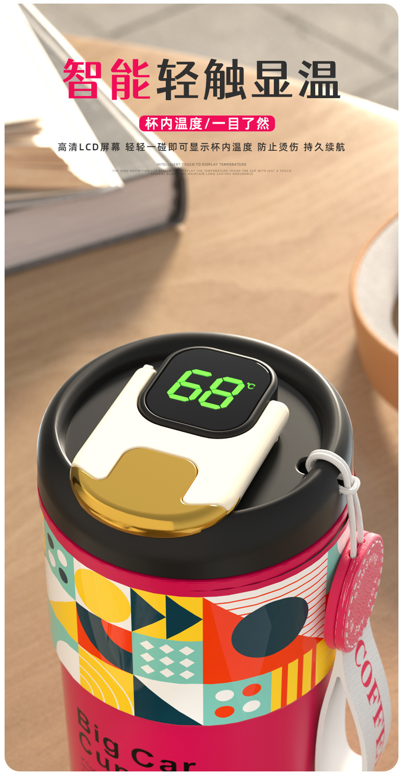 「5色可选!智能数显」智能陶瓷内胆咖啡杯便携颜值保温杯带提绳智能测温不锈钢随行杯餐饮用具