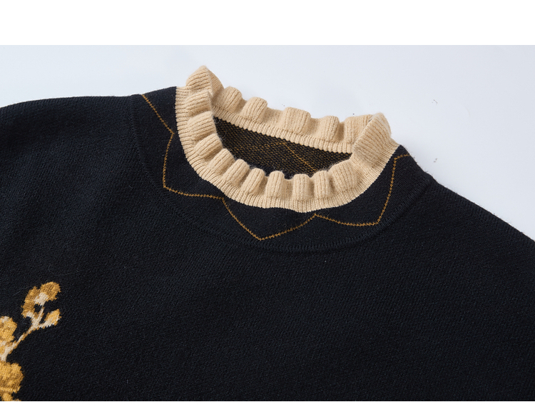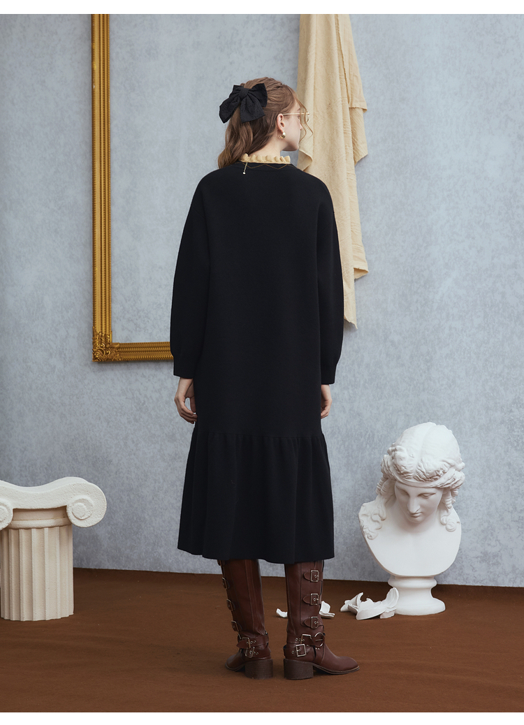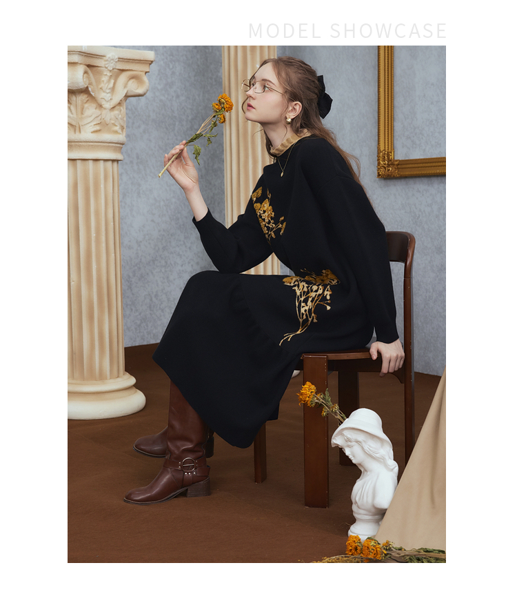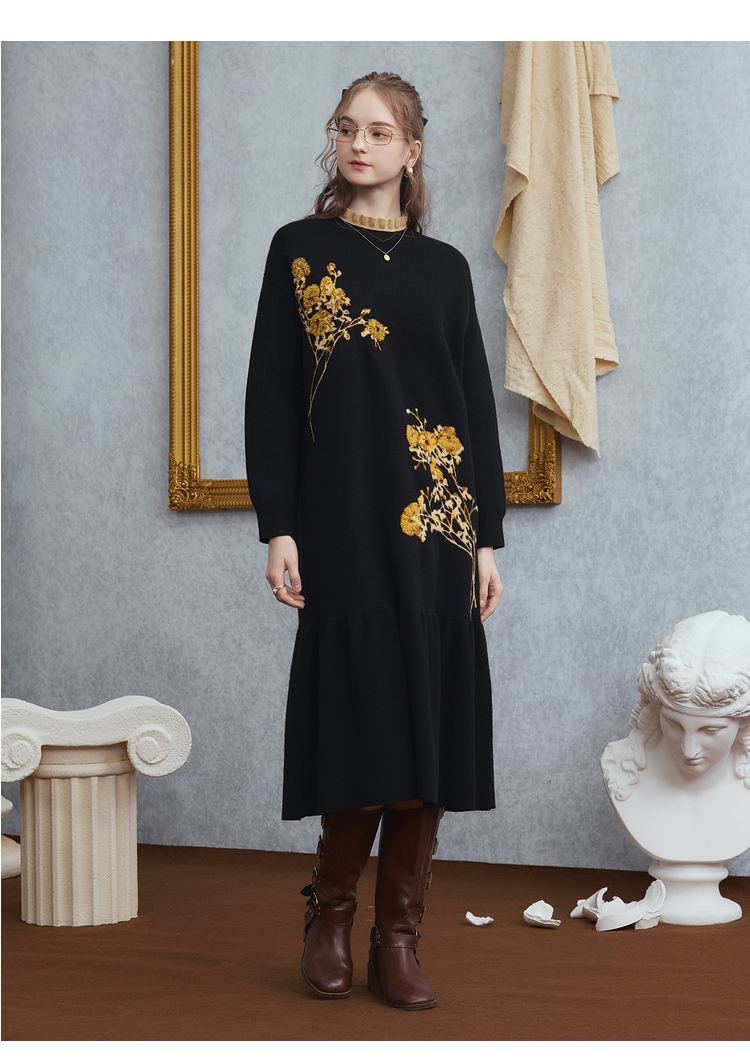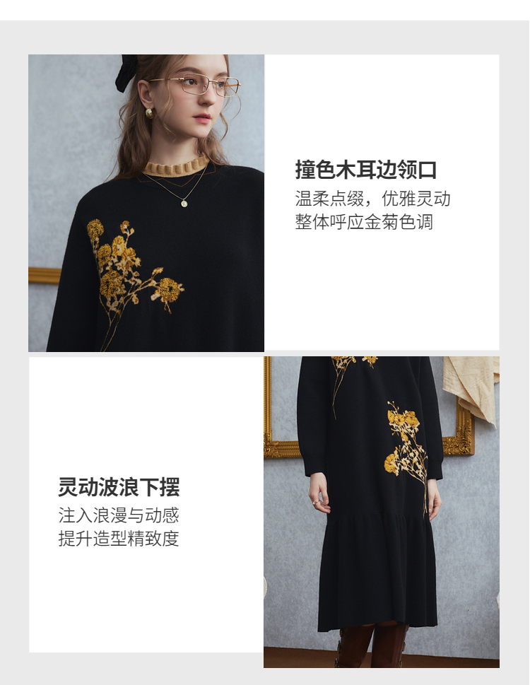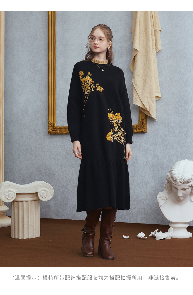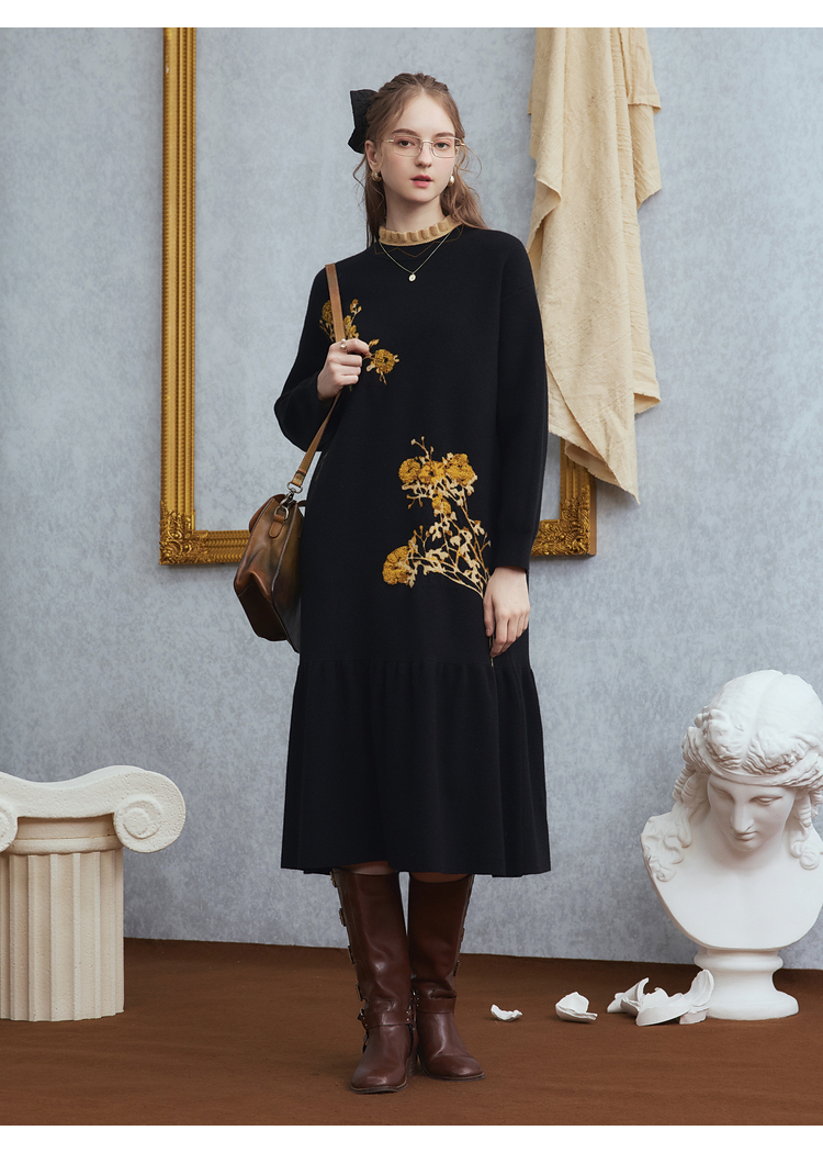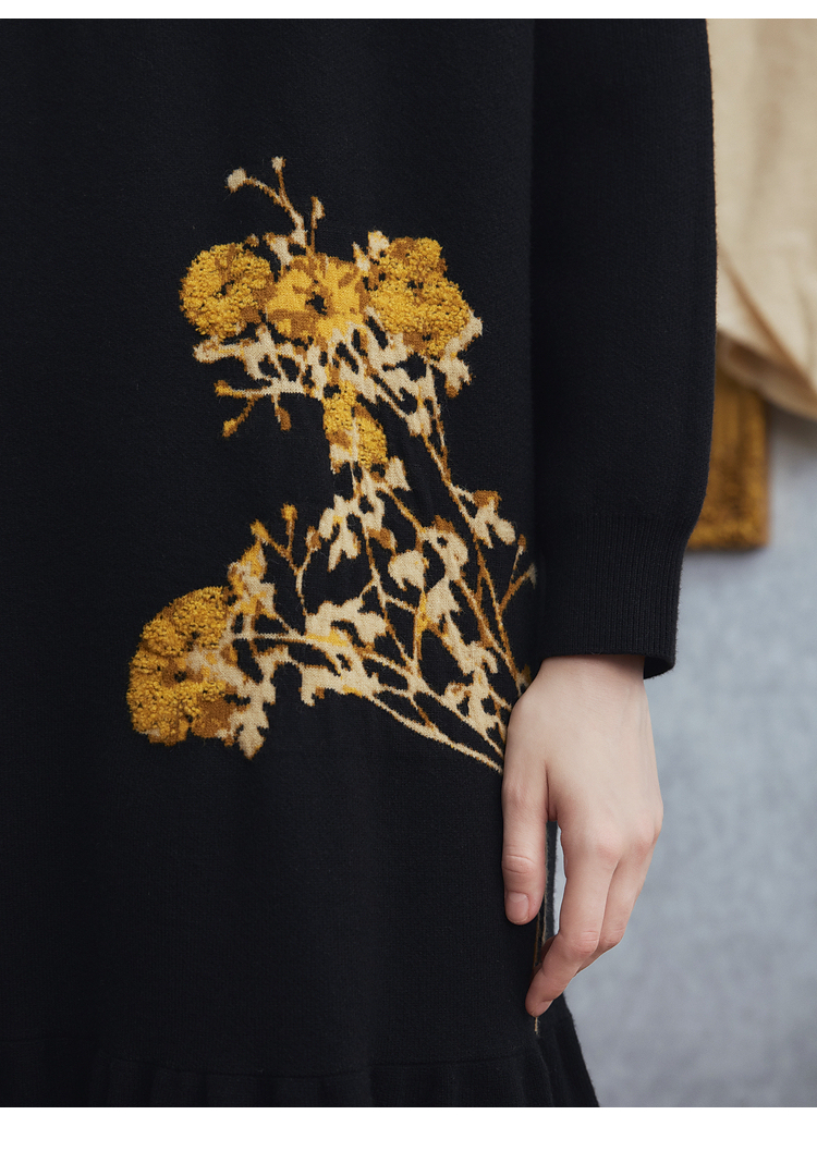 两三事未尽之秋2025冬季新款花卉图案荷叶边领针织连衣裙梵高文艺