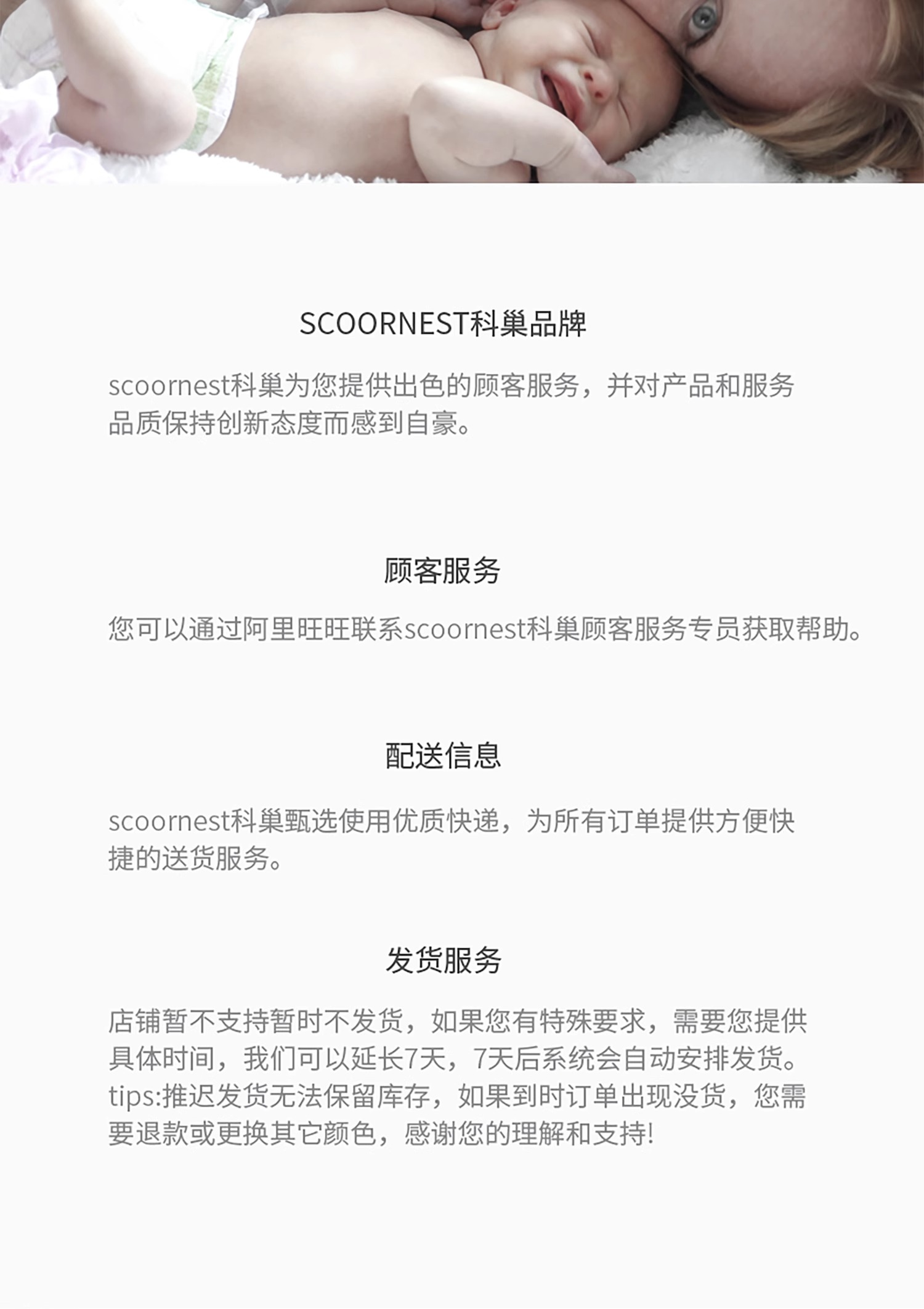 - Scoornest始终秉承给每一位宝宝送去科学的、关心的、创新的成长体验,通过提供商品和服务,使顾客形成守护、发展、巩固这种弥足珍贵的亲情的爱。