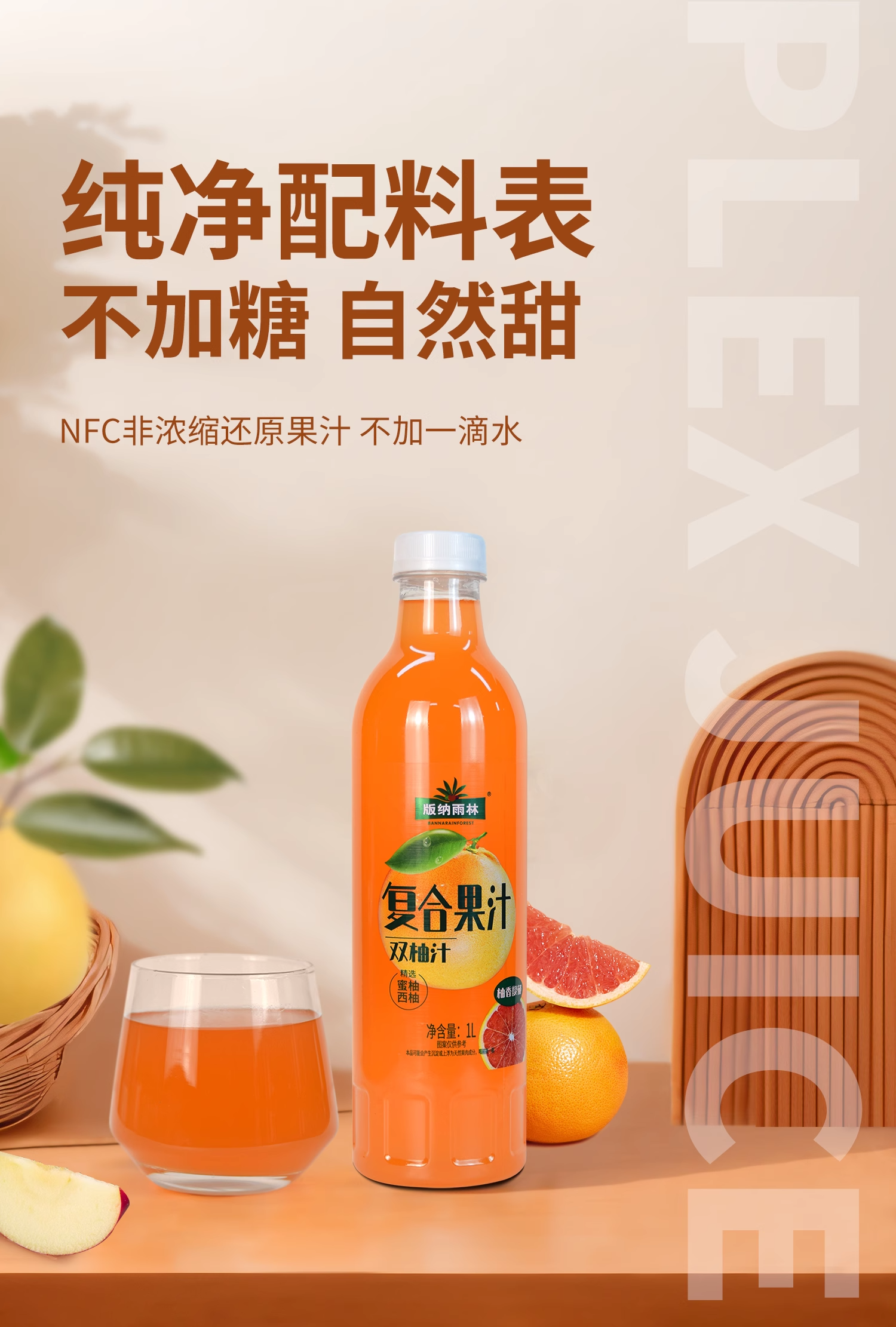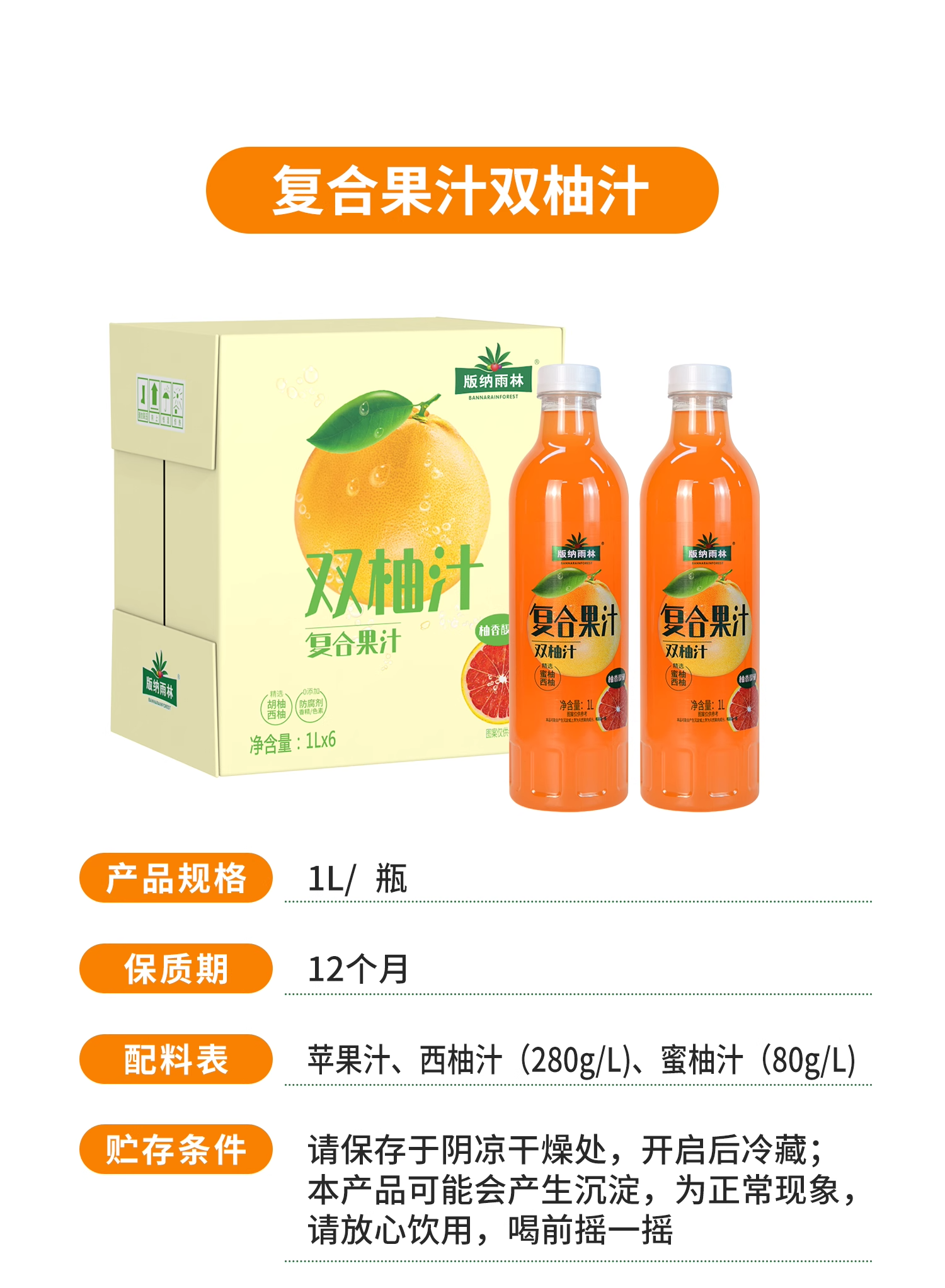 版纳雨林1L双柚复合果汁1L*6瓶【XPTX】