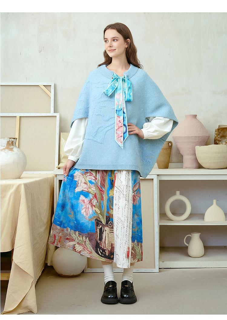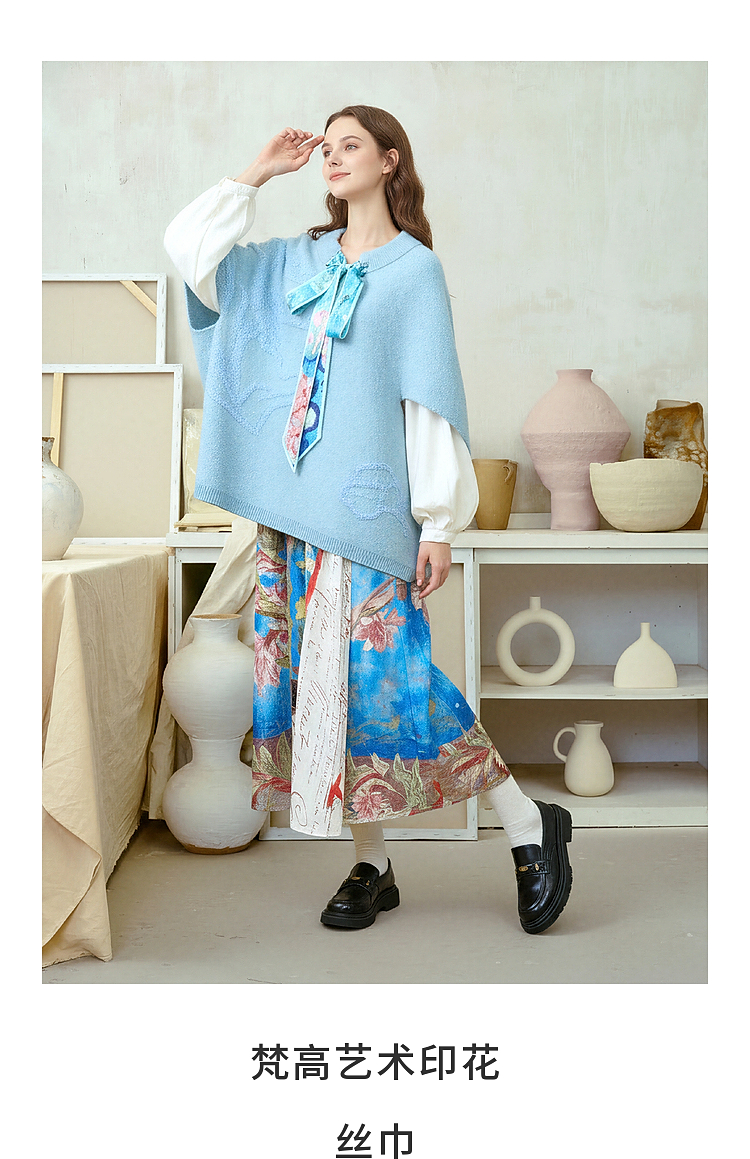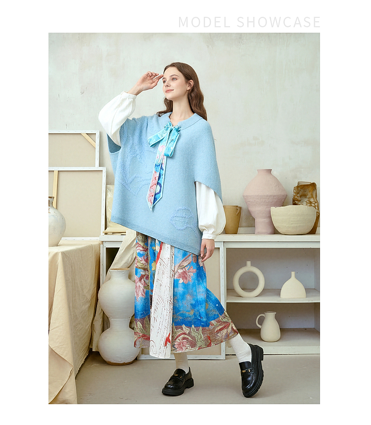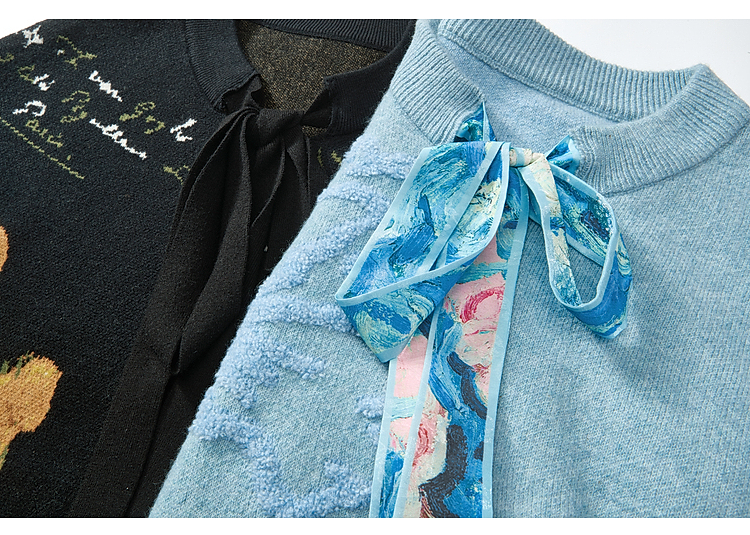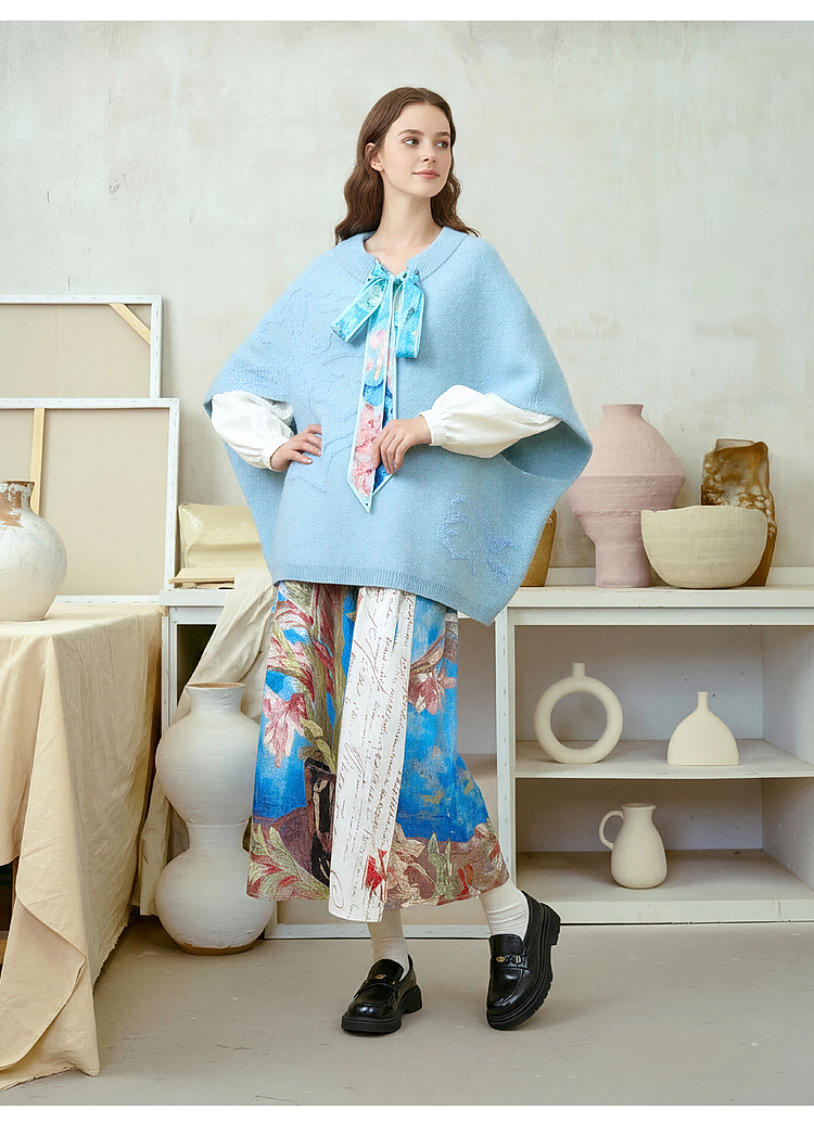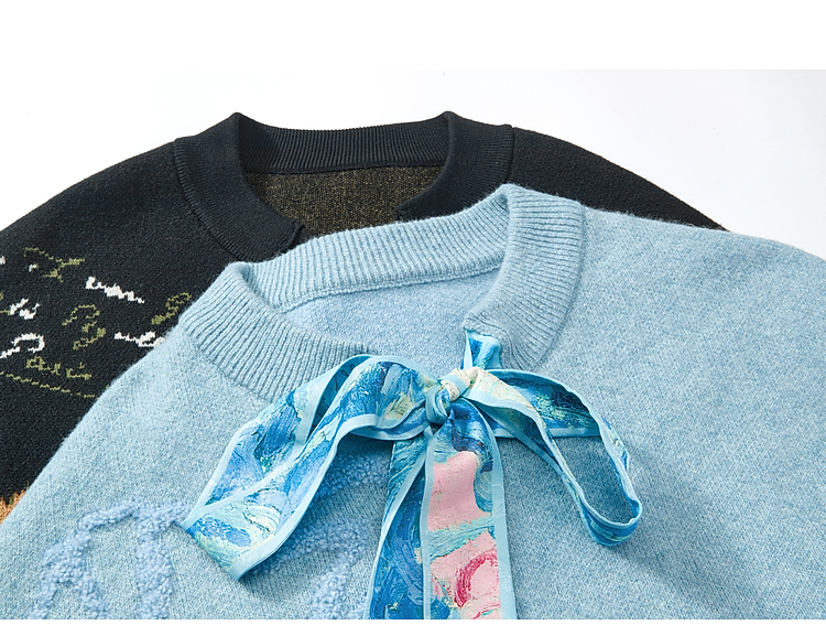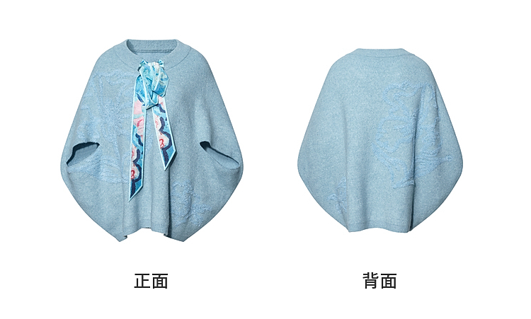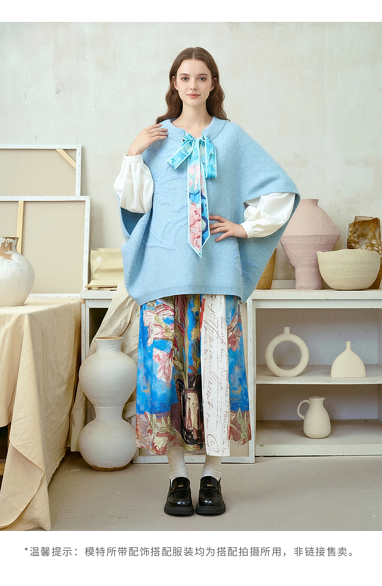 两三事梵高文艺 碧空云绒 2026春季新款绑带毛巾绣蝙蝠袖针织衫女