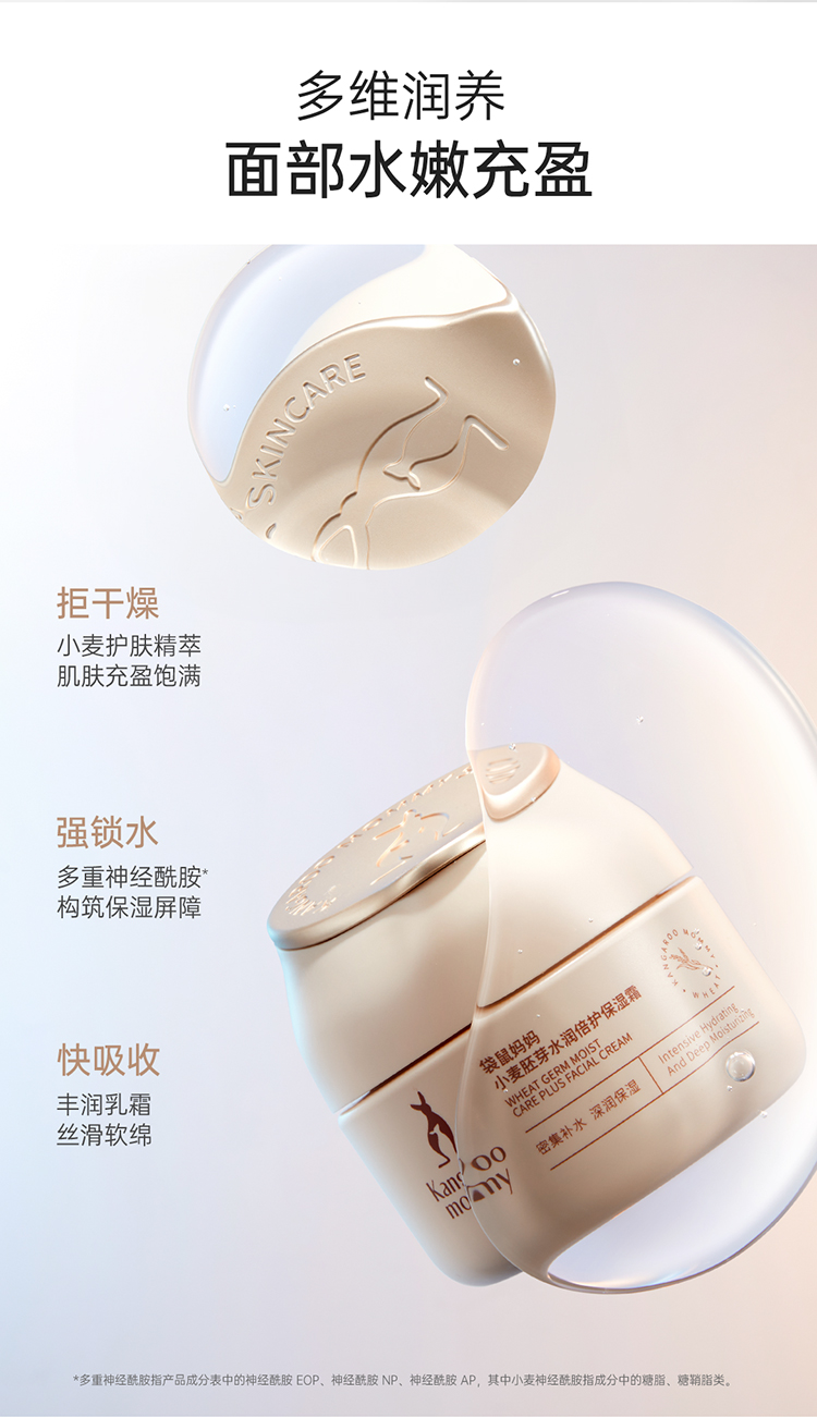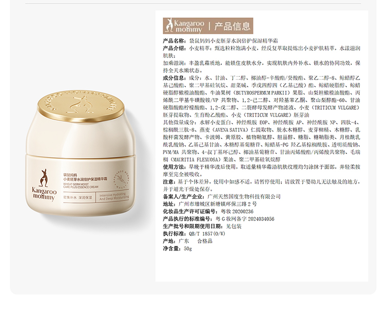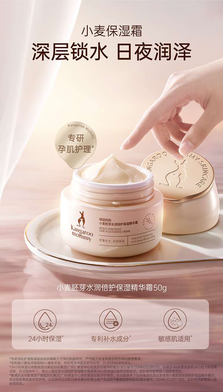 袋鼠妈妈 小麦胚芽水润倍护保湿精华霜50g 大干皮补水必入!多效锁水 24H高保湿 舒缓干燥脆弱