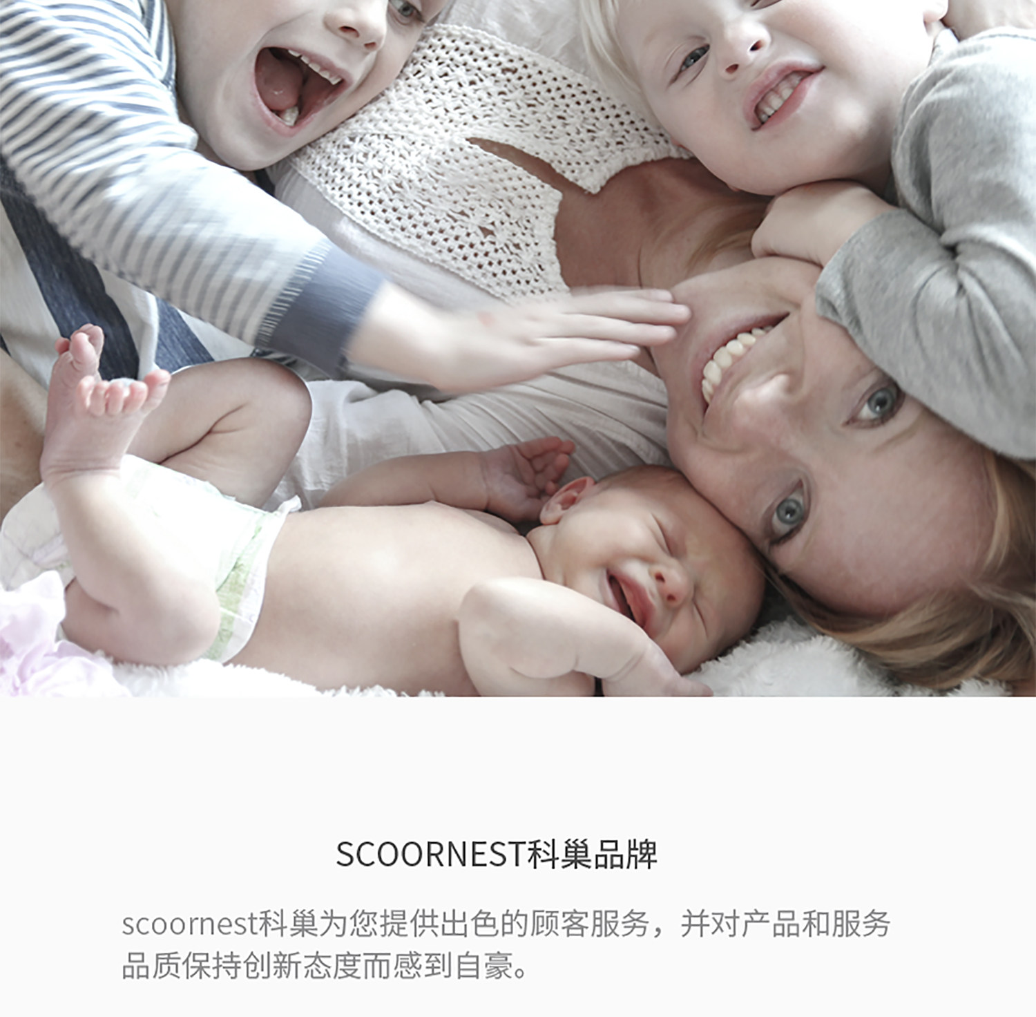 - Scoornest始终秉承给每一位宝宝送去科学的、关心的、创新的成长体验,通过提供商品和服务,使顾客形成守护、发展、巩固这种弥足珍贵的亲情的爱。