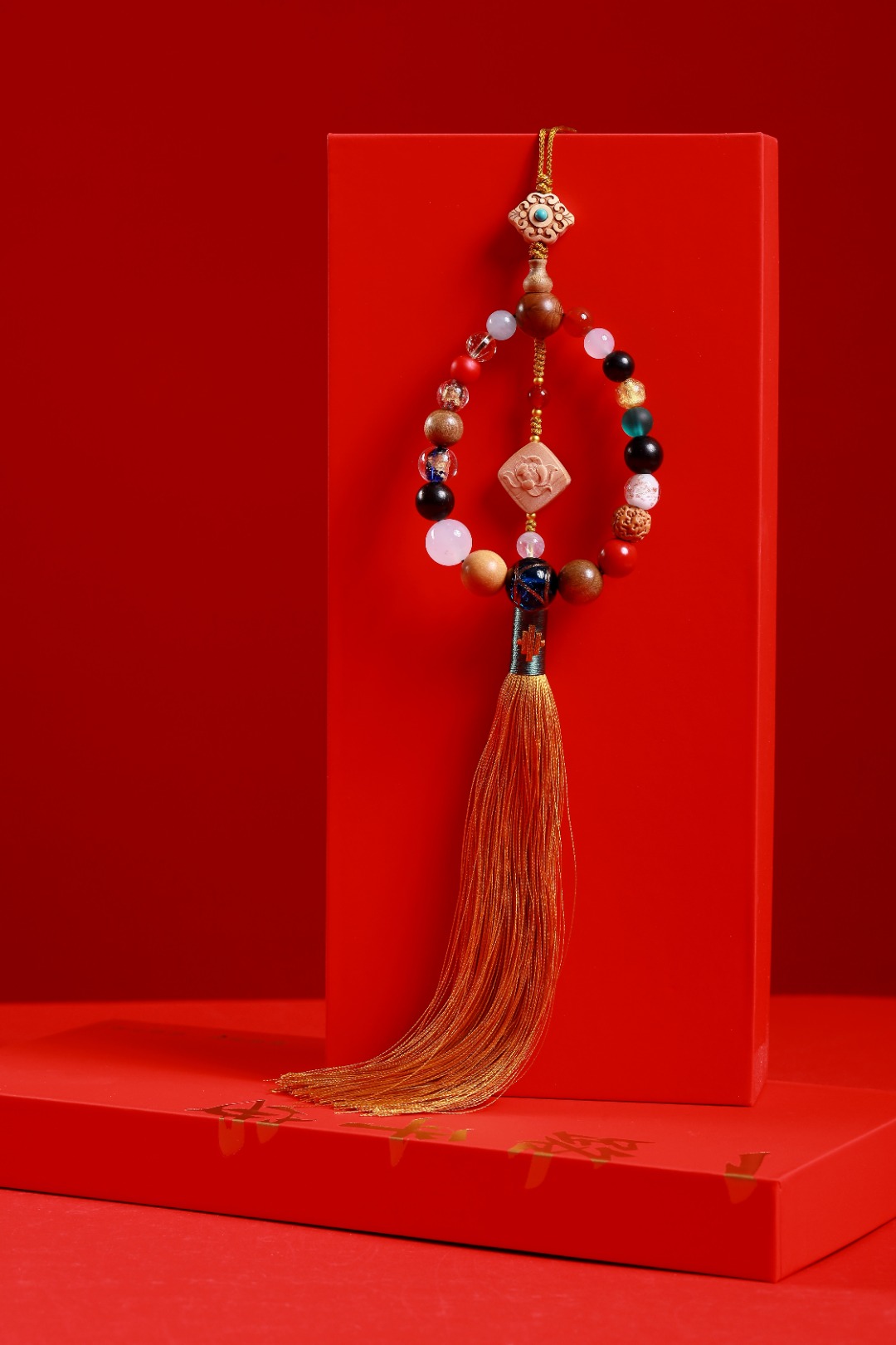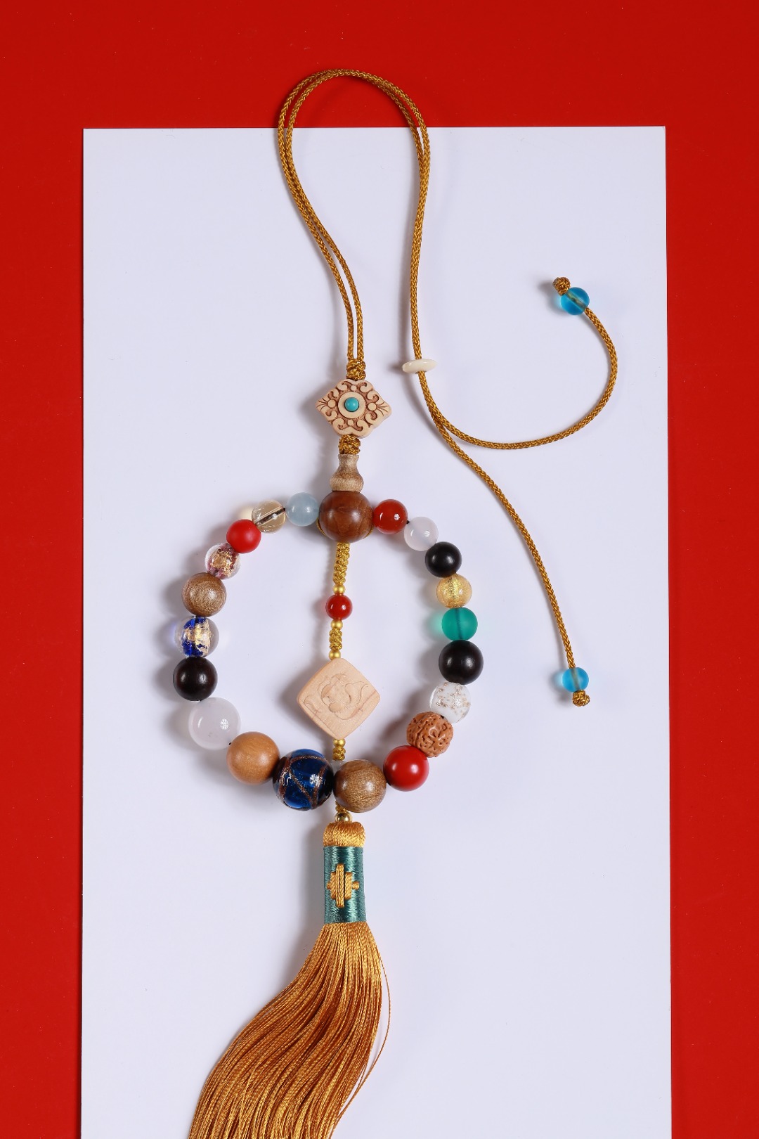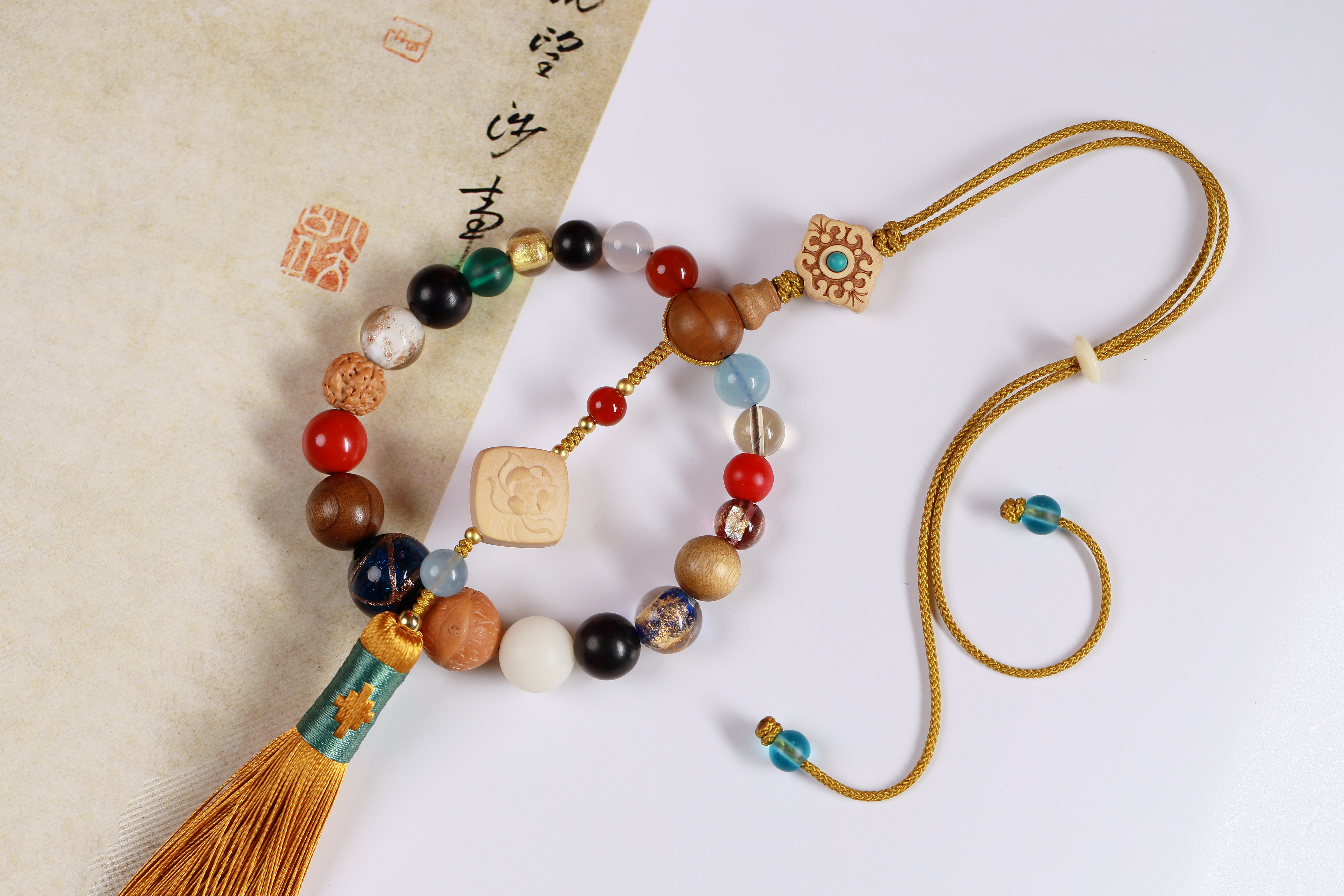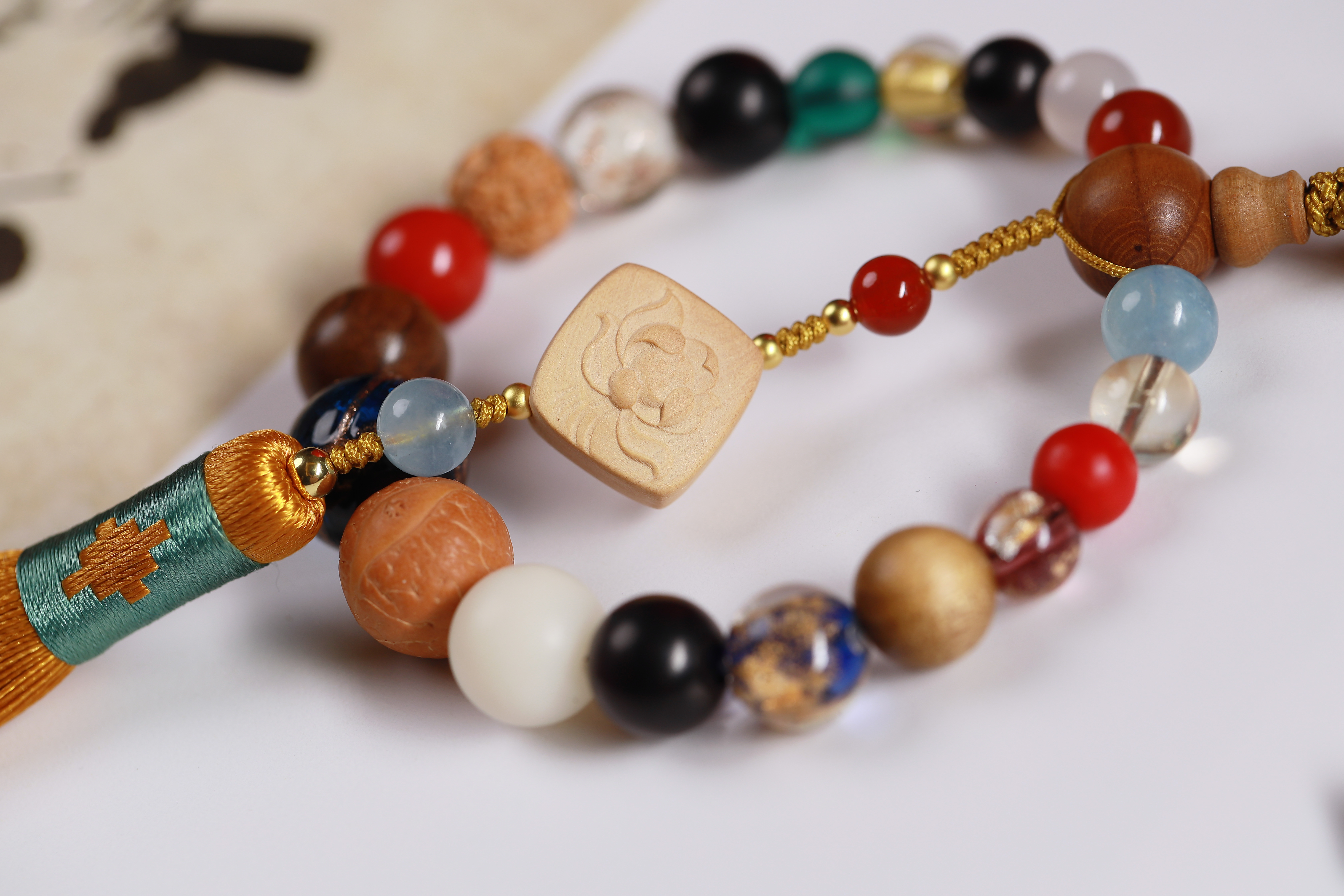 配件:六道木三通/金丝楠佛塔/紫光檀/凤眼菩提/白菩提根/老料金丝楠/红玛瑙/白玛瑙/黄水晶/海蓝宝/红琉璃雪巴/朱砂/金刚菩提/琉璃绿/蓝/黄杨木镶绿松尖角如意/黄杨木方块莲花/象牙果隔片/铜珠/透明香灰珠/香灰珠蓝/丰字单流苏(黄)