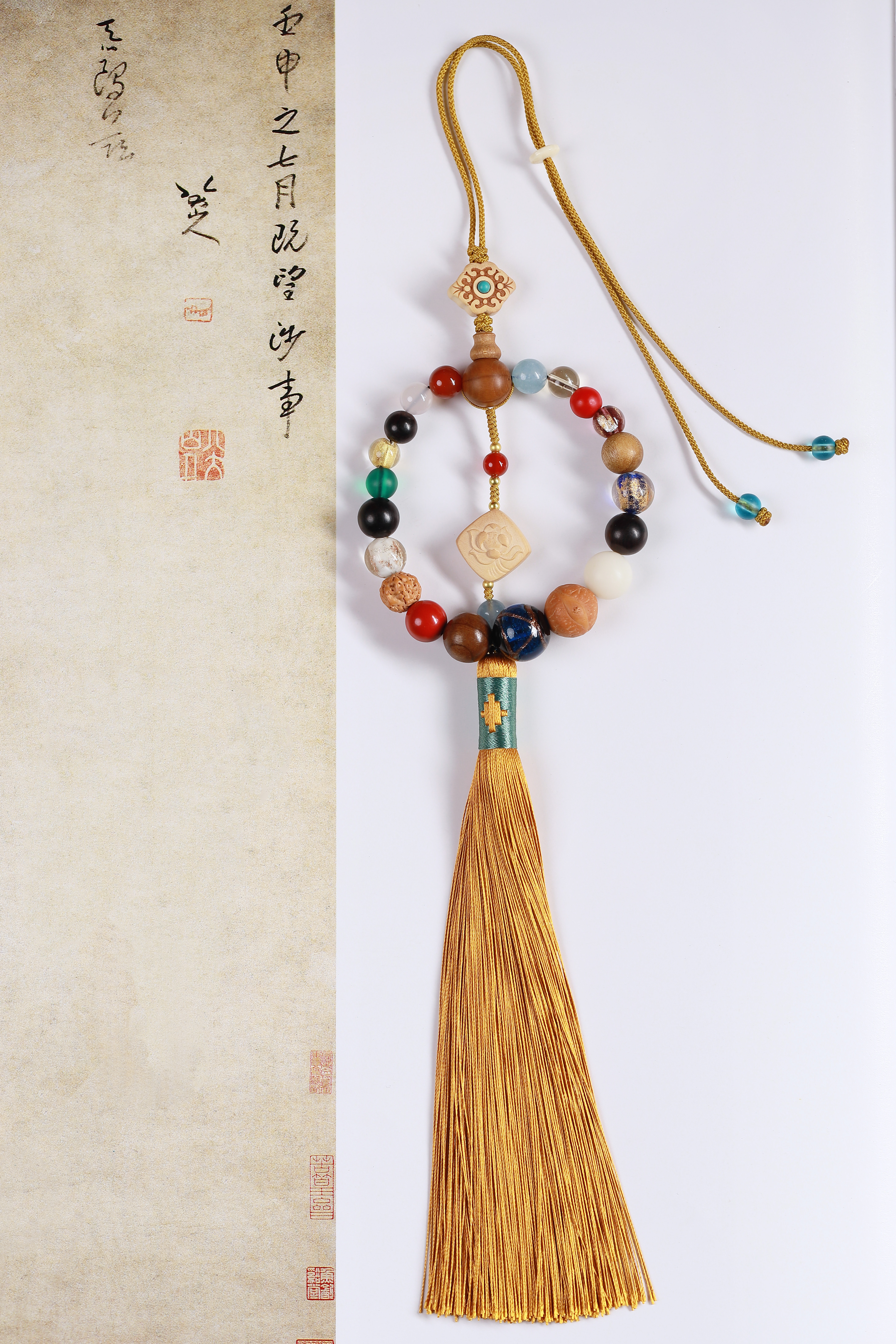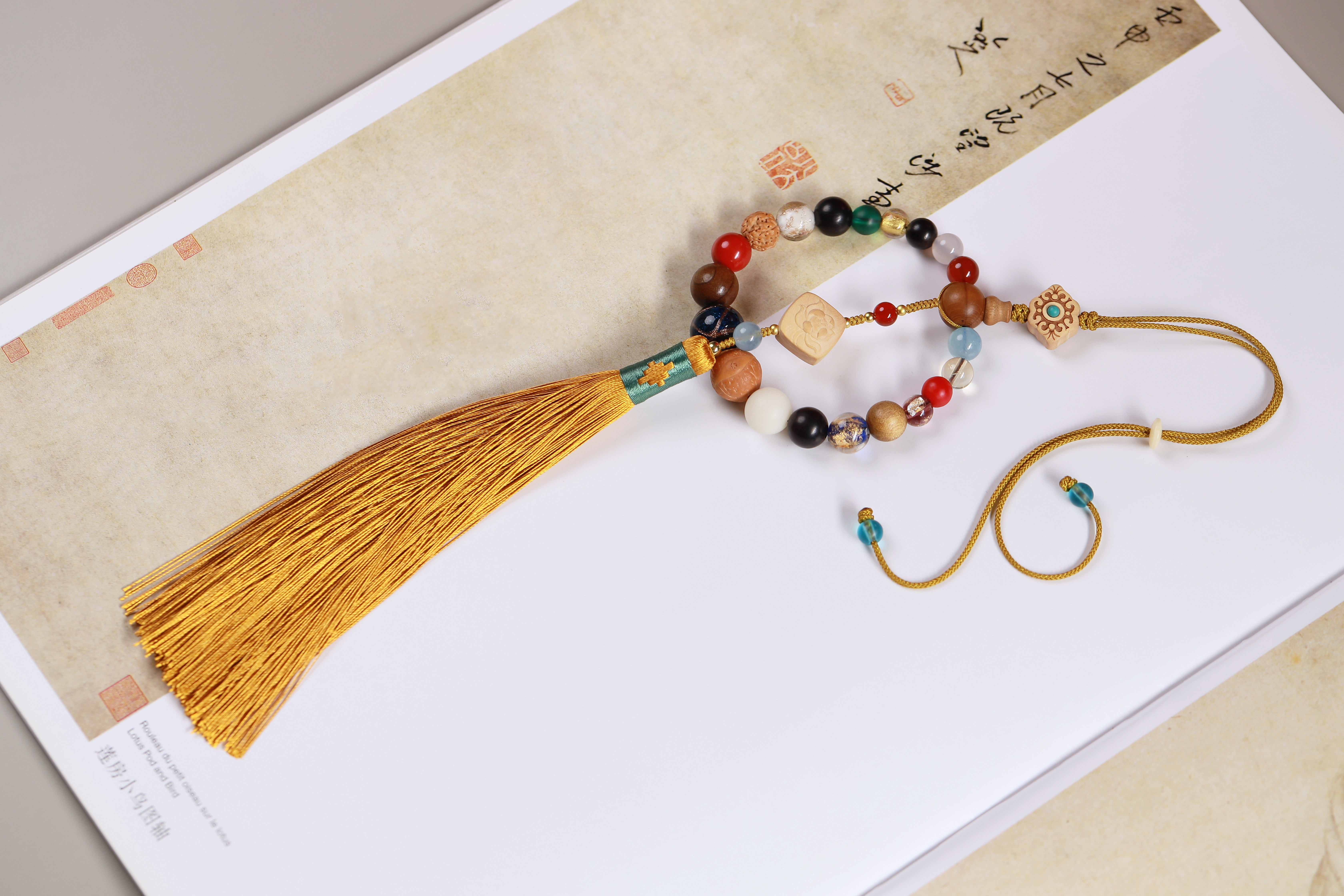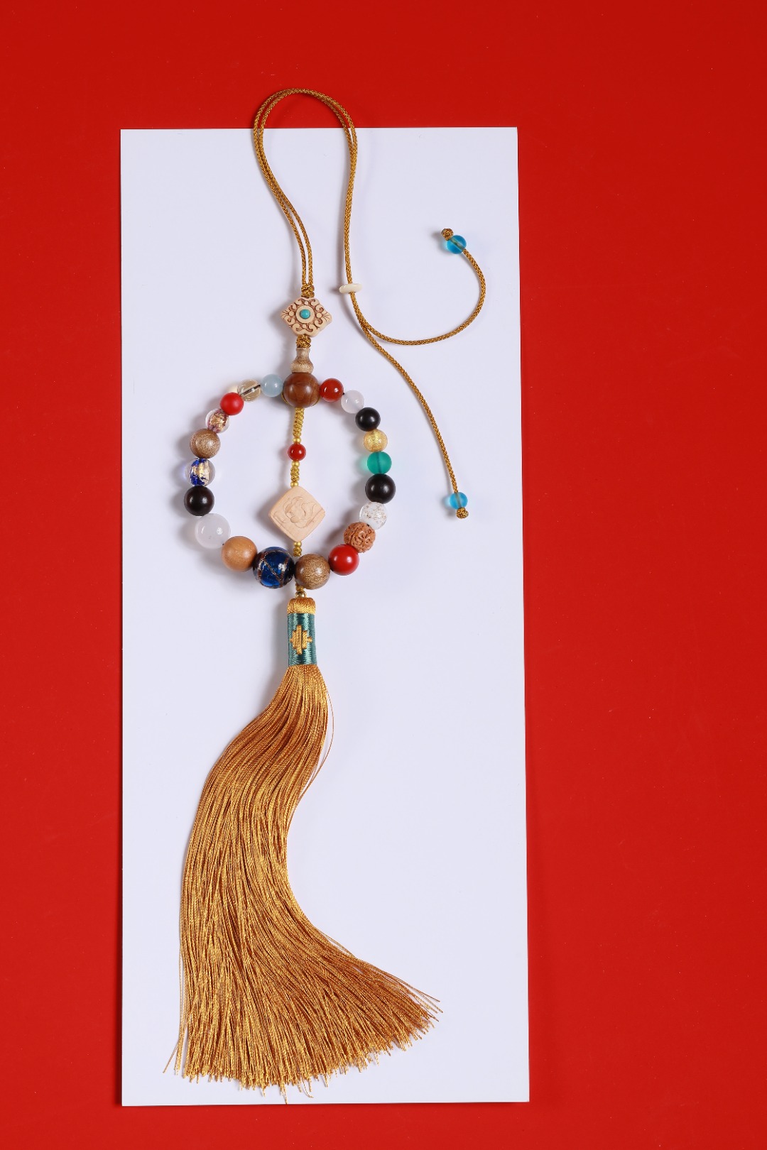 配件:六道木三通/金丝楠佛塔/紫光檀/凤眼菩提/白菩提根/老料金丝楠/红玛瑙/白玛瑙/黄水晶/海蓝宝/红琉璃雪巴/朱砂/金刚菩提/琉璃绿/蓝/黄杨木镶绿松尖角如意/黄杨木方块莲花/象牙果隔片/铜珠/透明香灰珠/香灰珠蓝/丰字单流苏(黄)