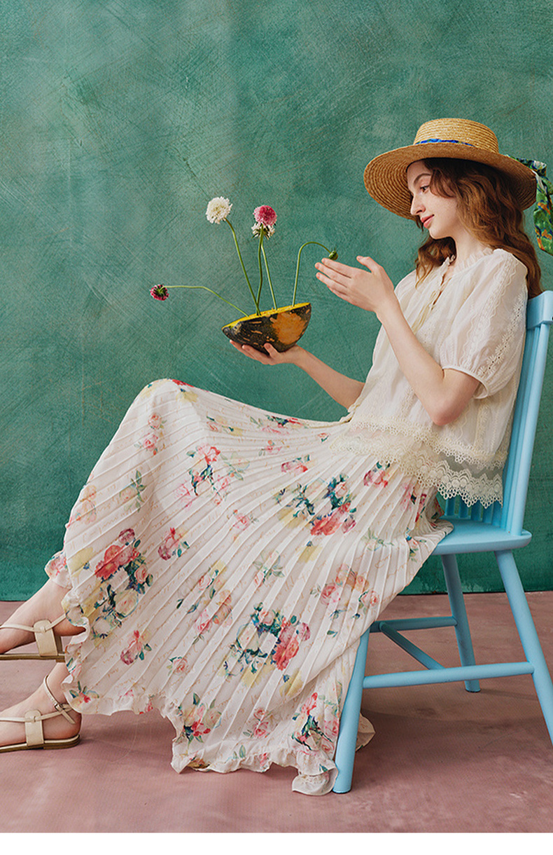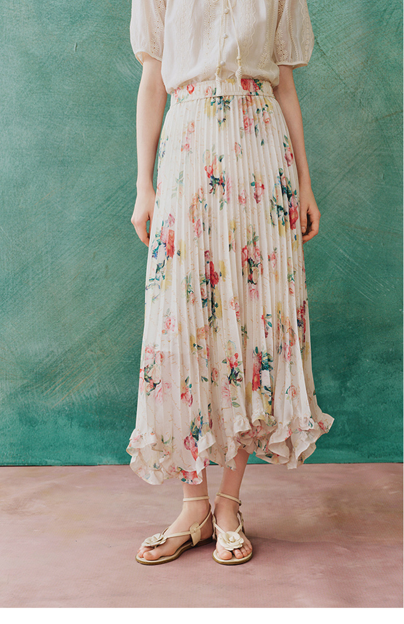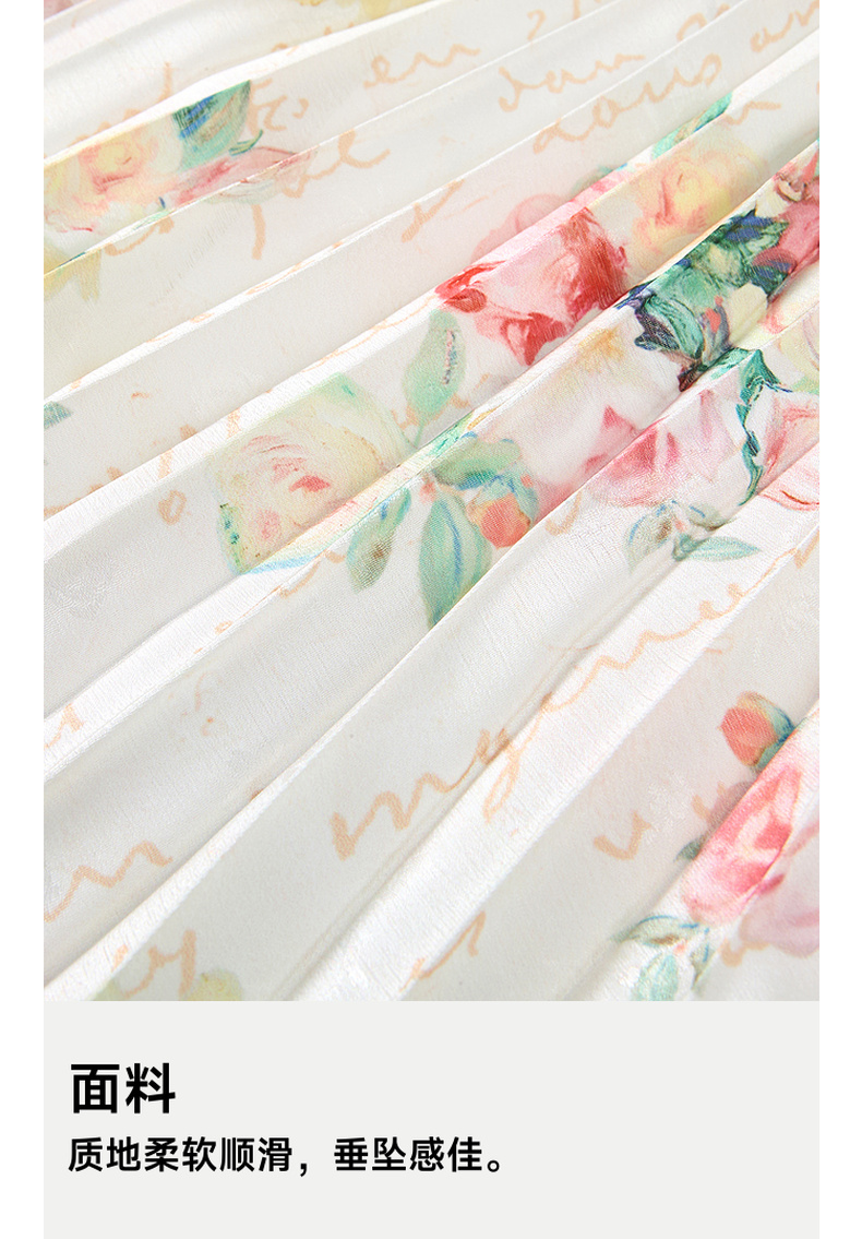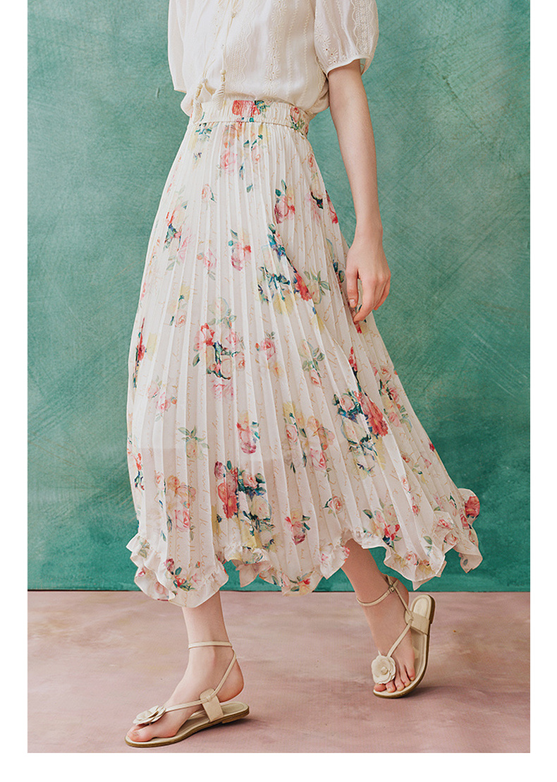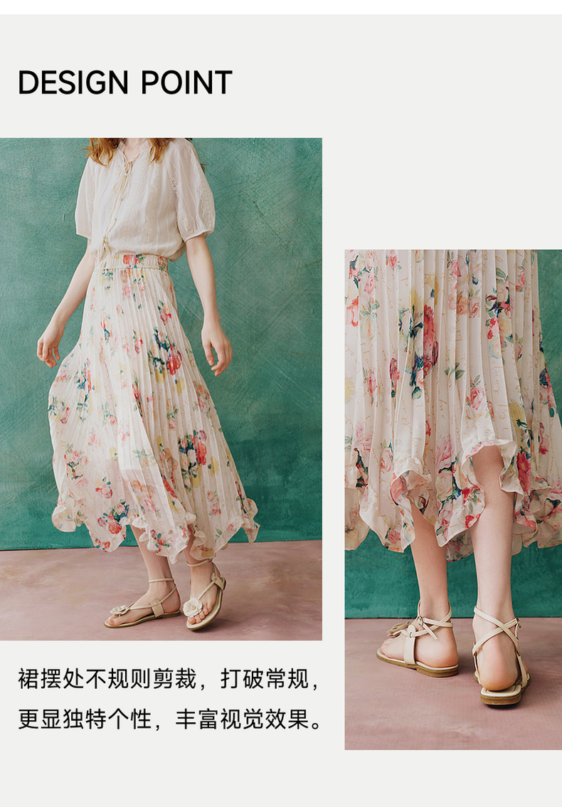 两三事馥香流动2025夏季新款复古荷叶边裙摆印花百褶裙长款半身裙